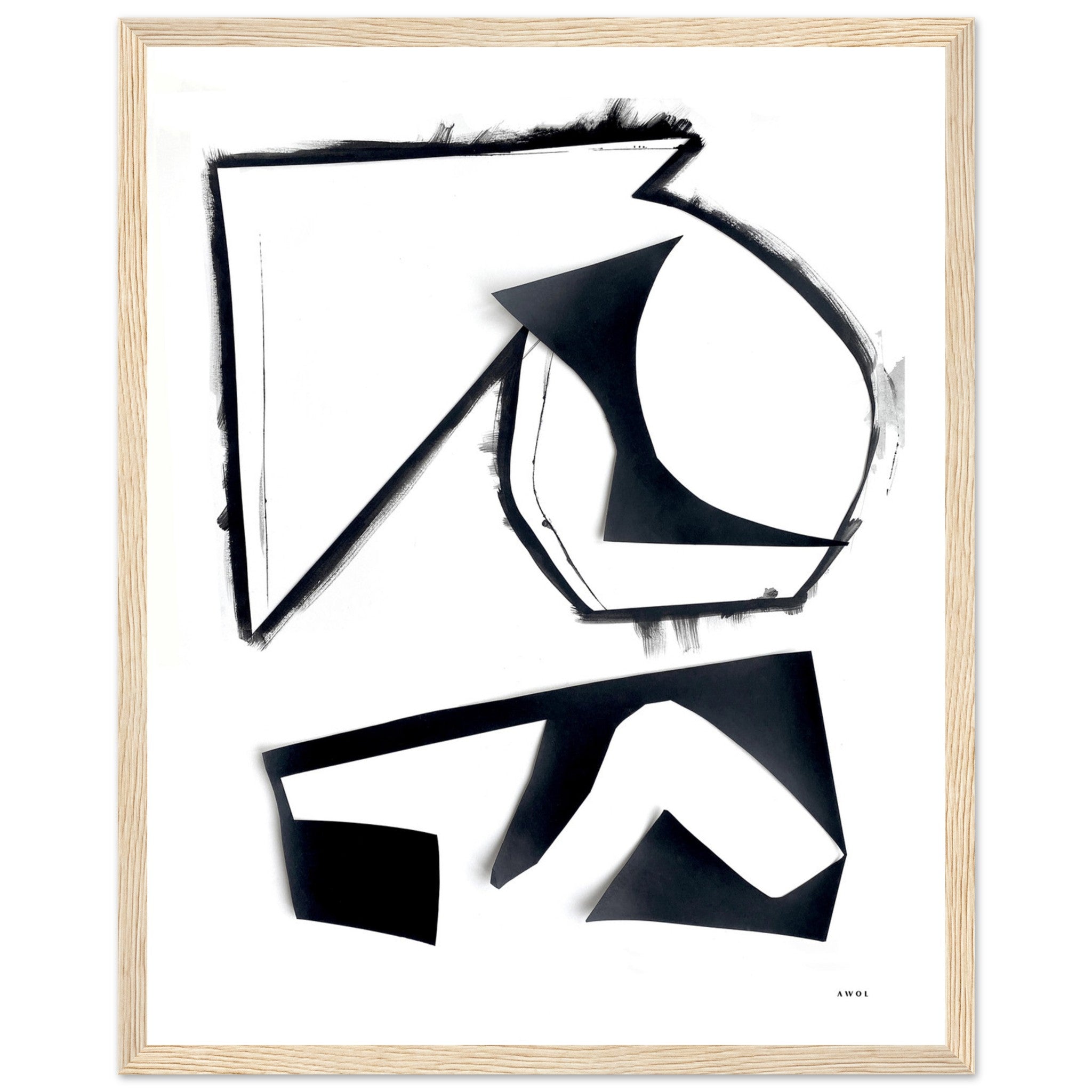 This framed abstract wall art with graphic black and white shapes is a minimalist collage artwork blending landscapes and contemporary art. This black and white abstract art print was inspired by the intricate rock formations shaped by the incredible forces of nature, hiking trails and paths along my most memorable travel explorations: meandering seaside cliffs, hidden routes, and mountain trails tracing the rugged coastlines and rock formations in Spain, the South of France, Italy, Sicily, Corsica and the Mediterranean. This minimalist art print layers organic shapes and textures, adding depth and a tactile quality to this monochrome abstract collage. The wooden frame adds an elegant dimension to your wall decor, inviting touch as well as sight, and it can be combined with other monochrome art prints in this abstract nature-inspired abstract art series, adding a modern aesthetic to any wall, office or home decor.