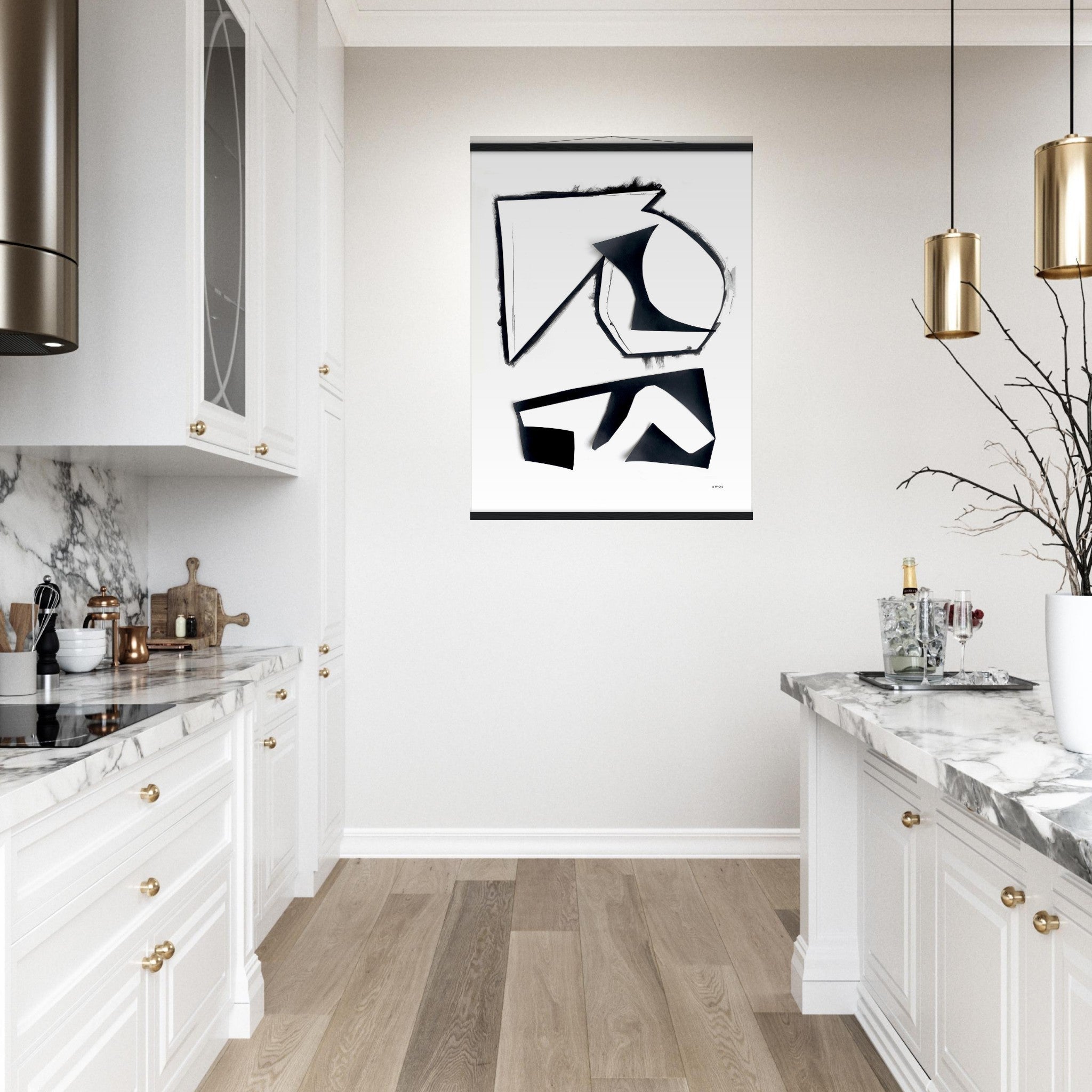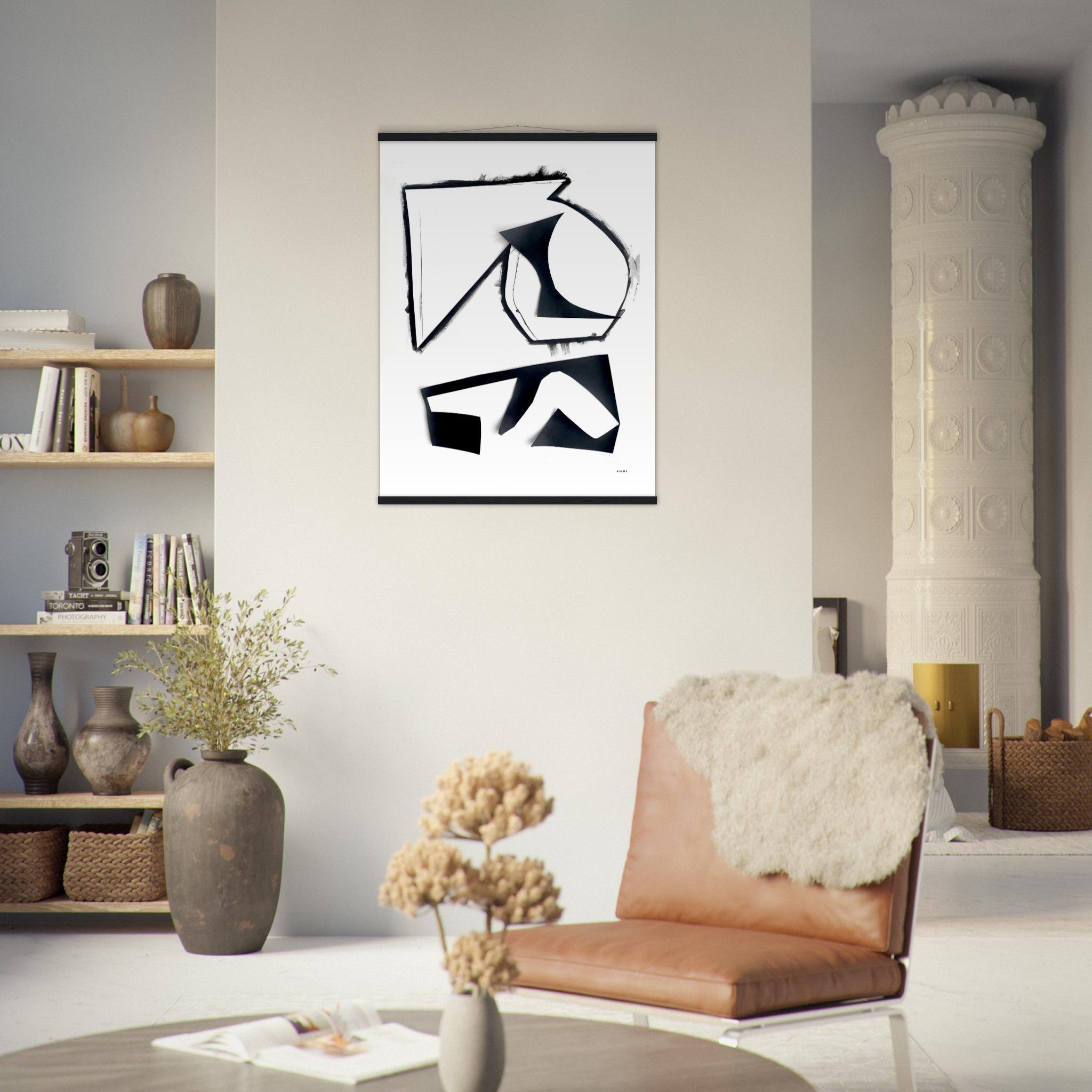 This abstract wall art poster with hanger with graphic black and white shapes is a minimalist art print blending organic shapes, nature-inspired abstract landscapes and contemporary art. This monochrome, abstract art print was inspired by the intricate rock formations shaped by the incredible forces of nature, hiking trails and paths along my most memorable travel explorations: meandering seaside cliffs, hidden routes, and mountain trails tracing the rugged coastlines and rock formations in Spain, the South of France, Italy, Sicily, Corsica and the Mediterranean. This modern abstract wall art layers organic shapes and textures, adding depth and a tactile quality to this monochrome abstract collage. The wooden hanger frame adds an elegant dimension to your wall decor, inviting touch as well as sight, and it can be combined with other monochrome art prints in this abstract nature-inspired abstract art series, adding a modern aesthetic to any wall, office or home decor.