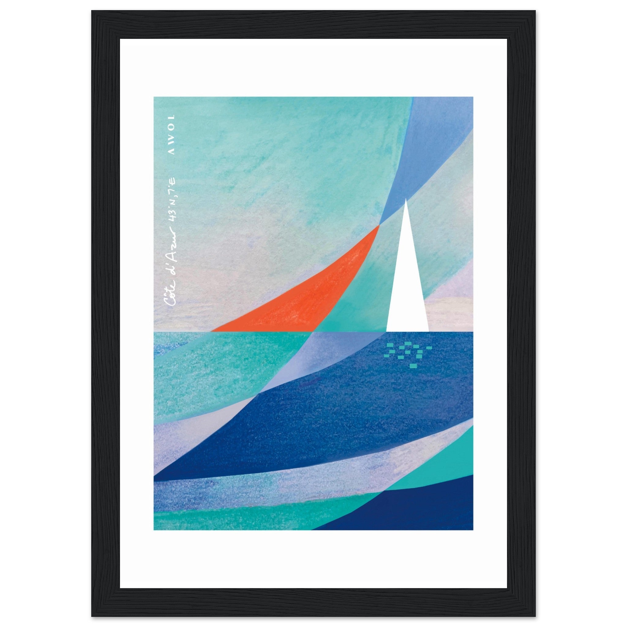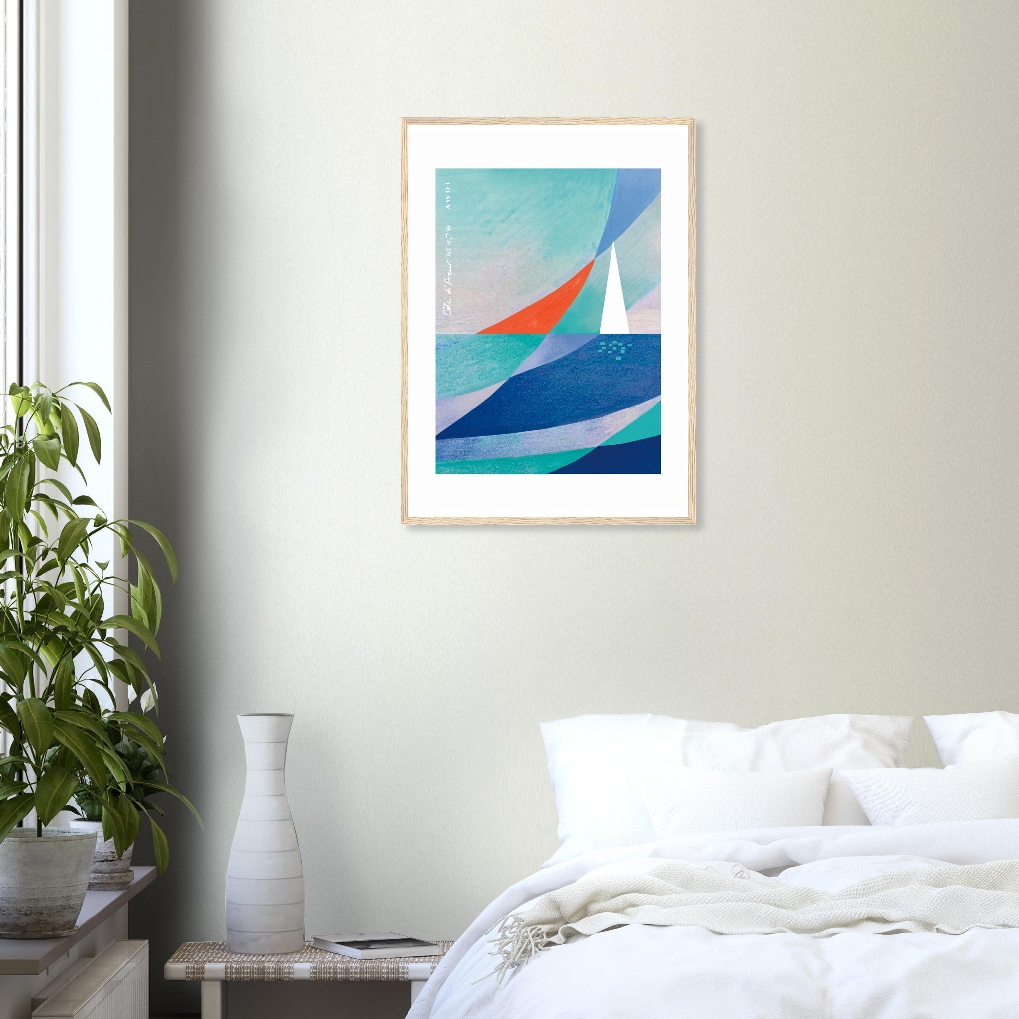 This blue wall art print portrays a minimalist sailboat sailing in the wind, floating on an abstract sea – a blue geometric pattern made of organic, graphic shapes – evoking relaxing sea breezes, waves and water reflections on the Mediterranean. In the background of this framed travel poster, the sunrise is abstracted into a bright orange accent colour rising from the waves as a single geometric shape moved by the wind. This abstract wall art is a nautical abstraction inspired by beautiful destinations in the Mediterranean region: the South of France, Italy, Greece, Spain, Turkey, Corsica and Sicily – where the azure blue skies, crisp horizons, balmy breezes and picturesque sailboats feed your heart with tranquility, relaxation and beauty. This abstract framed wall art was originally drawn and painted by hand using a mix of fine arts techniques and materials, and digitally transferred into digital format – allowing the art work to be reproduced into this contemporary art print. This Mediterranean travel poster is ready to hang; an escapist wall decor accent that brings a nautical art style and relaxing vacation vibes to any home decor – bohemian, modern, minimalist or classic.