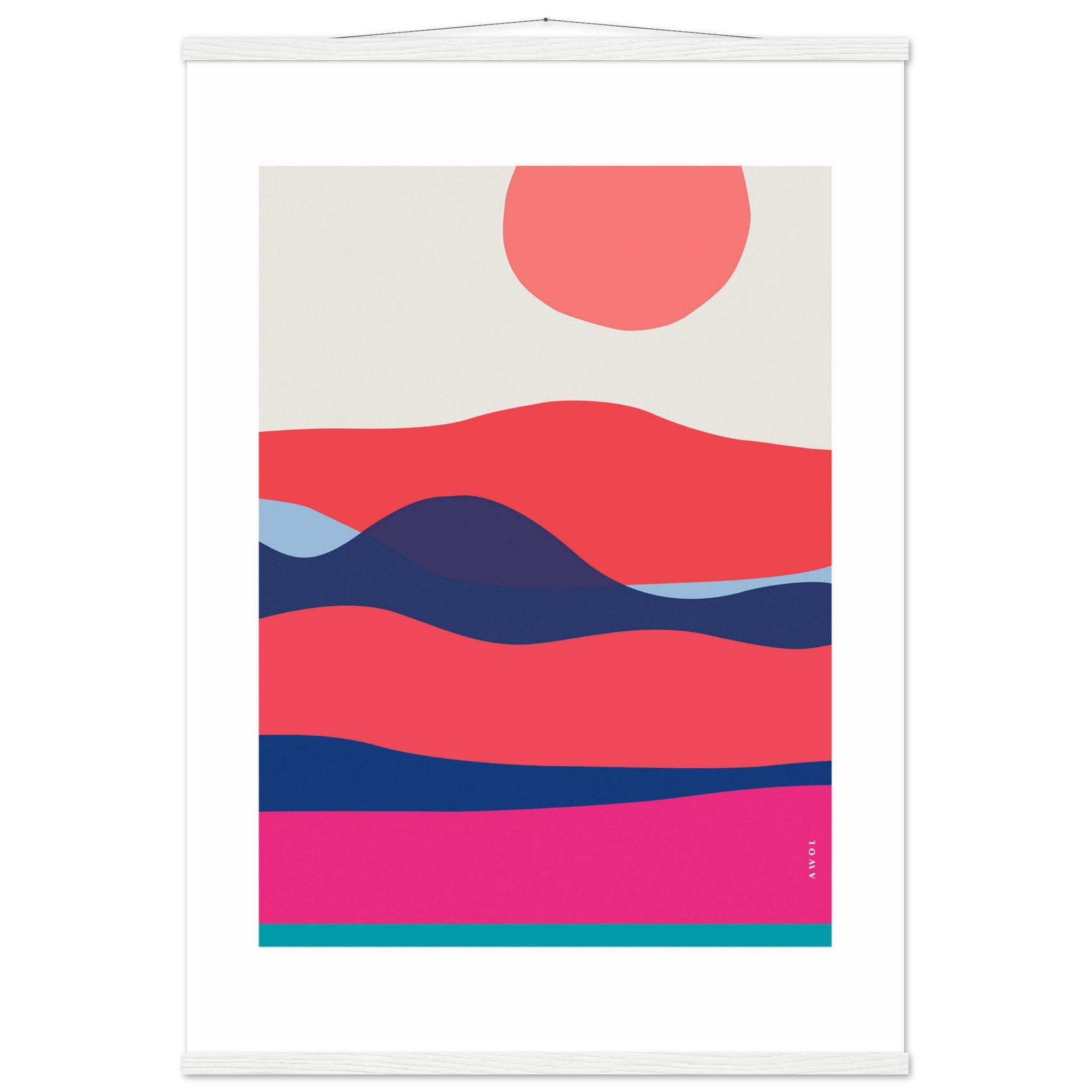Inspired by my sailing misadventures in the South of France, the Canary islands and some stormy Mediterranean sea crossings into Morocco and Corsica, this colourful sea art print is a visual celebration of tranquility and natural beauty, but also an ode to the power of the sea and its changing moods. The organic, modern design and contemporary art style of this art print captures the water’s movement of ever-changing waves and the radiant sun reflections that paint the seascape during these magical maritime moments. The relaxing modern art aesthetic of this colourful print makes it a versatile art work for any home decor or office space, bringing the relaxing ebb and flow of the sea to your daily living spaces. This abstract wall poster conveys the beauty of morning sunrises and evening sunsets as seen from sailing in the middle of the sea. This graphic poster print is a minimalist wall art print with a wooden hanger and bright colours: orange, pink, red, dark blue and turquoise tones blend in a bold and abstract sea pattern with organic, wavy lines and a warm orange sun. Inspired by nautical landscapes and travel adventures at sea, this framed poster transports you to peaceful moments of dawn over a soothing, wavy sea.