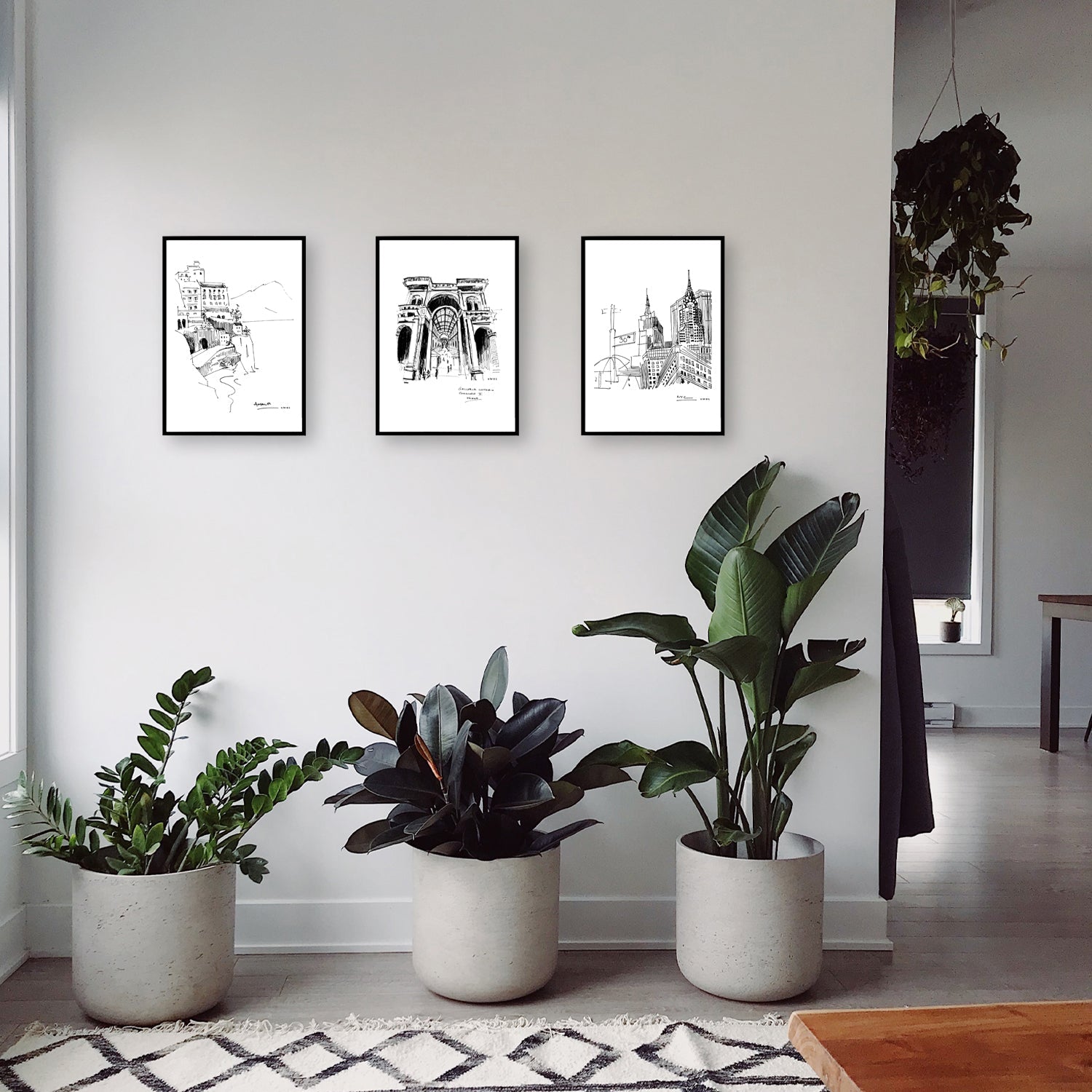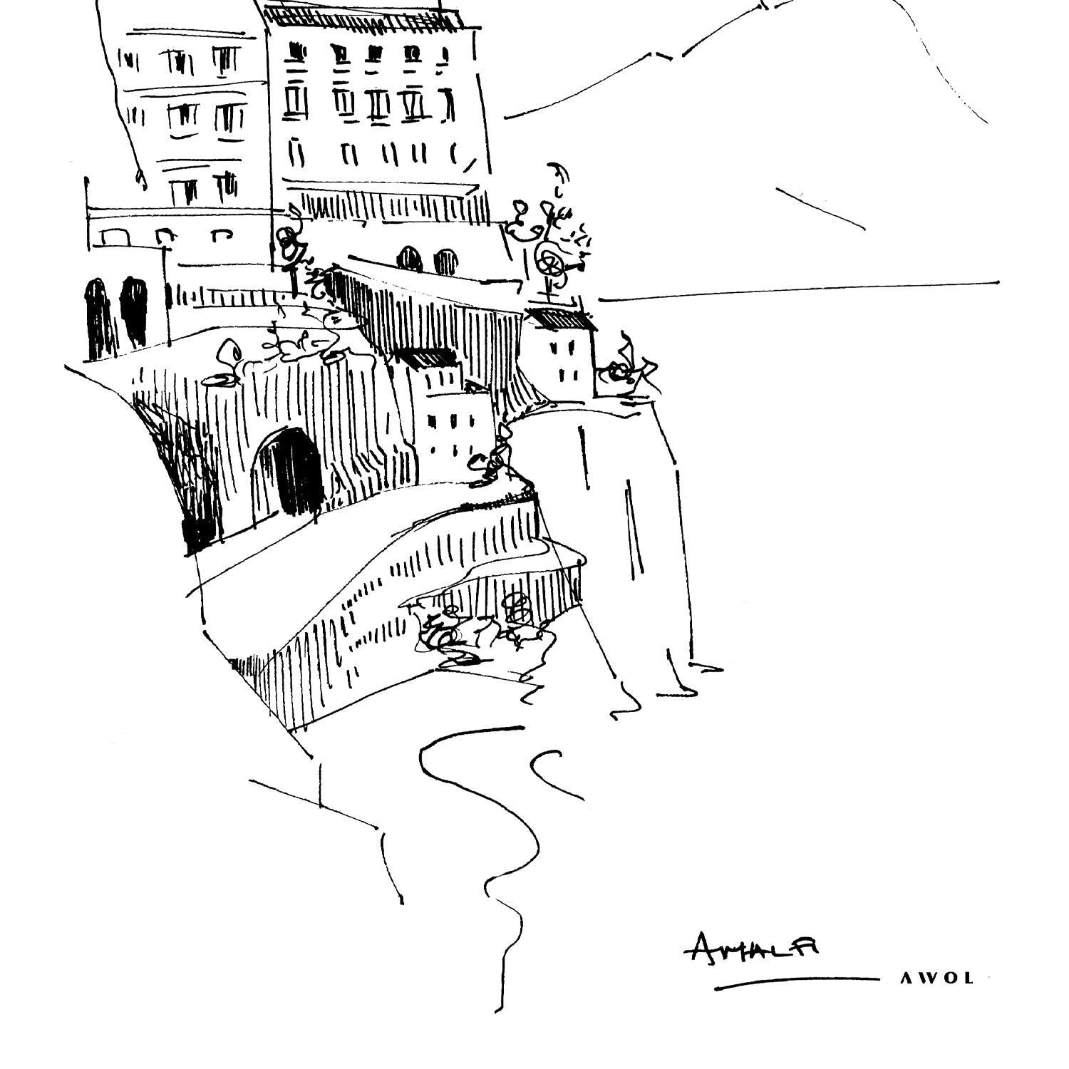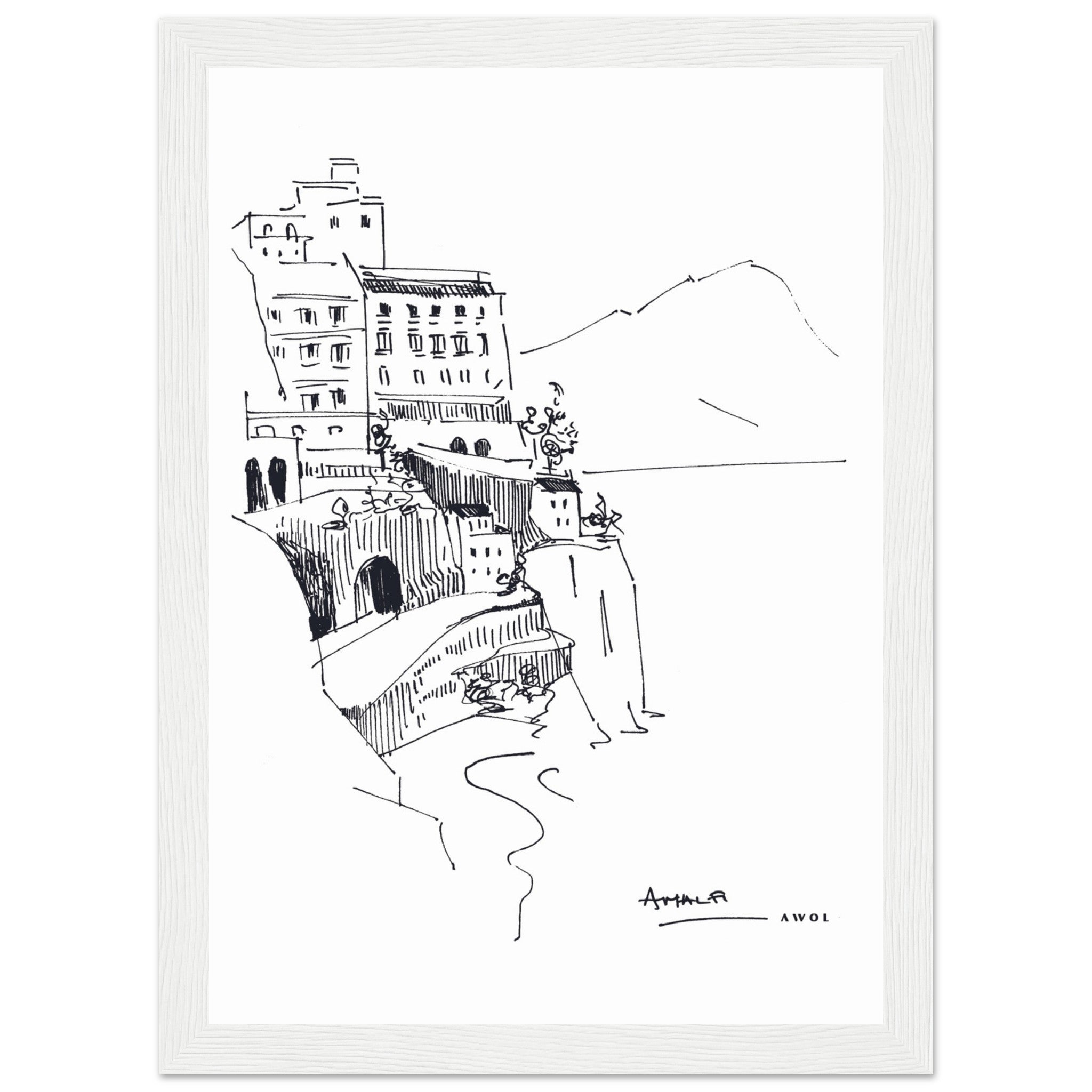 This black and white Amalfi Coast wall art print transports you to the unparalleled beauty of this world-renowned Italian travel destination. This monochrome wall art print captures the luxurious villas, majestic cliffs and small Italian towns perched on the vertiginous hillsides overlooking the iconic Italian seaside villages of Atrani, Amalfi, Sorrento, Ravello, Positano and Praiano, scattered along the Mediterranean sea, in one of the world’s most beautiful coastal landscapes. Hand-drawn in a sketchy yet intricate style, each graphic line contributes to the rich tapestry of the Amalfi Coast’s breathtaking panorama. This Italy travel poster is a visual journey to feed your wanderlust, inviting you to explore the picturesque charm of this iconic Italian region, known for its incredible views and timeless beauty. Bring this postcard perfect Italy art scenery home to your wall art collection, and add a timeless and contemporary travel art accent to your home decor with this framed travel poster.