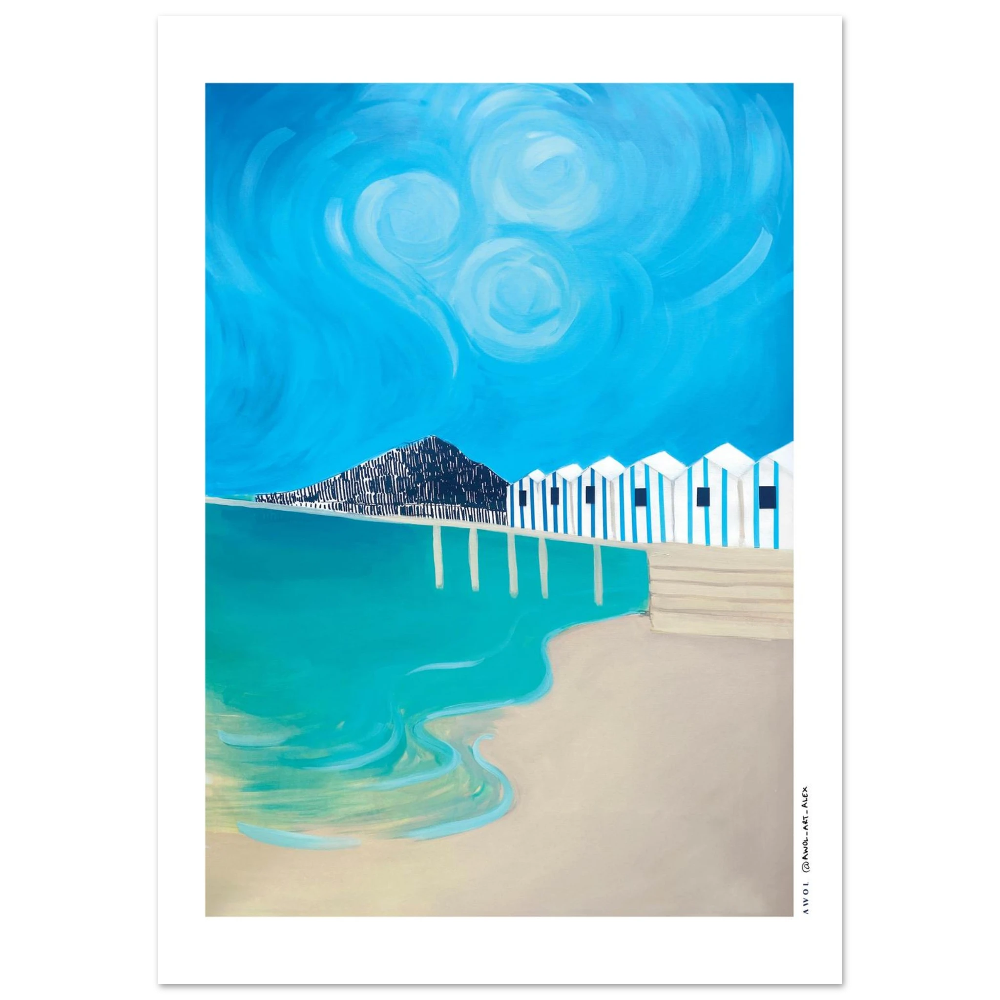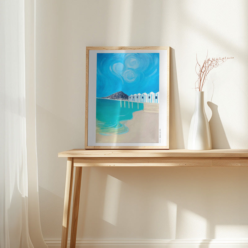 Escape to the coastlines of Southern Italy with this vibrant blue Amalfi Coast travel poster, inspired by my journeys through Capri, Naples, and the stunning Mediterranean seaside landscapes of the Costa Amalfitana. Featuring a fresh, sun infused colour palette of vivid blues, sandy neutral tones, and graphic black and white lines, this modern Italy travel poster evokes the beachy, relaxing atmosphere of Italy’s iconic coast. Rendered in a modern graphic style with clean, minimalist lines and expressive brushwork of sky, beach and sea, this destination art print blends coastal minimalism with vibrant Mediterranean vacation vibes. Between a dynamic sky and a calm turquoise sea is the Vesuvius mountain volcano, overlooking classic striped beach cabanas. All elements come together in a beachy, contemporary seaside art scene. This Italy inspired wall art is perfect for adding a splash of beach infused with a vacation mood and Italian landscape to any room. It comes in poster format or in a wooden frame of various colours, ready to hang in your living room, bedroom, common areas or vacation homes. This Italy poster print is ideal for those who love travel, contemporary art, colourful modern wall decor, Italian landscape prints, or minimalist coastal design. Also great for: home gallery walls, travel-themed interiors, modern home decor, or gifting to art lovers and travellers. Bring warmth, movement, and a Mediterranean spirit to your space with this Italy-inspired wall art print.