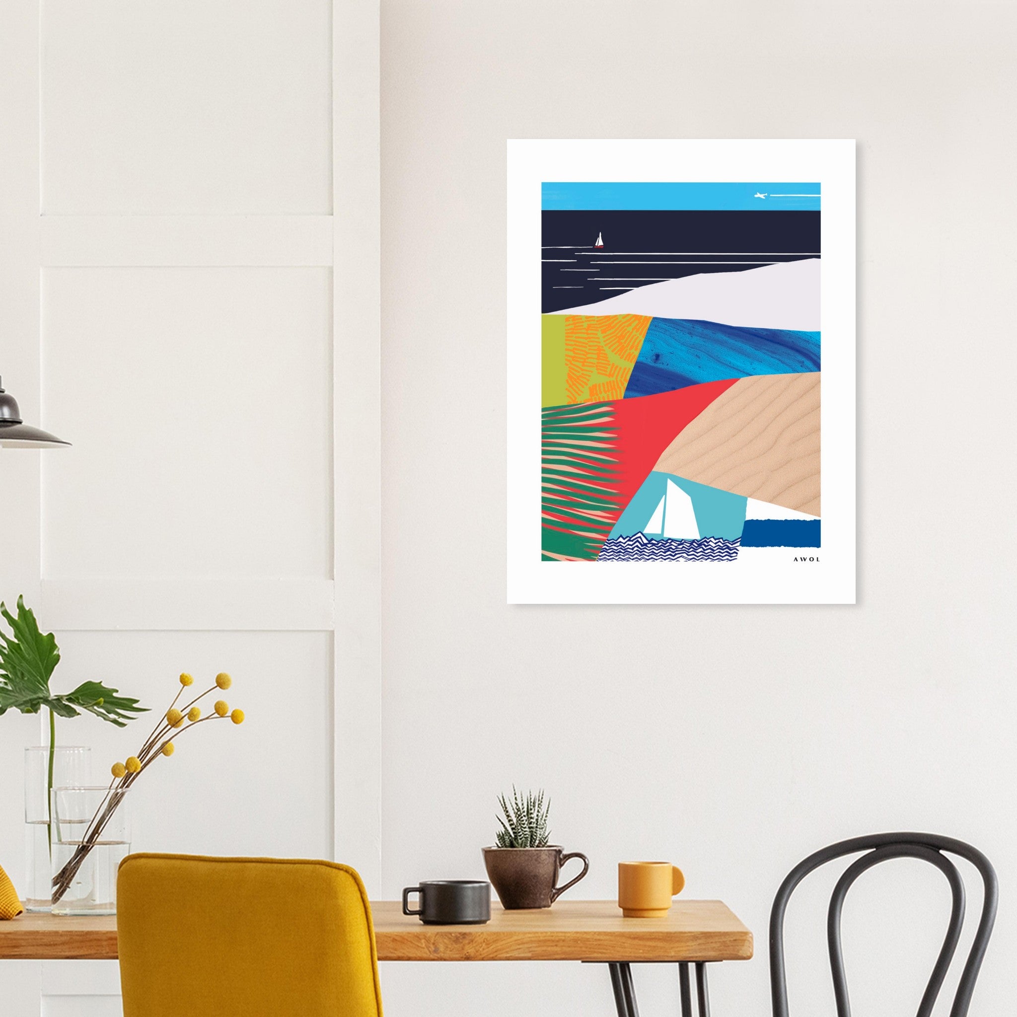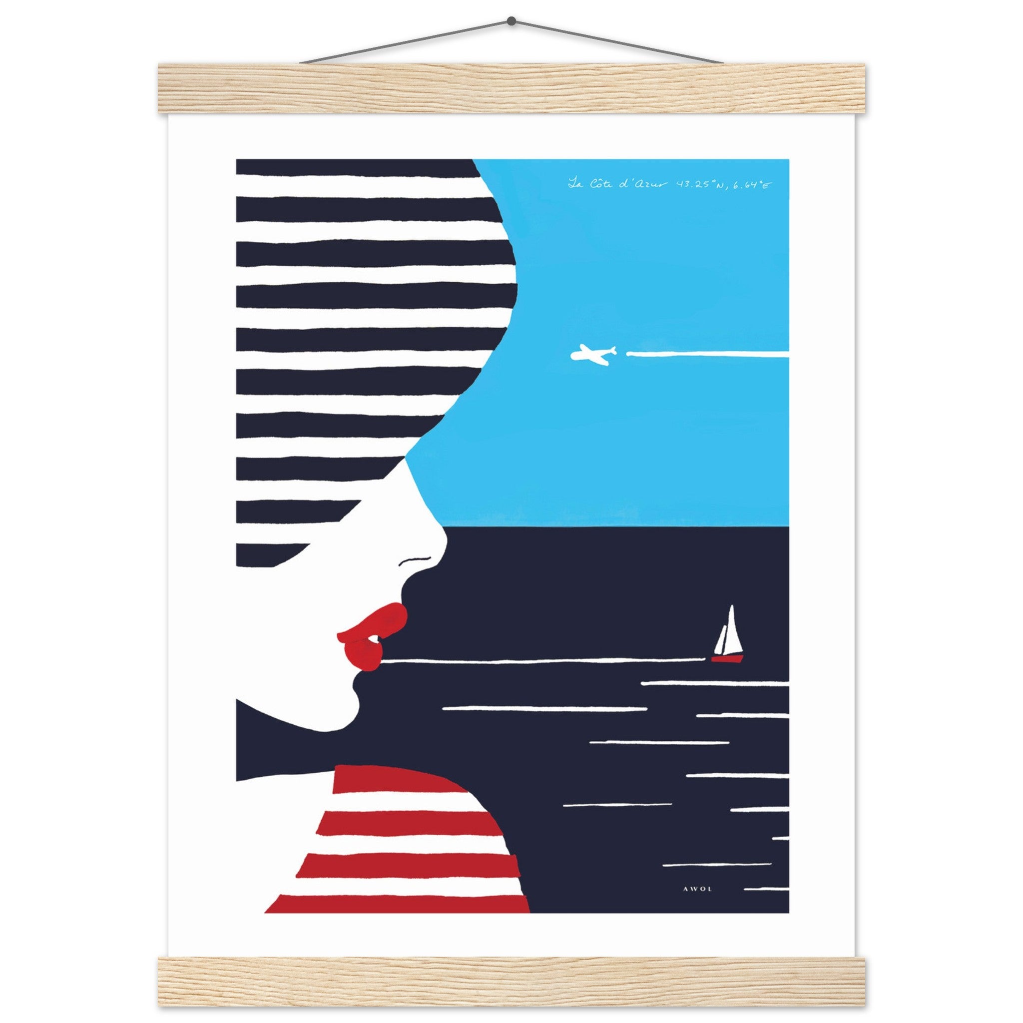 This colourful Mediterranean wall art is a graphic art portrait of a glamorous woman in profile, wearing red lipstick, a stylish French beret, and chic nautical stripes as she looks towards the azure Mediterranean sea; a sailboat and an airplane travel by in the summer breeze. This blue, red, white and black beach wall art print is a colourful wall poster blending contemporary illustration, bold design and a modern Mediterranean design aesthetic in a travel poster that is ready to hang, elevating your wall decor with this destination art print of the French Riviera, in the South of France. Capturing the carefree, relaxing vacation mood of the seaside, the rich azure blues and vivid colours of the sunshine and landscape, this modern travel art print is a visual celebration of the famous French travel destination, the Côte d’Azur. This travel wall art is a France souvenir, a cool gift for France lovers, and a large, colourful poster print invoking happy vibes and wanderlust to your home decor. The bold and dynamic design adds a bold wall decor accent art, making it a versatile and chic addition to any space, igniting a sense of stylish Mediterranean living to your home decor.