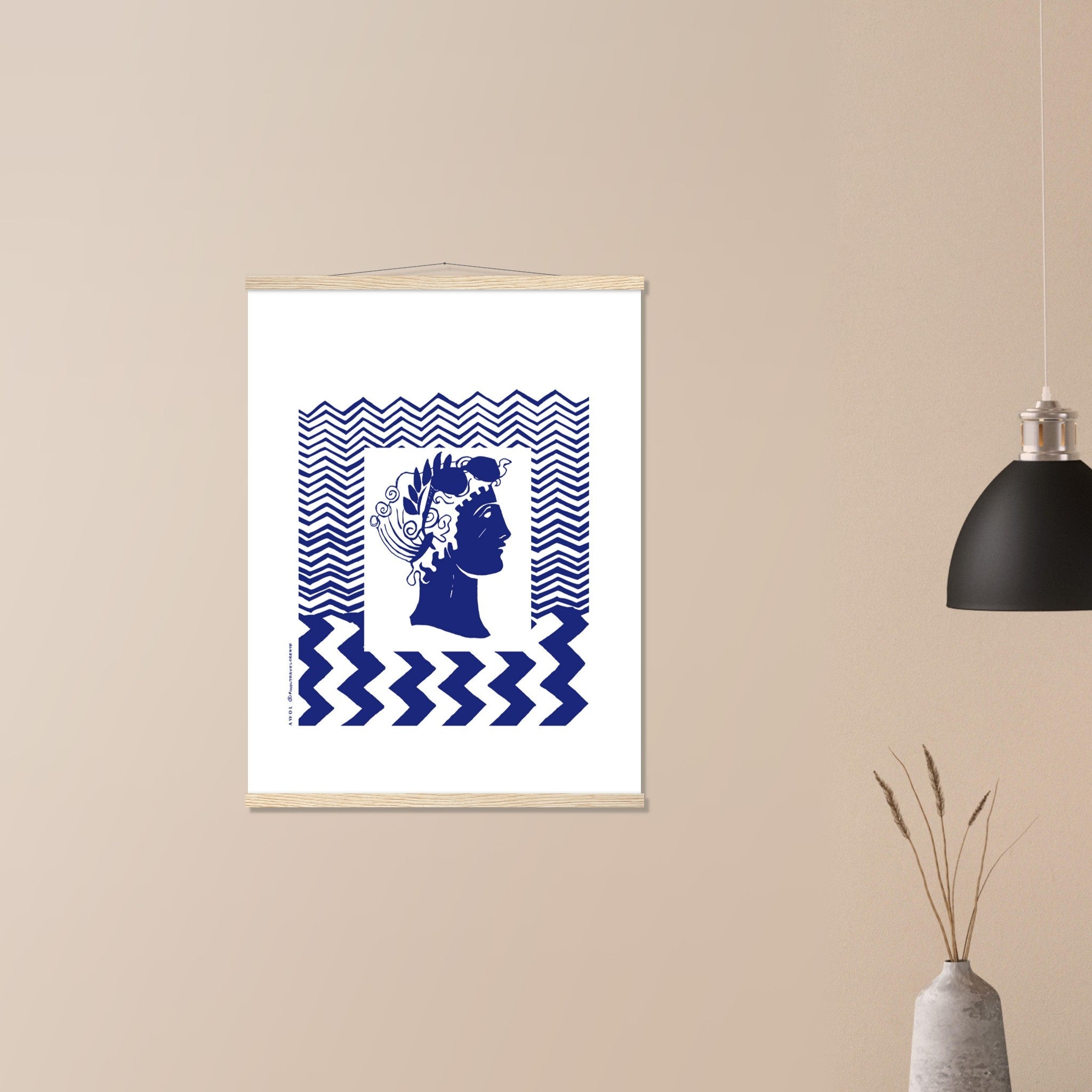 This blue travel poster print with a wooden hanger is a playful modern art interpretation of the Greek god of beauty and desire, Adonis. The portrait of a handsome young man on a beach, wearing sunglasses, is looking at a graphic blue and white pattern representing the Mediterranean sea. This nautical seaside art work is a large abstract wall art print in a minimalist art style, mixing a Greek art aesthetic with a Mediterranean design, culminating in a minimalist art print that is ready to hang. This blue wall art was inspired by vacations to Italy, Sardinia, Sicily, Corsica, Spain and the South of France, and makes a cool wall poster for any home decor style. Perfect for those seeking travel art, boho or modern wall decor prints, a fun travel poster print for their living room, kitchen or bedroom, or a travel souvenir to gift to your friends who love art, design and travel.