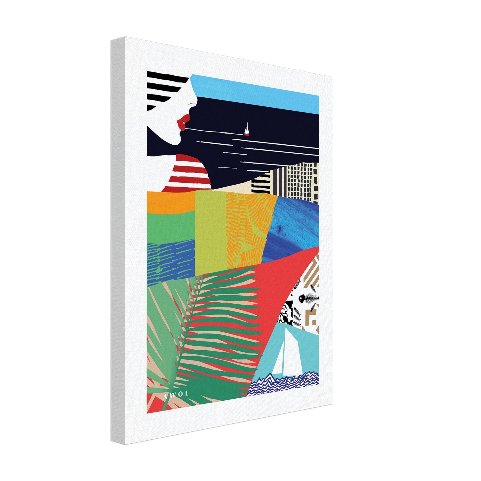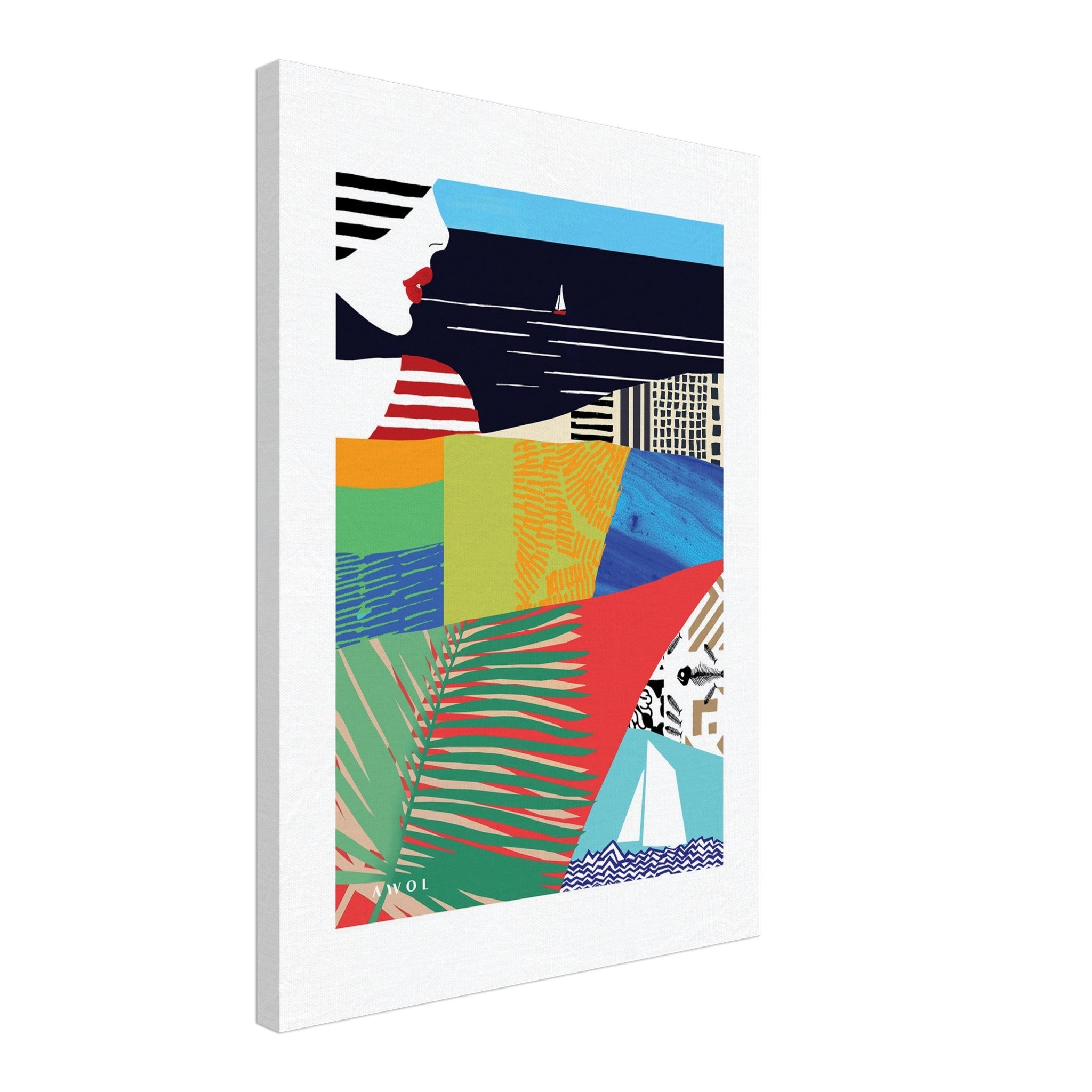 This colourful wall canvas art is an abstract canvas wall art in bright colours and bold graphic patterns of abstract shapes within which lie tropical plants, palm trees and the profile of a beautiful woman looking at a sailboat moving beneath an azure blue sky on a deep blue sea, sailing past beaches, blue lagoons and coastal seaside landscapes. This beach wall art print is inspired by relaxing vacations, seaside bliss, island vibes and travel around the Mediterranean, Caribbean, and tropical destinations in Asia and South America. This large abstract wall art is a modern travel print that evokes happy vacation vibes and beautiful places filled with sunshine. The bright hues of warm reds, blues, white and earth tones of this wall art decor print evoke the sun-kissed warmth and summer vibes of coastal beach destinations. Palm trees, tropical plants, sandy beaches blend with sailboats, beach stripes and Mediterranean-inspired patterns. This tropical, beachy artwork will infuse your wall decor with wanderlust, good energy, and summer vibes all year round. Whether you’re searching for travel decor for your living room, office, bedroom, kitchen, or gift ideas for people who love to travel, this colourful art print brings a burst of good vibes to your home decor in a contemporary and colourful art aesthetic.