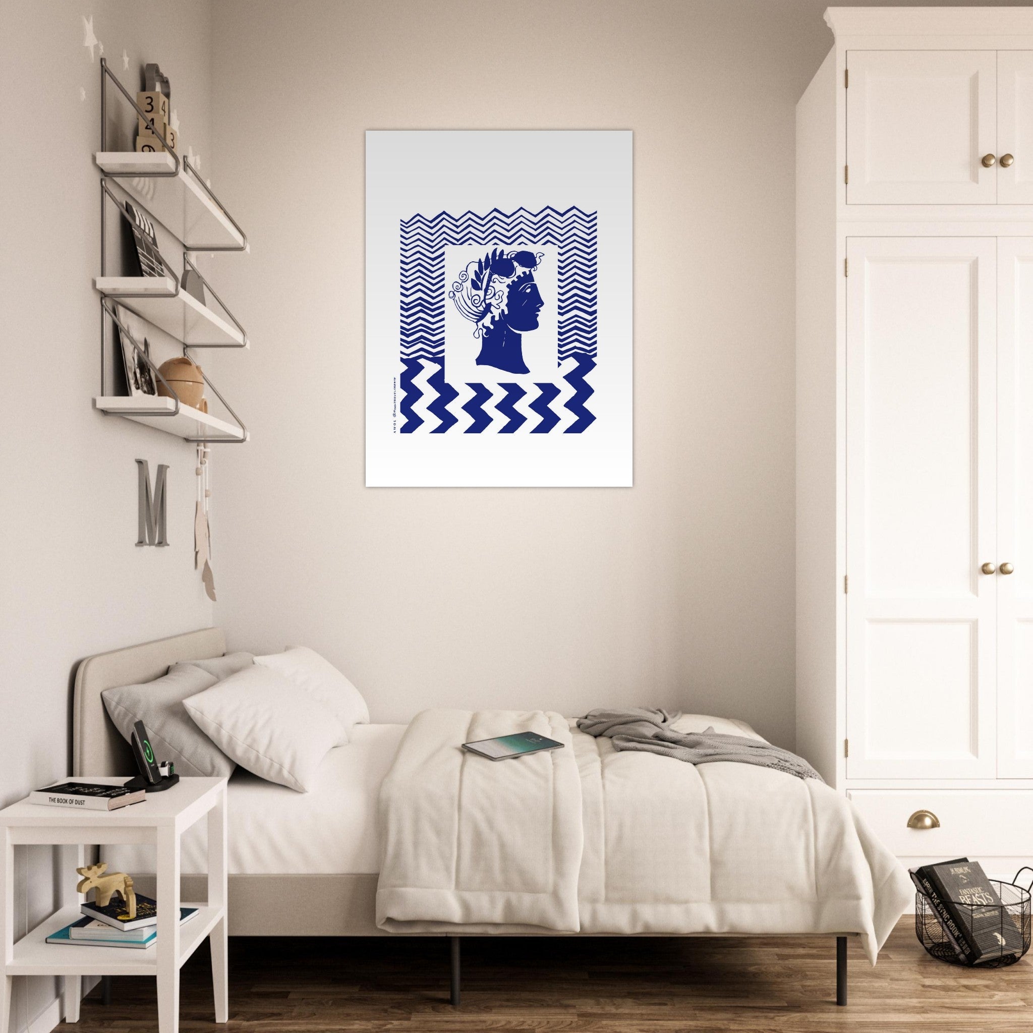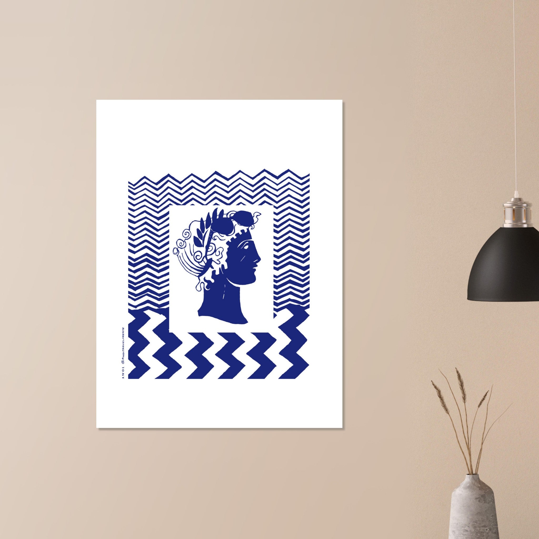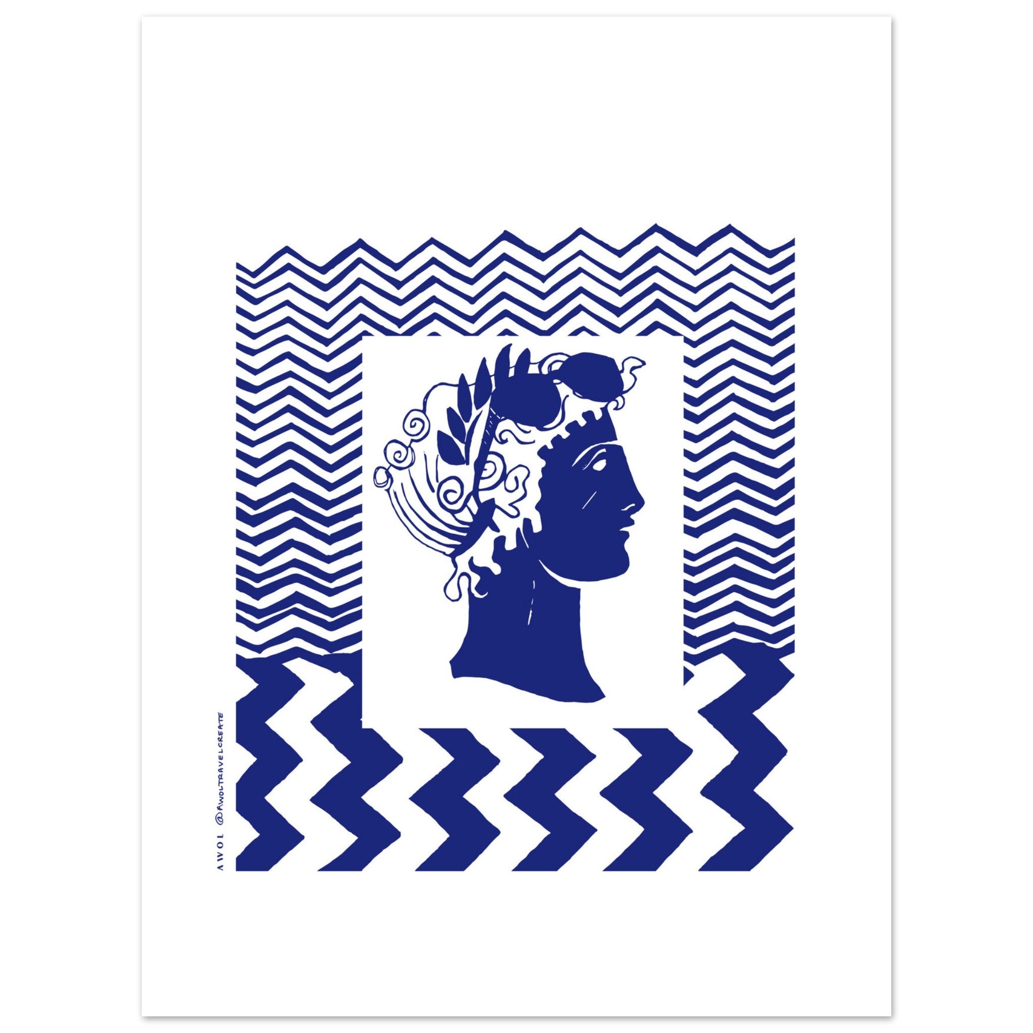 In this contemporary blue and white wall art print inspired by the Greek god Adonis (the god of beauty and desire), the portrait of a handsome young man on the beach looking at an abstract sea wearing sunglasses is surrounded by a graphic blue abstract art pattern. This travel poster is a modern nautical poster print in a minimalist art style, blending a Greece wall art aesthetic with a Mediterranean colour palette and landscape art inspired by Italy, Sardinia, Sicily, Corsica, Spain and the South of France. This beach wall art print is a fun home decor artwork merging a modern style with a minimalist aesthetic. Perfect for those seeking Greek inspired wall art, nautical or boho wall decor, or simply a fun artful beach poster to add some travel art vibes and brighten up any room. It also makes a cool gift for your boyfriend or friends who love art, travel and modern art.