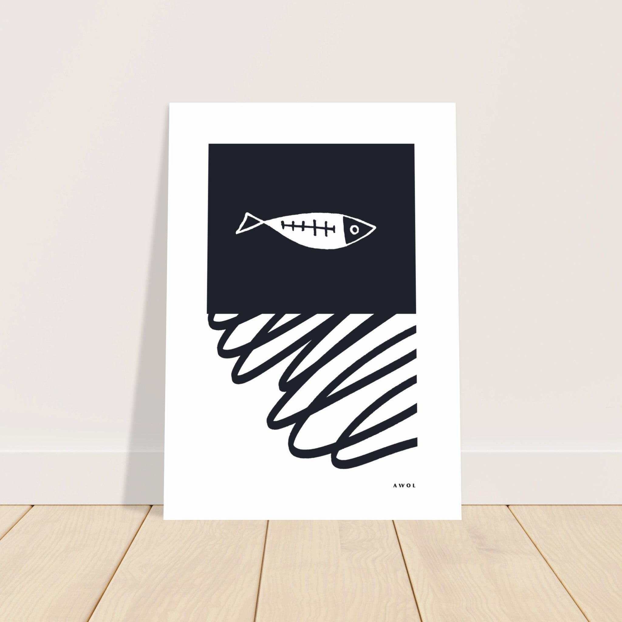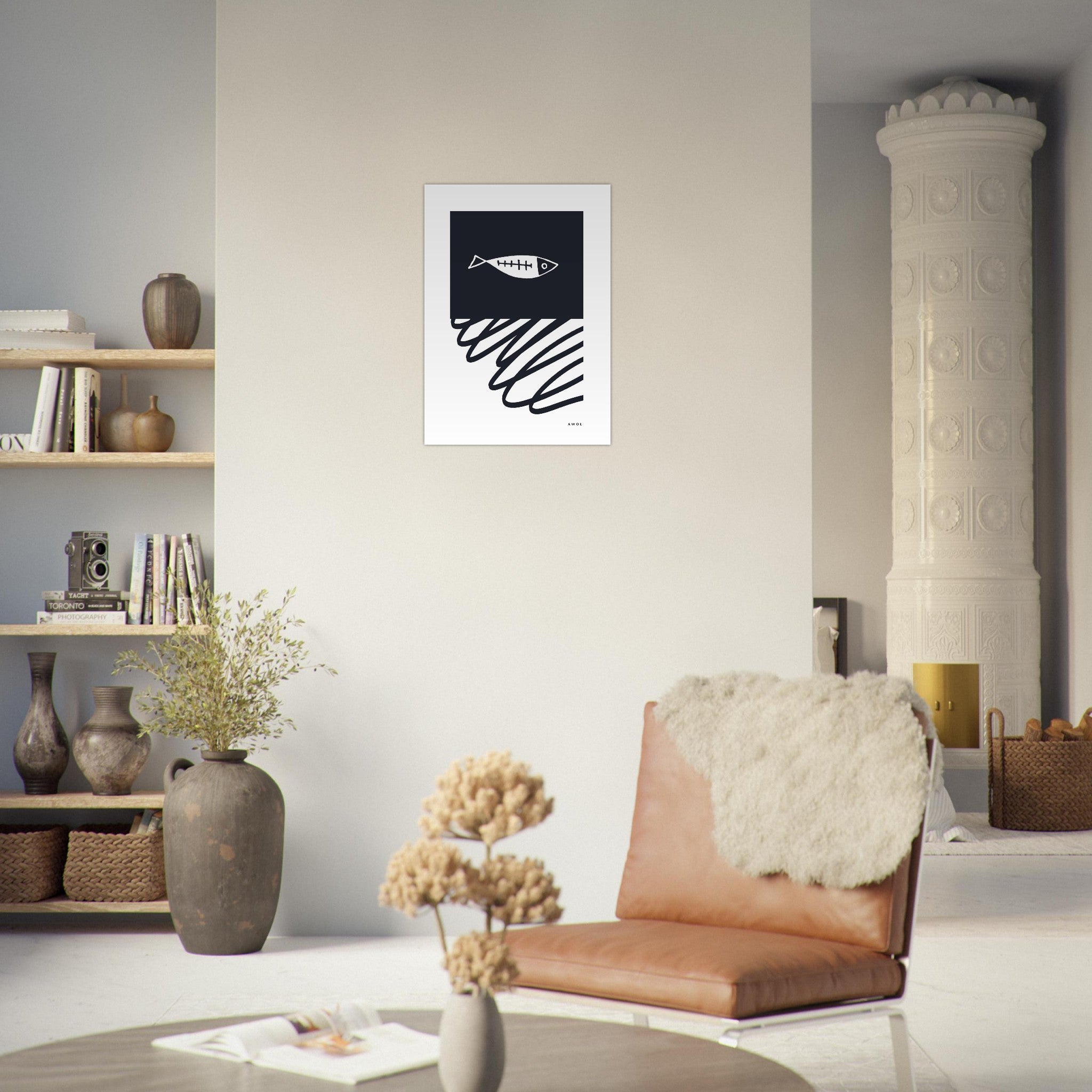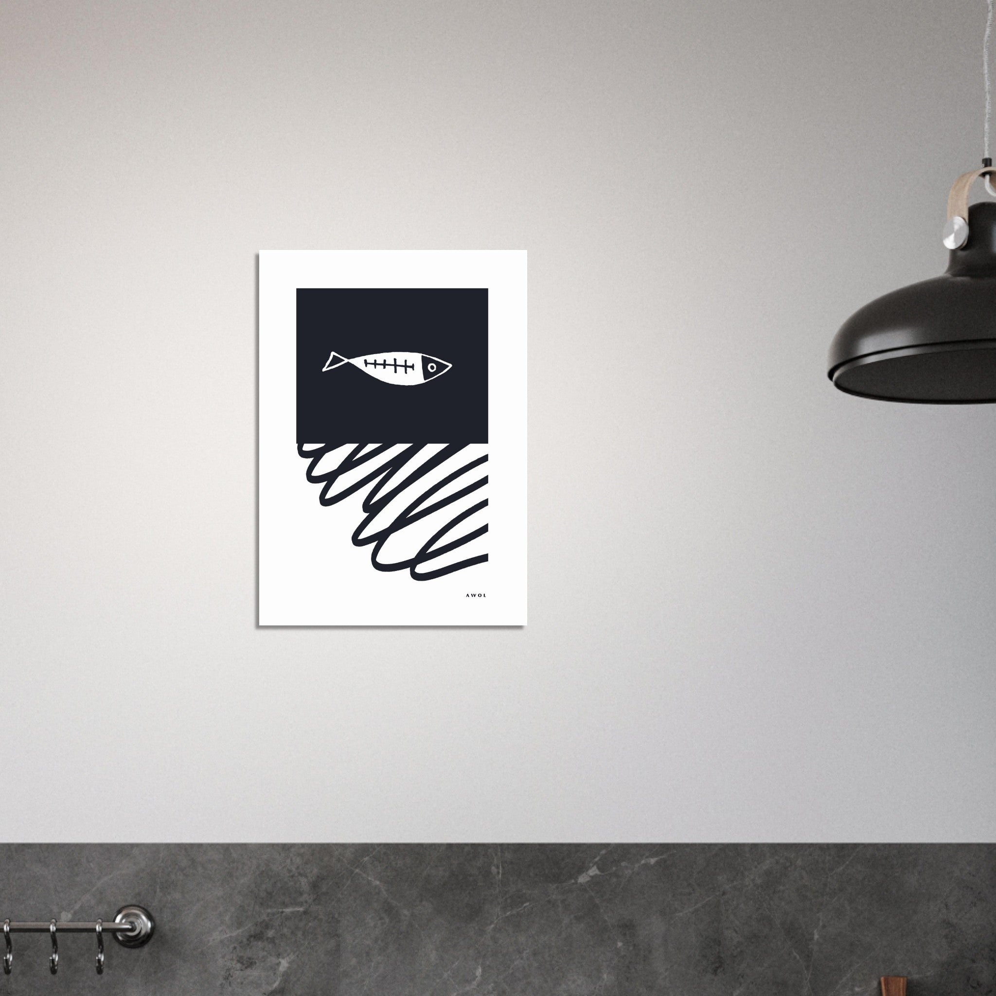 This minimalist wall art illustrates a fish swimming above an abstract line artwork made of a graphic, swirling line pattern. Blending a Scandinavian design style, minimalist lines and graphic shapes, this Nordic-inspired fish illustration evokes speed, movement and the force of an abstract sea current. Hand-drawn using a continuous line illustration style, the Nordic design aesthetic comes across with this bold, black and white art print. The black and white poster print adds a modern wall accent art and timeless elegance to any space, making it a fun and bold addition to your wall decor. Whether you’re a fishing person, you love the sea, or are someone seeking a touch of simple Scandinavian wall art for your home decor, this minimalist art print will add a unique fusion of graphic simplicity and originality to your living room, kitchen decor, restaurant art collection, or office space.