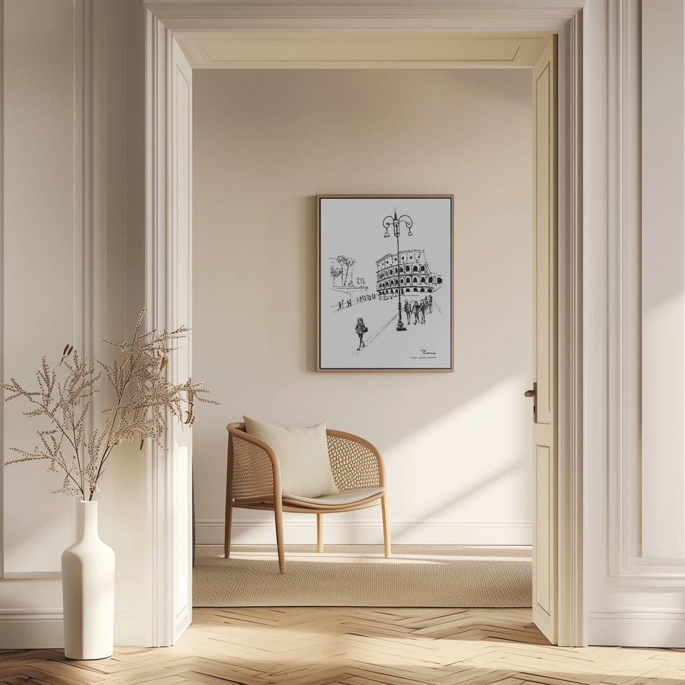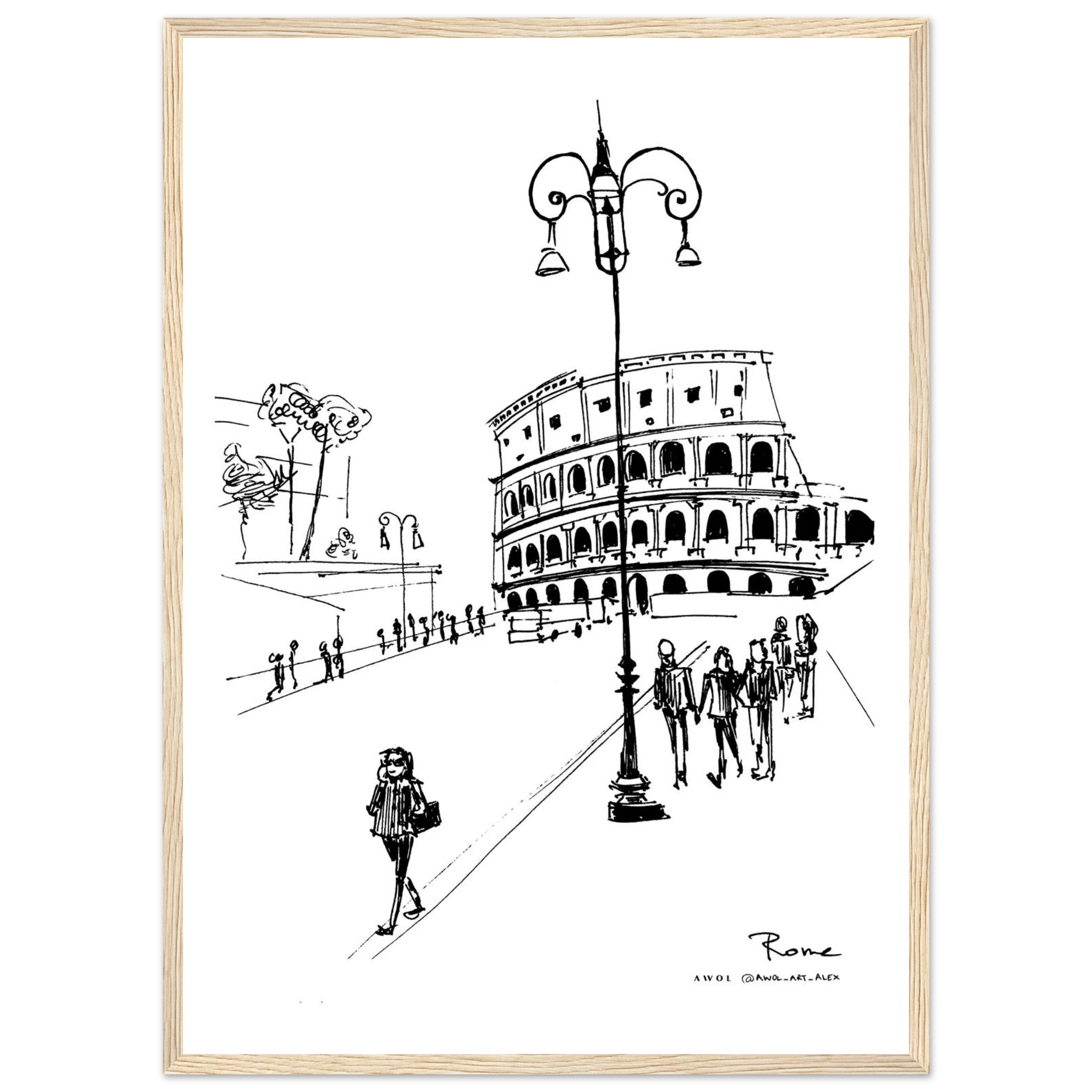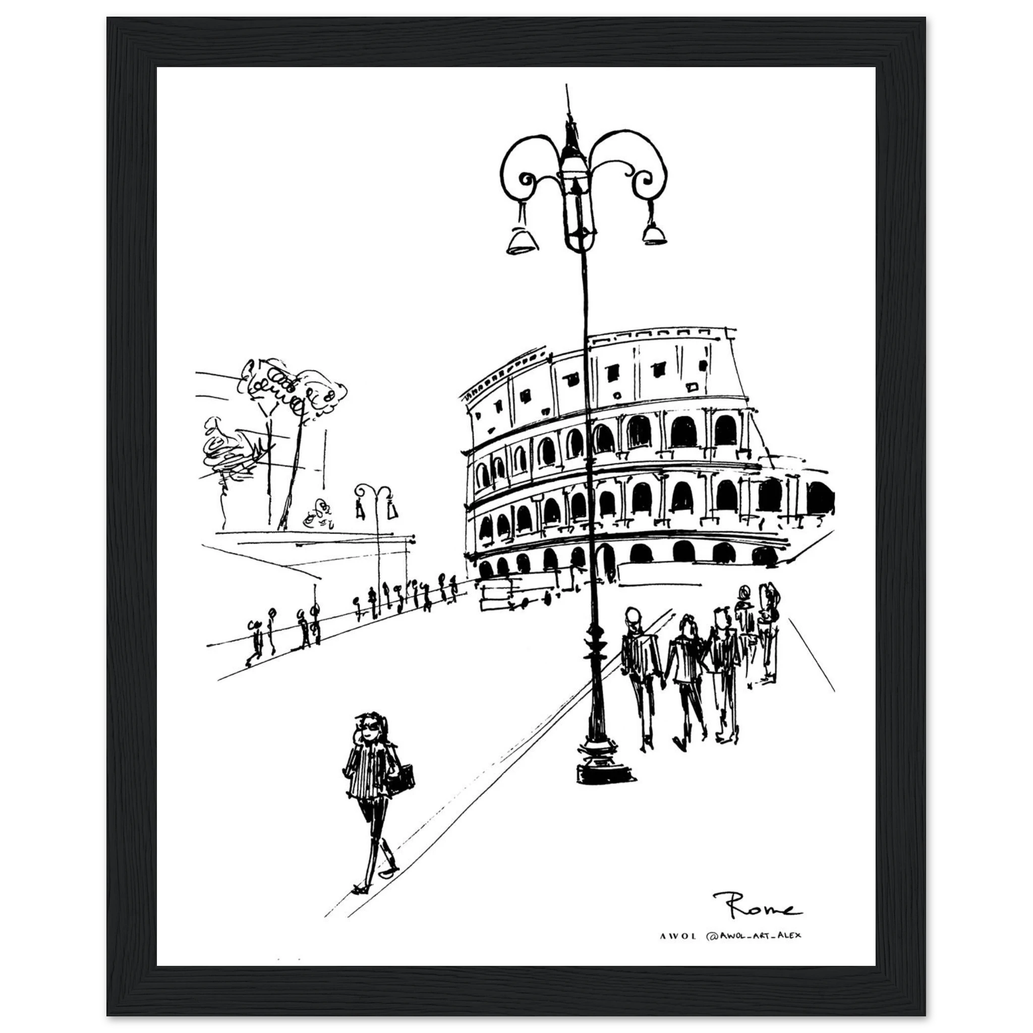 Bring Rome’s ancient aesthetic to your wall decor with this framed black and white art print of the iconic Roman Colosseum. Sketched by hand on location during my most recent travels through Italy, this expressive city illustration captures the energy of daily Roman life unfolding beneath one of the world’s most legendary landmarks. The bold ink lines and architectural detail merge history with modern minimalism—perfect for lovers of Italian architecture, design, and travel-inspired wall decor. Printed using museum-grade 12-color giclée technology on smooth, FSC-certified 200 gsm matte paper, this fine art print delivers vivid contrast and crisp clarity. Framed in your choice of handcrafted wooden frames—light wood, dark wood, black, or white—it arrives ready to hang, adding an elevated finish to your wall. Whether you’re curating a gallery wall, styling your home with European charm, or looking for a meaningful Italy gift, this framed Colosseum art print brings a timeless piece of Rome into your everyday space.