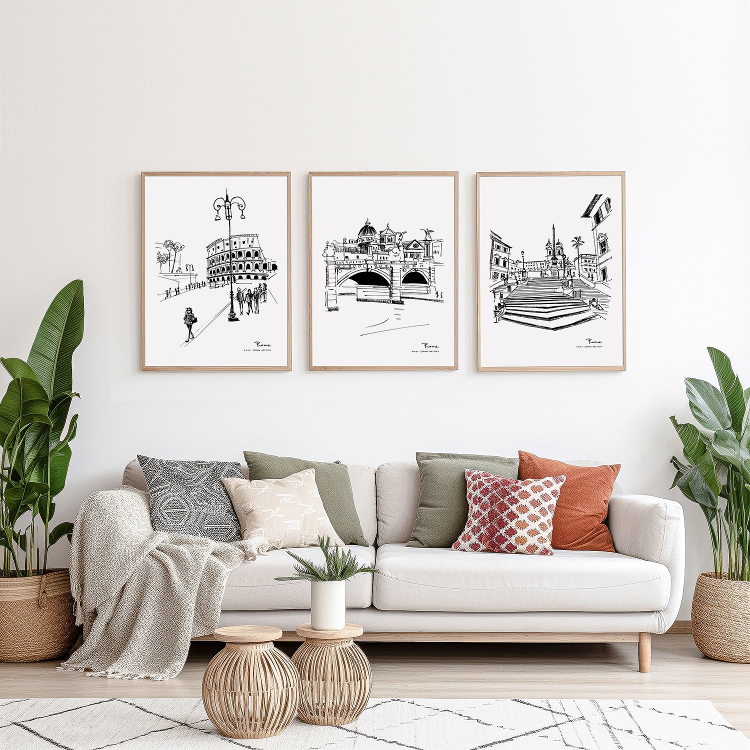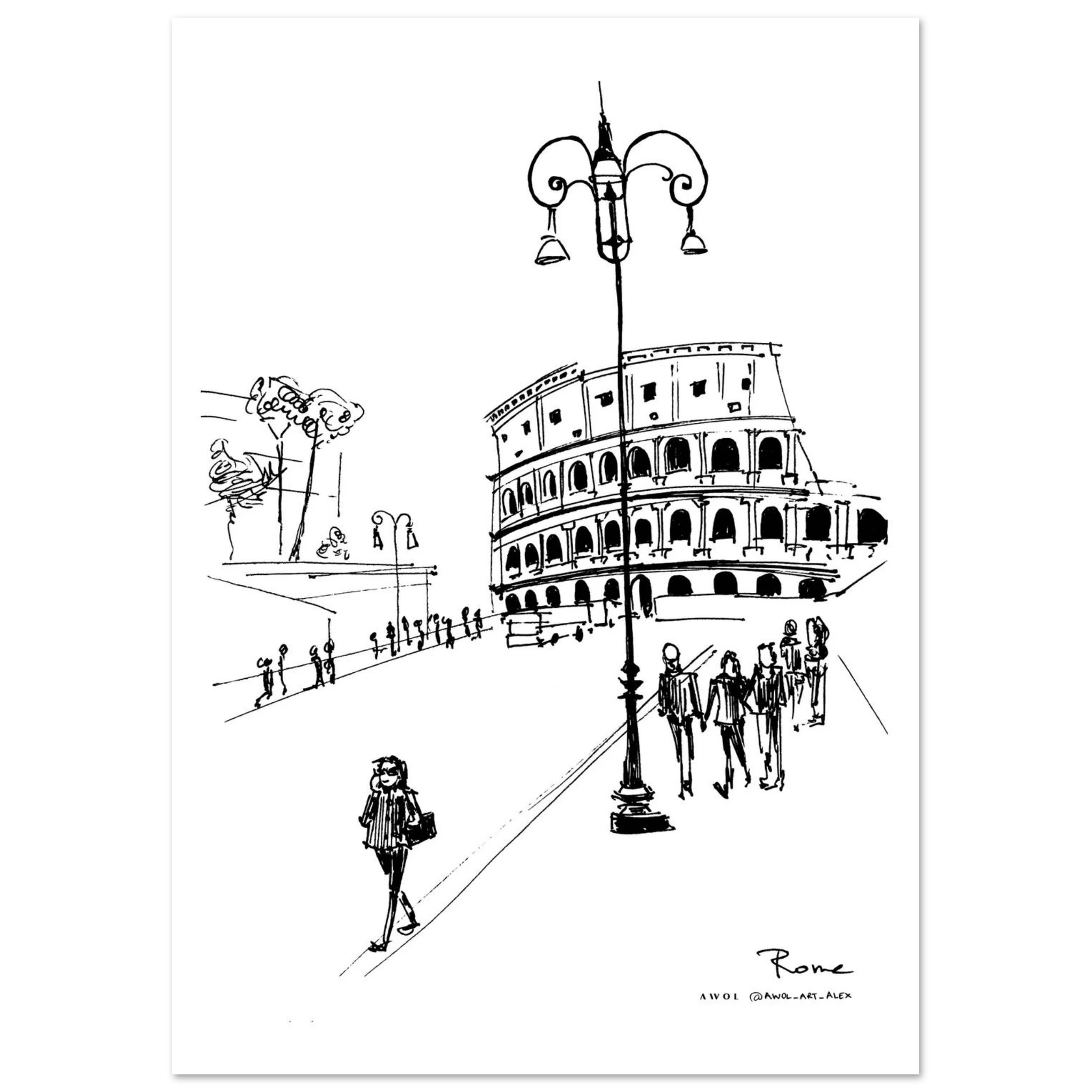 Bring Rome’s ancient architecture into your home decor with this hand-drawn black and white art print of the Roman Colosseum. Sketched on location during my latest Italy travels, this expressive city illustration captures the movement of modern-day Romans and tourists against the backdrop of one of the world’s most iconic landmarks. The sketchy ink lines and architectural detail blend history and minimalism—perfect for fans of Italian architecture, design, and travel-inspired wall decor. Printed using 12-color museum-grade giclée technology on smooth, FSC-certified 200 gsm matte paper, this fine art print offers deep contrast and stunning clarity. Whether you’re curating a home gallery wall, a travel mood, decorating a travel-inspired home, or searching for a meaningful Italy gift, this modern Rome art print adds a bold yet refined touch of Italy to any space.