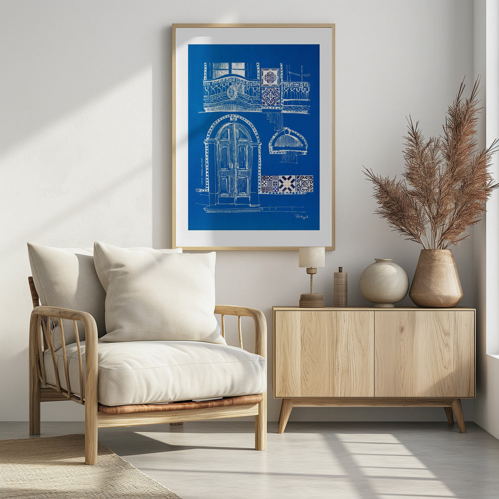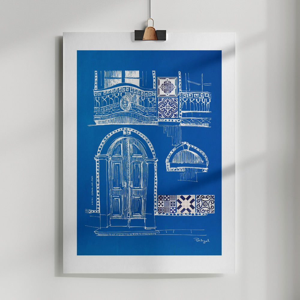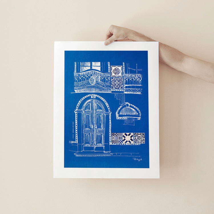 This blue Portugal travel art print was inspired by a recent trip from Lisbon down to the southern Portugese region of the Algarve. This fine art poster print is composed of an architectural drawing of a charming building with ornate ironwork balcony details, a rounded double door arch, unique window ornamentation and typical blue and white Portugese ajulejos tile art. The original travel sketch was inspired by a particularly beautiful house in the picturesque small town of Tavira. I created the mixed media artwork by layering the original sketches and drawings from my travel sketchbook onto a painted blue background, and then collaged the hand painted, graphic patterns onto the blue wall. This graphic wall decor print is infused with Europe vacation vibes in beautiful coastal destinations in Portugal. This is a colourful, modern wall art print making a unique gift or home decor print for Portugese design lovers. Let this urban poster print infuse your wall art with happy shades of blue, a daily vacation mood and a typical coastal Portugese aesthetic.