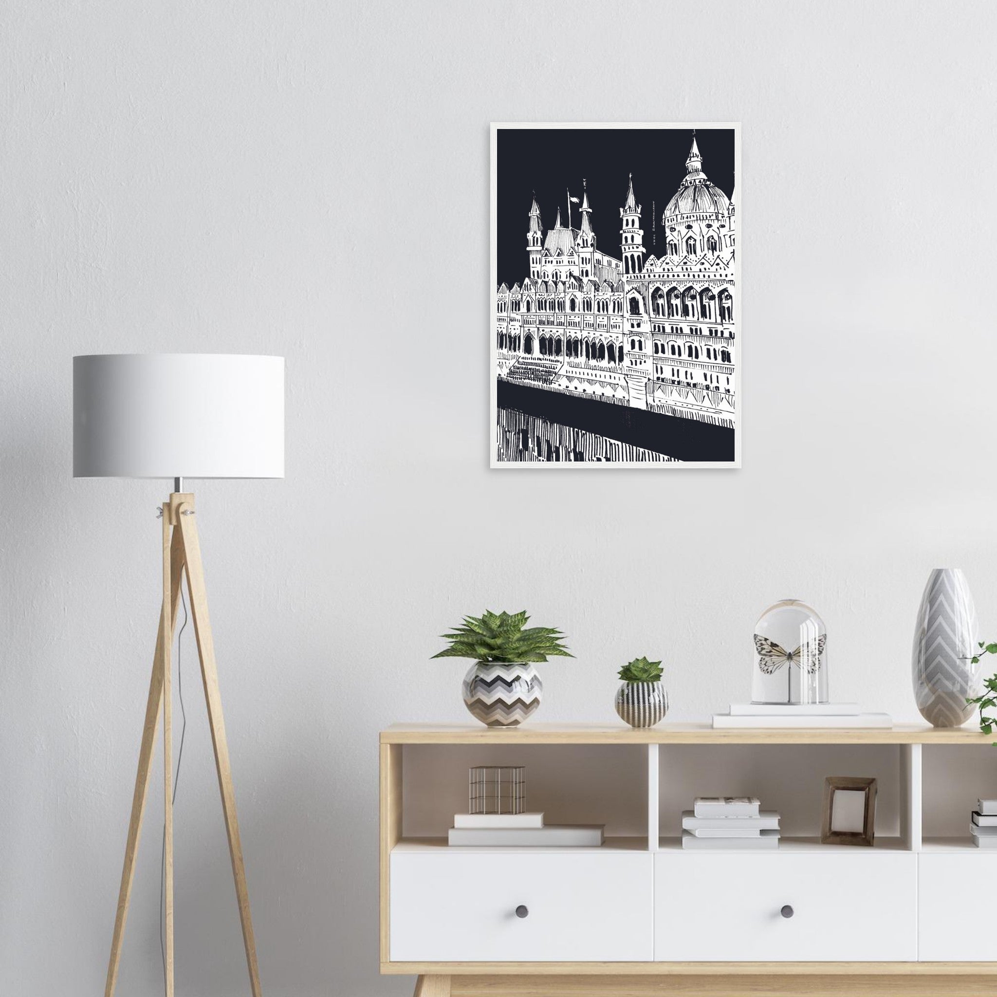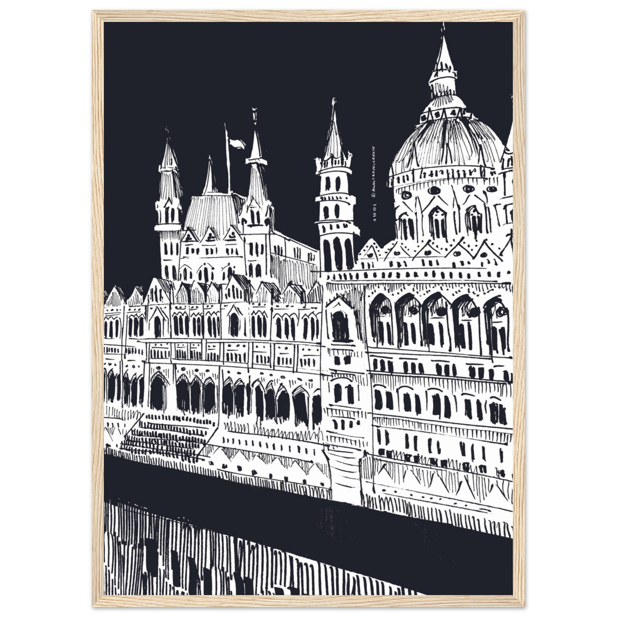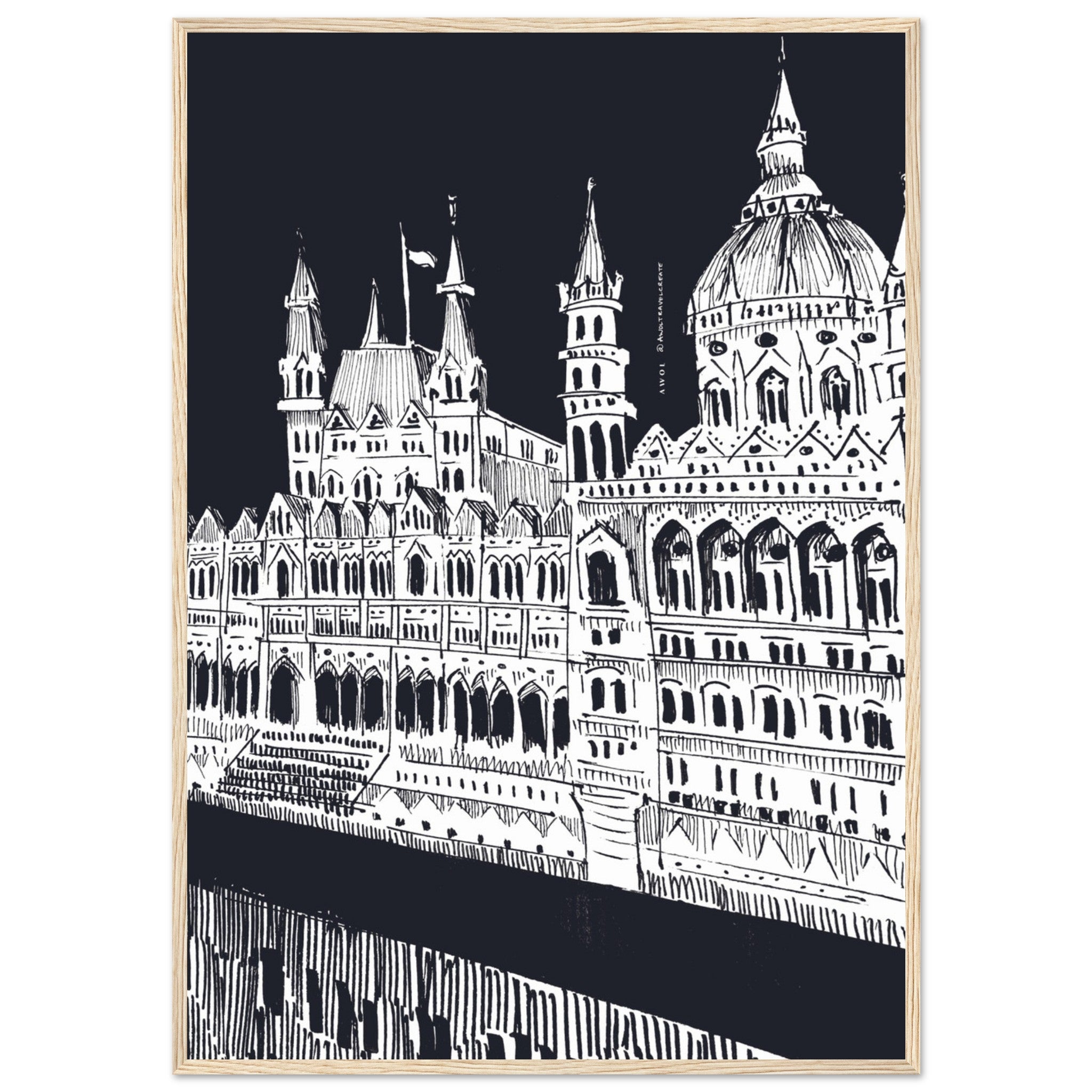 This black and white framed print of Budapest, Hungary, pays homage the historic architecture of one of Europe’s most beautiful capital cities, with its iconic Parliament Building reflected in the water of the Danube River at night. In this modern monochrome cityscape, a European castle is backlit by the moon. This framed wall art print combines iconic architectural details and classic elegance of beautiful buildings with a modern art style, mixing the black and white lines of a travel sketch with a contemporary aesthetic. The contrasting black and white palette of this framed print adds sophistication and a classy style to the overall composition of this Budapest city art print. This home decor art artwork is printed on premium quality paper, and is a cool travel souvenir for any wall decor style, a unique gift for Europe lovers, art or architecture enthusiasts, and people who love Budapest.