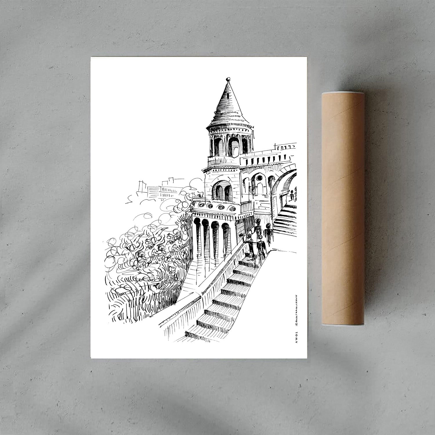 This black and white travel poster print of Budapest art poster illustrates the famous Fisherman’s Bastion in a detailed yet sketchy landscape art print. The castle is perched on the hill of Buda, overlooking the old city of Pest and the meandering Danube River. The intricate lines evoke a sense of depth, bringing the scene to life with a sketchy modern feel. Whether you’re a lover of Hungary, European capitals, travel art or historic architecture, this monochrome wall art print is a perfect addition to your European travel souvenirs, wall decor, home decor and office… and it also makes a unique gift for Hungarian lovers or travellers.