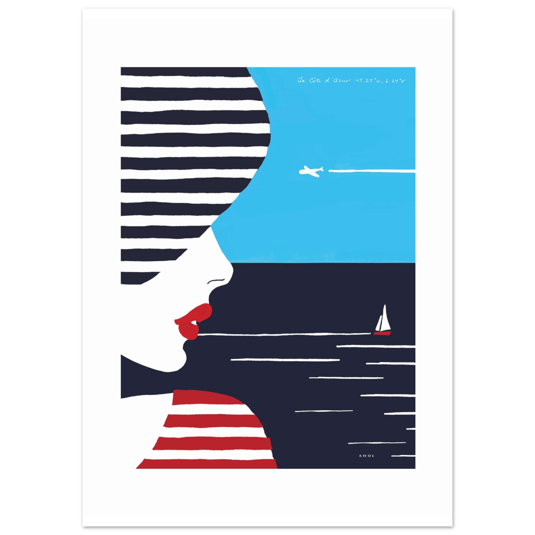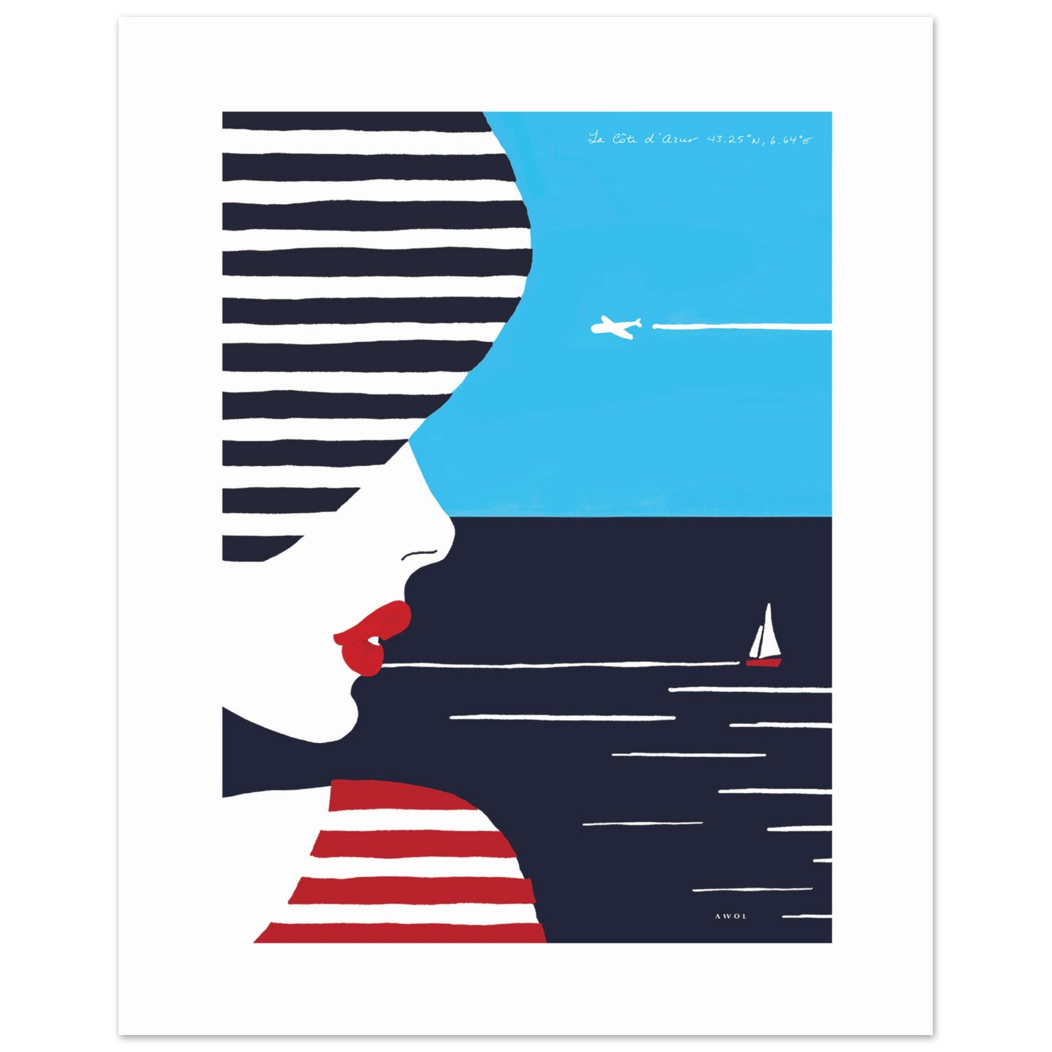 This graphic art portrait paints a mysterious woman in profile, wearing a French beret, red lipstick, and stylish stripes as she looks towards the Mediterranean sea as a sailboat and airplane travel in the sea breeze. This blue, red, white and black beach wall art print on aluminum is a colourful wall art blending graphic illustration, bold design and a modern Mediterranean design aesthetic in a sleek travel art print on aluminum that transports you to the beautiful destination of the French Riviera, in the South of France. Capturing the essence of the seaside, vacation vibes, sunshine, glamour and relaxation by the beach, this beach artwork is a visual celebration of the famous French travel destination, the Côte d’Azur. This travel print is a France souvenir, a cool gift for France lovers, and a colourful art print invoking happy vacation days and wanderlust to your home decor. The bold and dynamic design adds a bold Mediterranean wall decor to your living room, bedroom, kitchen or office space, making it a versatile and chic addition to any home decor – igniting a sense of relaxation, travel, vacations and seaside living. Visually striking, polished, and built to last – this stylish aluminum print is designed with superior quality and a clean finish.