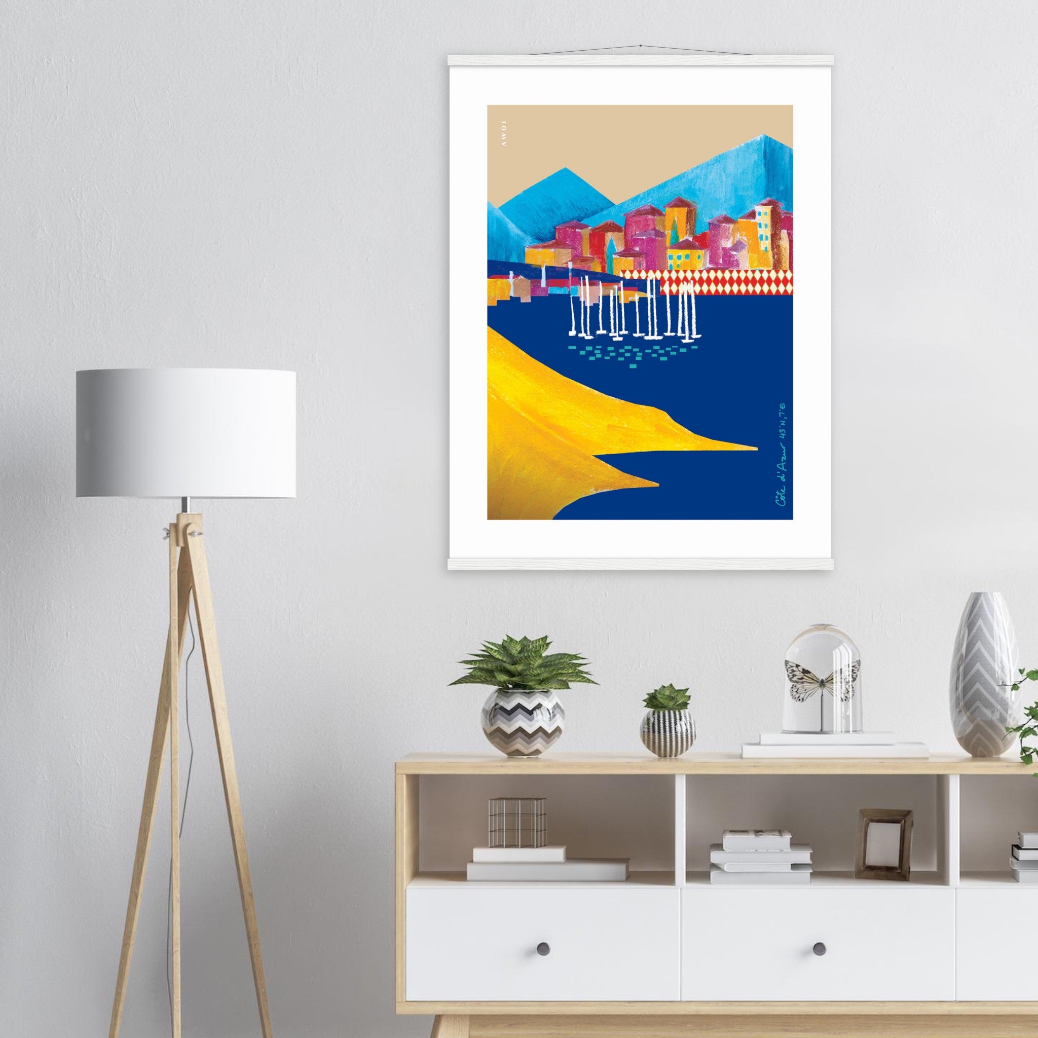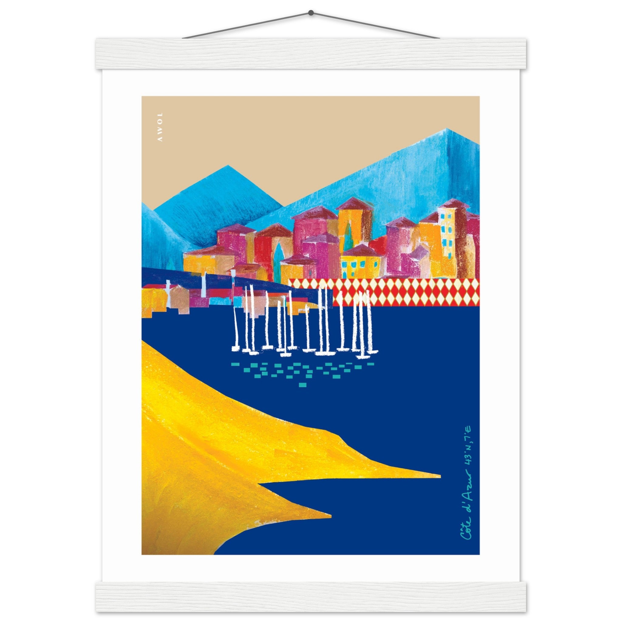 This colourful poster print is ready to hang. It is an artwork celebrating the beautiful French Riviera destination with its magnificent landscapes and unparalleled views : the small towns and fishing villages along the Mediterranean sea coastlines from St. Tropez, Antibes, Nice, Villefranche sur Mer, Beaulieu to Monaco and Menton are painted in bright colours of red, pink, and orange, while bright yellow and blue hues bring contrast and a vibrant colour pop to this hanging wall poster. Houses and villas are perched on rolling hills and tall cliffs overlooking small fishing ports, beaches and scenic bays filled with white sailboats. In this travel print, the French Alps serve as the backdrop of this mountain landscape, while in the foreground sailing boats dance on azure blue water. The sunshine bathes over this summer landscape, adding a touch of wanderlust, travel and eternal vacation mood to this wall art. Whether you yearn for the warmth of the Mediterranean or seek to bring a burst of colourful art work to your home decor, this wall painting is a visual escape. Let the beauty of the South of France brighten your surroundings, adding a colourful art print with year round Côte d’Azur aesthetic to your home decor.