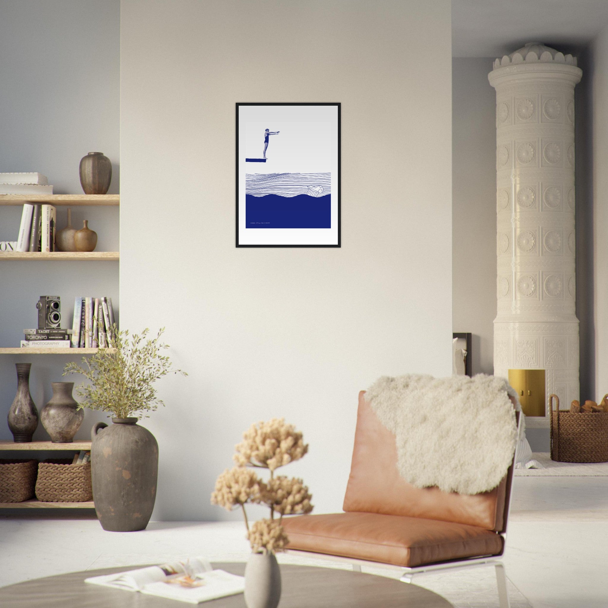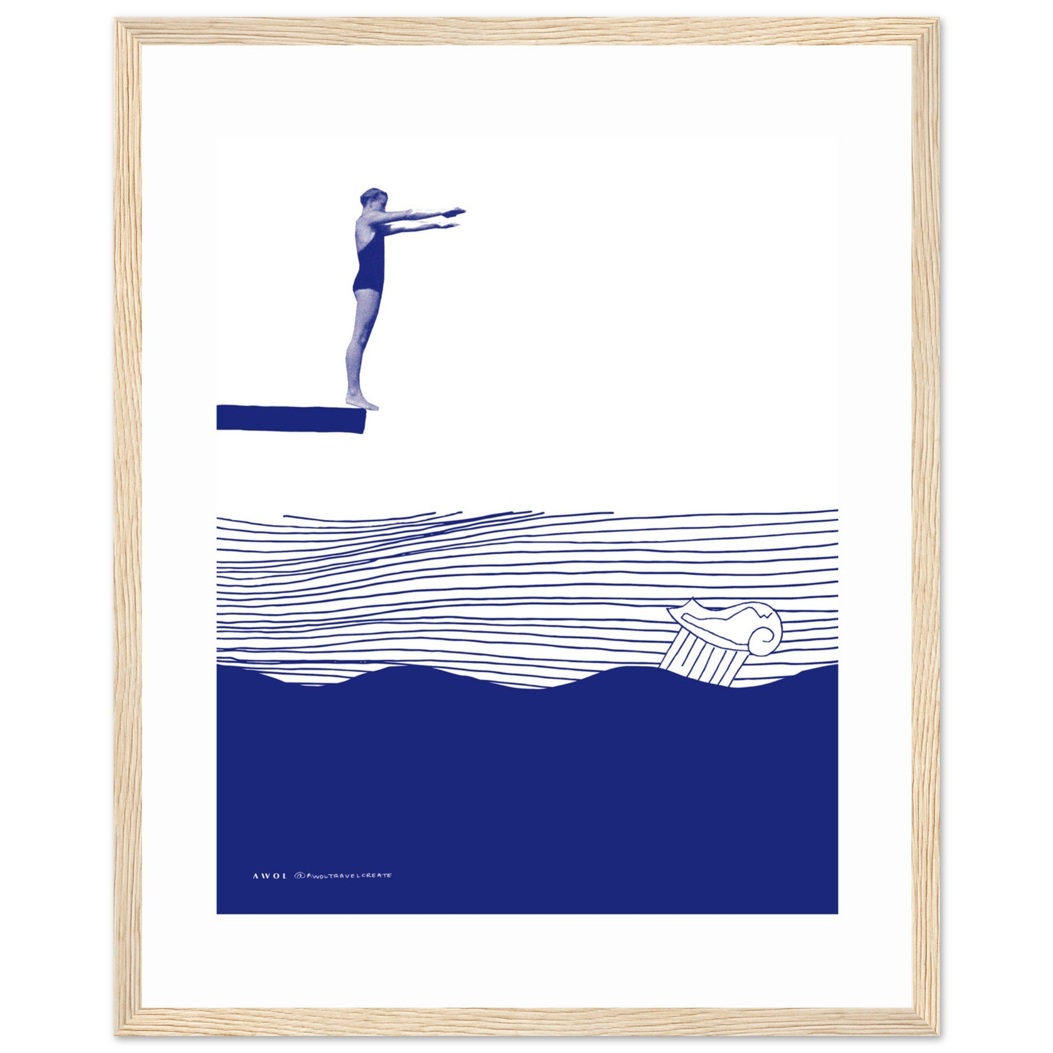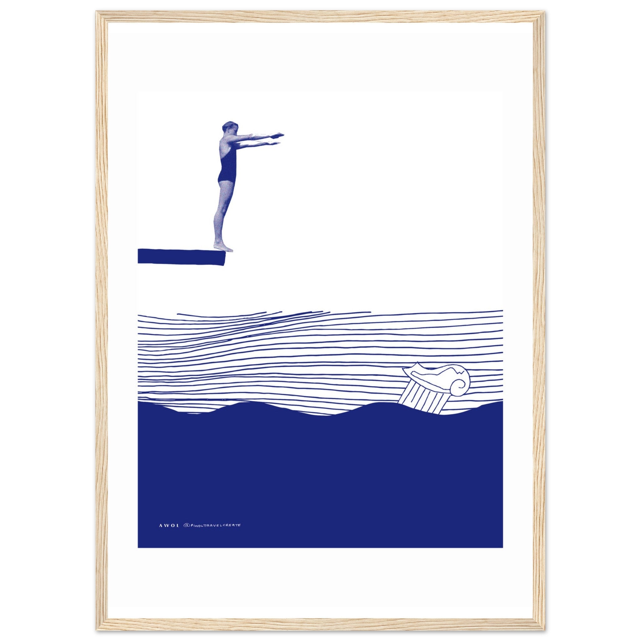 This minimalist framed art print depicts of a woman about to dive into a sea where ancient Greek / Roman ruins float lazily in the waves – a modern travel poster that evokes Mediterranean beaches, island living, relaxed vacation days by the seaside, and beautiful travel destinations. Blending collage art, photography and illustration, this minimalist wall art art makes a nod to ancient history in a modern, minimalist art style. The graphic lines and contemporary style of this blue art print, juxtaposed with the vintage aesthetic of the diving woman, creates a playful travel poster print that will brighten up any home decor. This Mediterranean art print brings sunshine and happy vibes to any bedroom, kitchen, living room or hallway or office art gallery needing a splash of blue, some vacation vibes, or simply some cool wall art. I hope it adds a touch of wanderlust and a playful bohemian essence to your wall decor.
