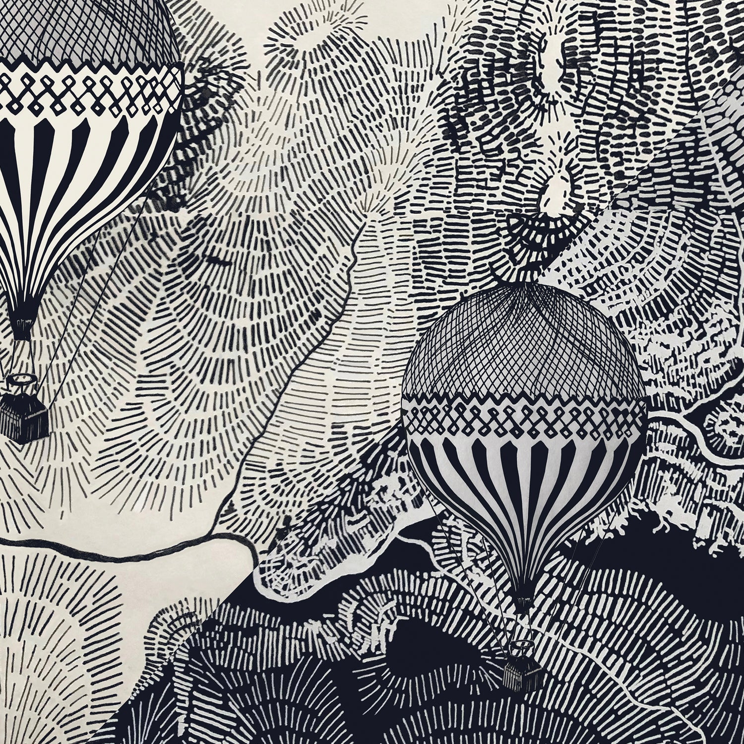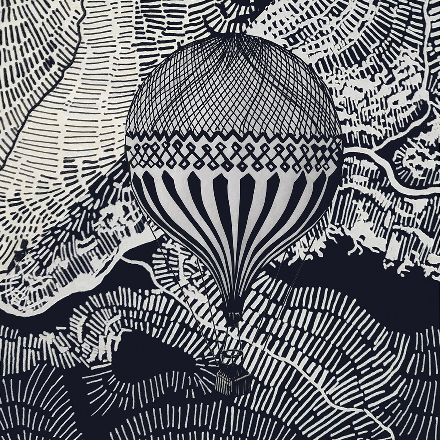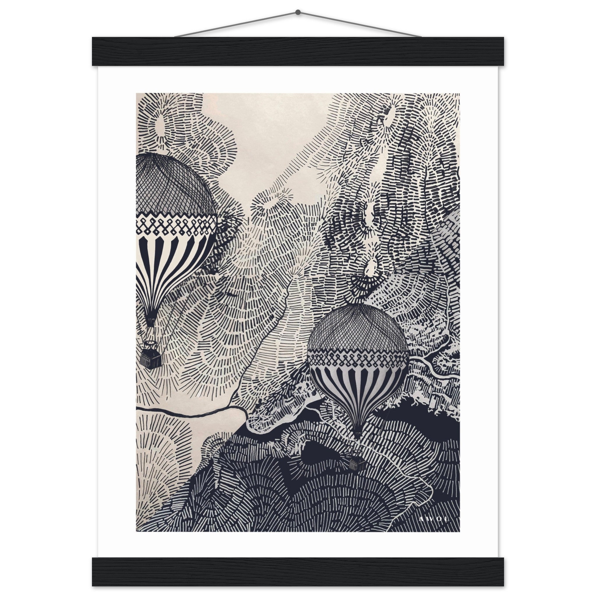 This black and white travel poster with minimalist wooden hanger is an intricate monochrome wall art print with air balloon illustrations in a vintage poster print – a visual journey of flight and imagination. This intricate balloon illustration is a travel print with two vintage hot air balloons flying high in the sky over an abstract landscape artwork drawn with an intricate line pattern representing rivers, mountain roads and valleys. This black and white abstract wall art weaves a tapestry of beautiful destinations portrayed from a birds’ eye point of view. The retro montgolfières infuse this wall decor with vintage travel nostalgia, and transport us to a historical era of romanticized travel, journeys and explorations to unknown and far away places. Whether you are a travel lover, an adventurer, or looking for a gift for a traveller with a curious and rebellious spirit, this travel art print is an elegant wall poster that reminds you to follow your dreams, and embrace the spirit of courage, adventure and discovery. This inspiring monochrome wall art will infuse your home decor with wanderlust, the freedom of flying high in the clouds and the wisdom of seeing life from a new and different angle.