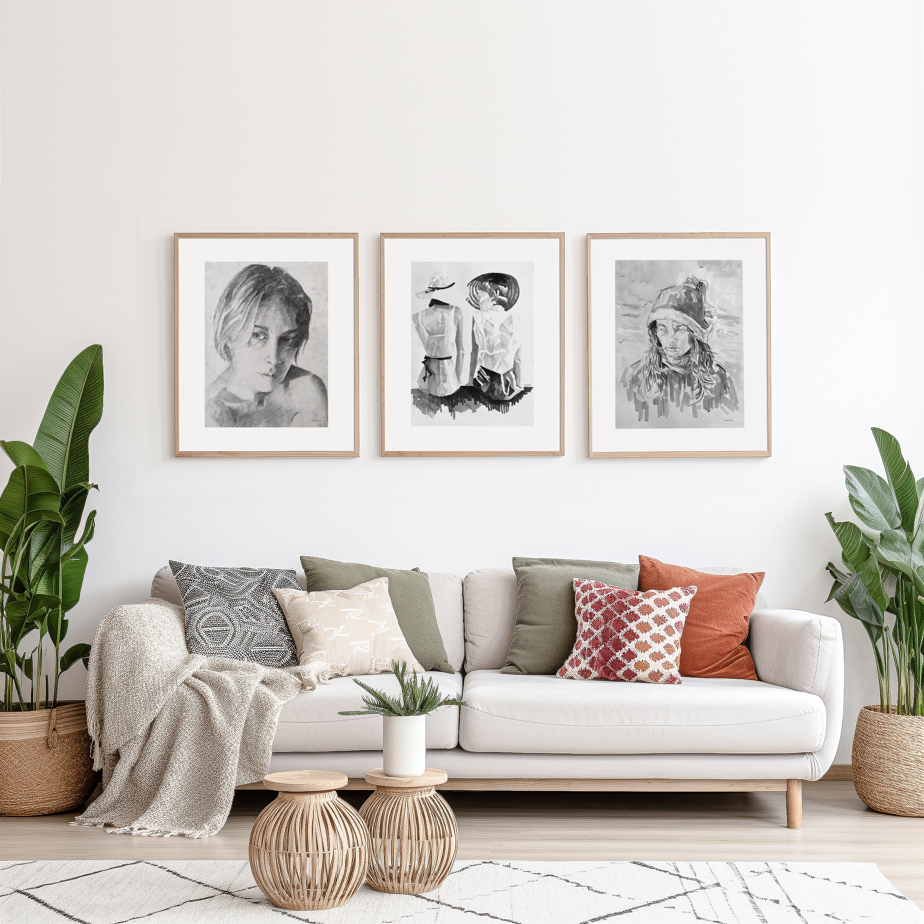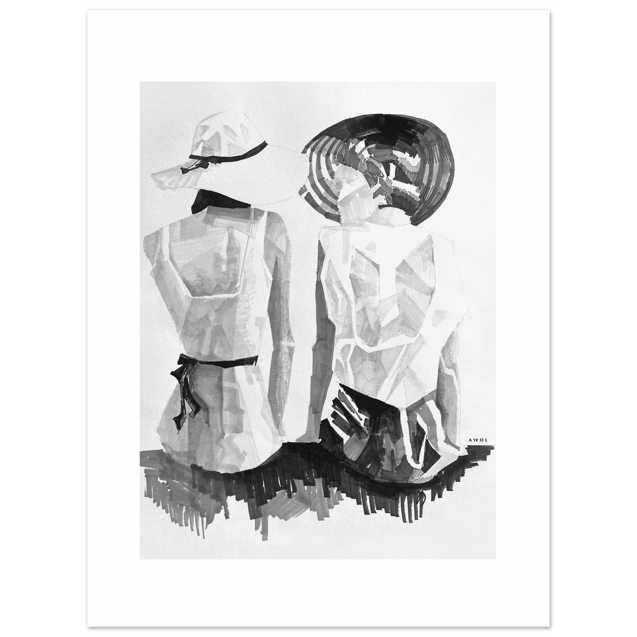 This black and white wall art poster print paints a portrait of two European chic, beautiful women in timeless and elegant summer fashion, whispering intimately by the sea. The two friends, epitomizing grace, style, and summer allure on the glamorous French Riviera, sit looking at a beach while sharing secrets we’ll never know. This monochrome poster print captures the essence of perfect summer days spent in the stylish embrace of the Mediterranean, where elegance and relaxation converge in a modern yet sophisticated artwork. This seaside destination print evokes the warmth of breezy, carefree summer days, while the monochrome colour palette adds a modern edge to this Mediterranean wall art, creating an elegant and classic art style for any wall decor, whether in your living room, bedroom, sun room, or your home art gallery.