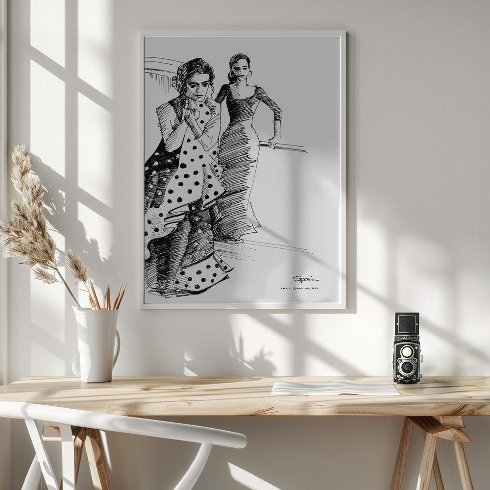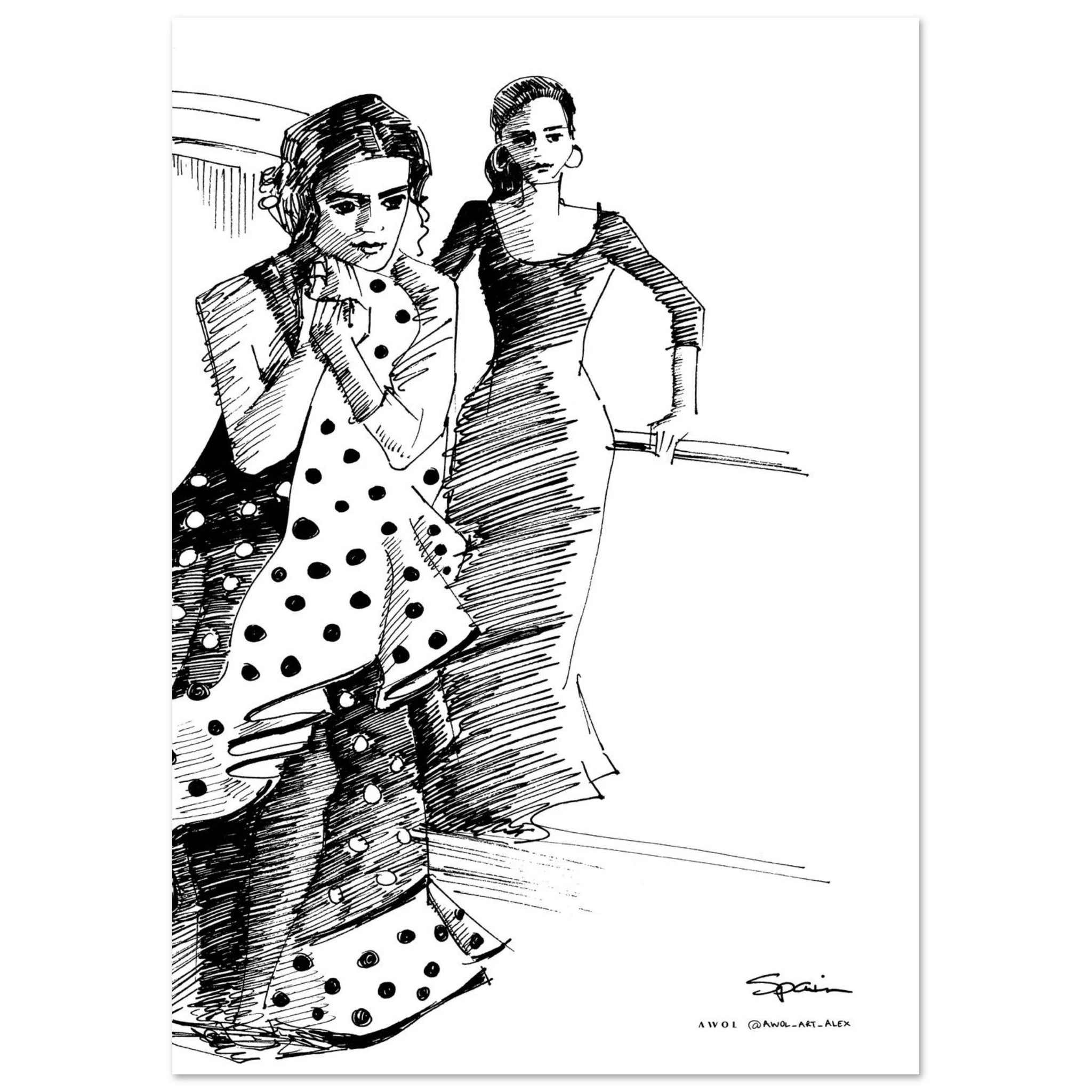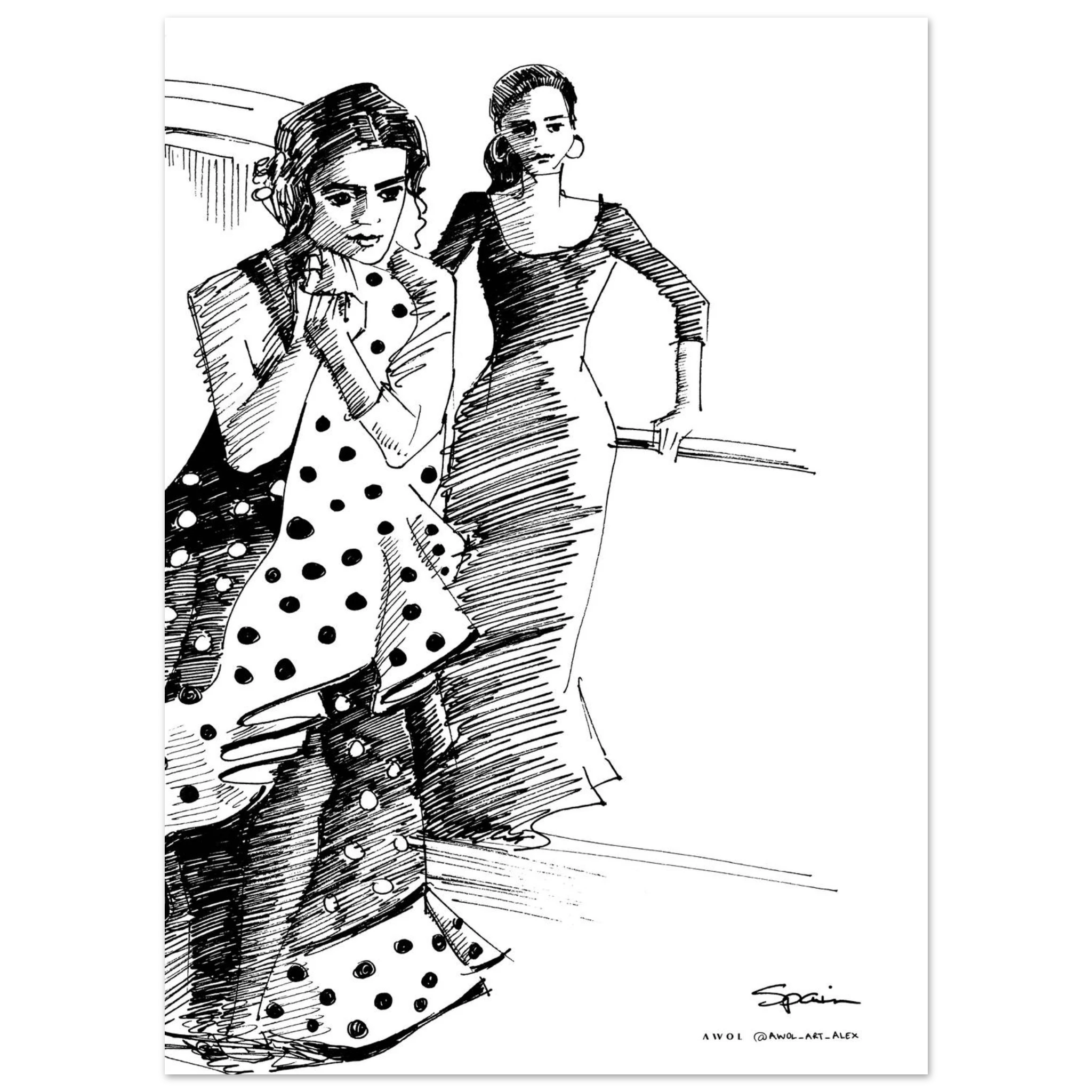 This black and white, graphic Spain illustration is a hand-drawn, graphic portrait art print that captures the elegance and intensity of two Flamenco dancers resting before their performance. Dressed in traditional, graphic dance costumes, the two women stand gracefully on the sidelines, their gaze fixed on something unseen, perhaps another dancer or the rhythm of the music. This pen-and-ink portrait drawing technique blends sketch-like fluidity with intricate detail, evoking both movement and stillness. Inspired by travel through Andalucía, Spain—Seville, Córdoba, Granada, and Ronda—this Spanish travel poster is a unique Spain souvenir that artfully reflects the deep cultural roots, tradition and contemporary passion of Flamenco. This sketchy, monochrome figurative art print is perfect for lovers of dance, Spanish culture, movement, and expressive line work. Whether hung as wall art in a home, dance studio, or passed on as a unique gift to an art, dance or travel lover, it adds a unique Spanish aesthetic to any modern art collection or travel wall decor. Let the spirit of Flamenco dancing bring warmth and Spanish vibes into your space.