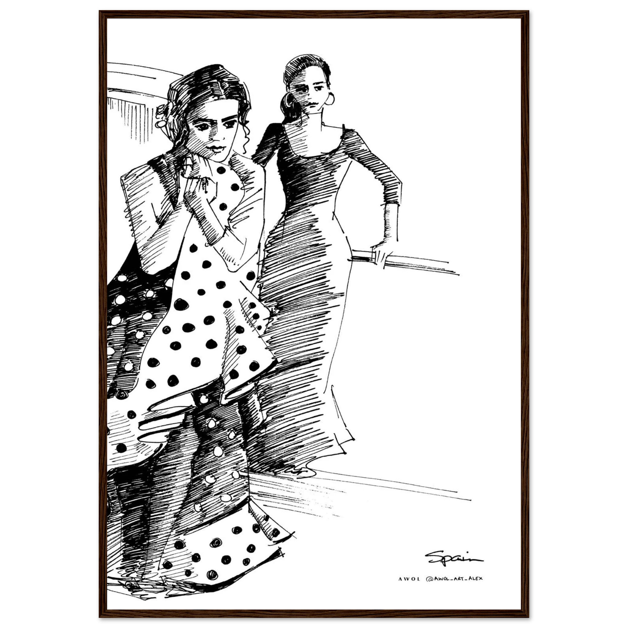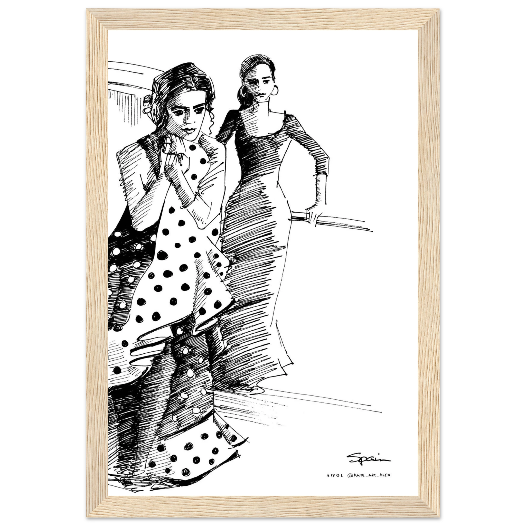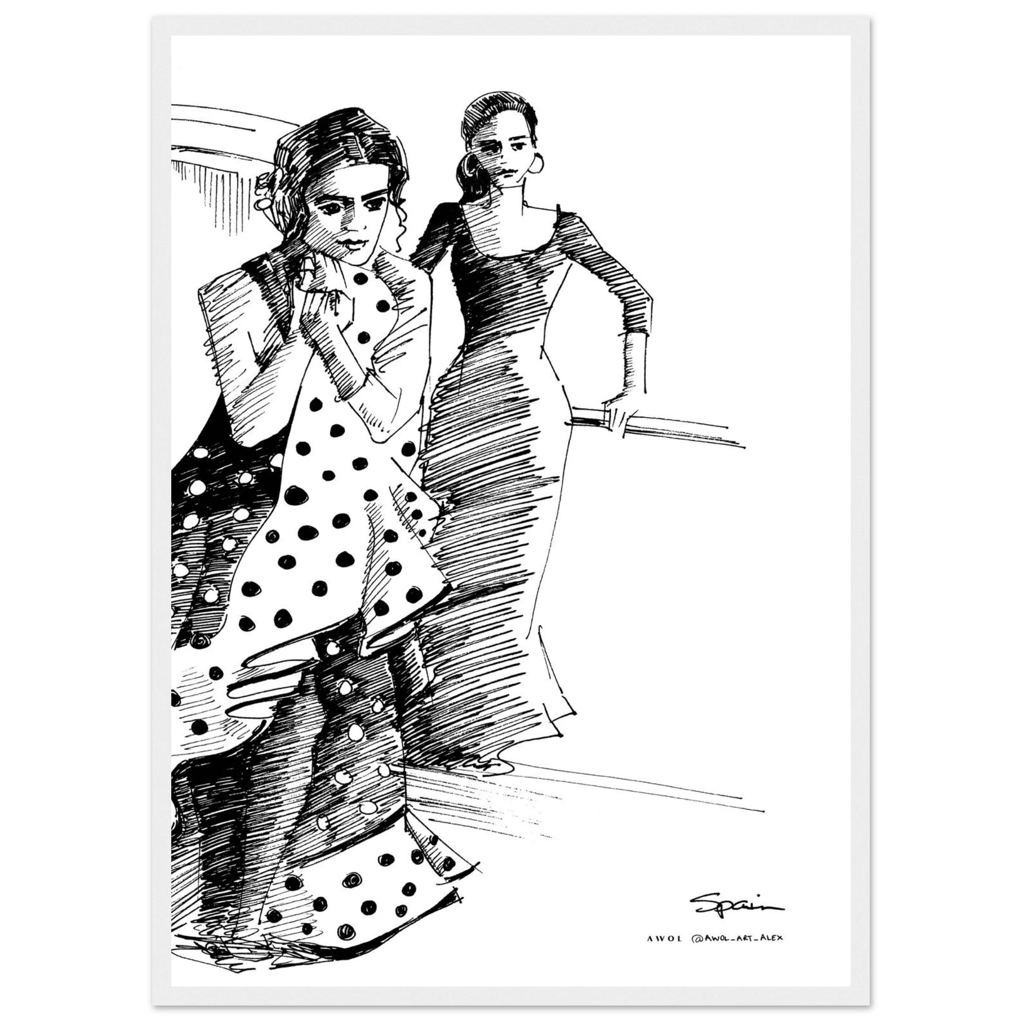 This black and white, graphic Spain illustration is a hand-drawn framed art print that captures the elegance and intensity of two Flamenco dancers resting before their performance. Dressed in traditional dance costumes, the two women stand gracefully on the sidelines, their gaze fixed on something unseen, perhaps another dancer or the rhythm of the music. This pen-and-ink portrait drawing technique blends sketch-like fluidity with intricate detail, evoking both movement and stillness. Inspired by travel through Andalucía, Spain—Seville, Córdoba, Granada, and Ronda—this framed Spain art is a unique Spanish travel poster that reflects the deep cultural roots, tradition, and contemporary passion of Flamenco. This sketchy, monochrome figurative framed wall decor is perfect for lovers of dance, Spanish culture, movement, and expressive line work. Whether displayed as wall art in a home, dance studio, or given as a unique gift to an art, dance, or travel lover, it adds a distinctive Spanish aesthetic to any modern art collection or travel-inspired decor. Let the spirit of Flamenco dancing bring warmth and Spanish charm into your space.