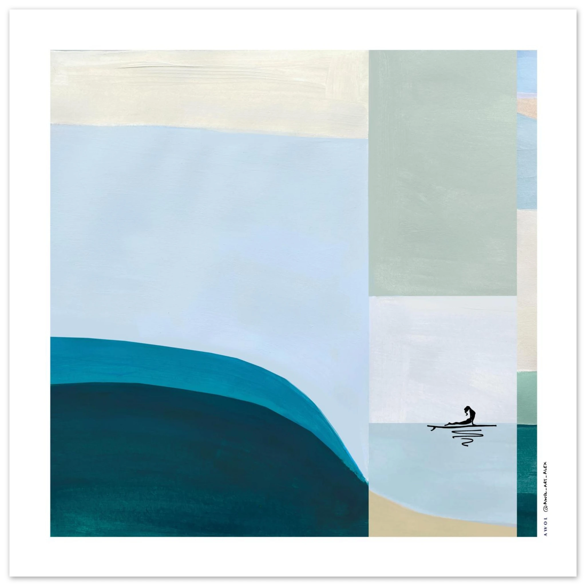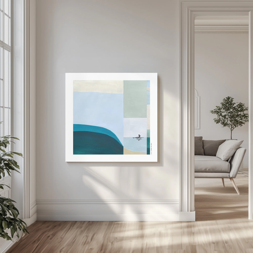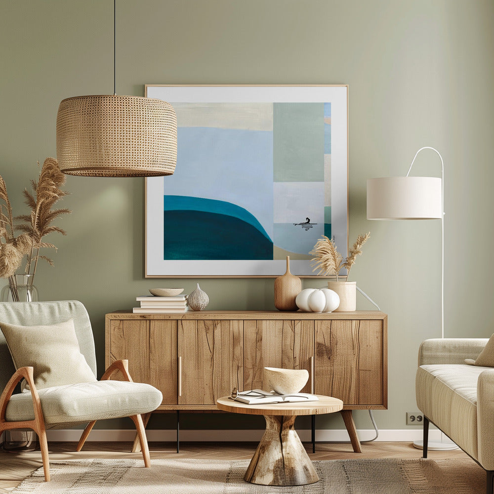 Infuse your wall decor with urban zen with this framed fine art yoga poster; a modern Canadian wall art print designed to bring calm, flow, and understated elegance to your space. This ready-to-hang framed art print features a minimalist black line silhouette of a woman practicing yoga on calm water, set against a geometric abstract landscape that evokes rolling hills, sandy beaches, sea, and sky. Painted in a soothing palette of soft blues, olive green, beige, gray, and warm earth tones, this contemporary art print blends organic forms with clean design—creating a peaceful, balanced visual ideal for wellness-inspired interiors. Rooted in both teaching and practicing yoga outdoors across Montreal, Quebec—from dawn paddle board yoga sessions in Verdun to quiet moments near city lakes, the Lachine Canal, and the St. Lawrence River—this piece captures the meditative stillness found in nature, even within a busy urban environment. Perfect for yoga studios, modern home decor, and wellness space walls, this framed art print adds a touch of soulful, minimalist Canadian art and zen to any room. Perfect for: – Thoughtfully designed interiors– Modern, minimalist home décor– Gifting for art lovers and mindful nature lovers & yogis– Elevating your home gallery wall or a solo statement piece