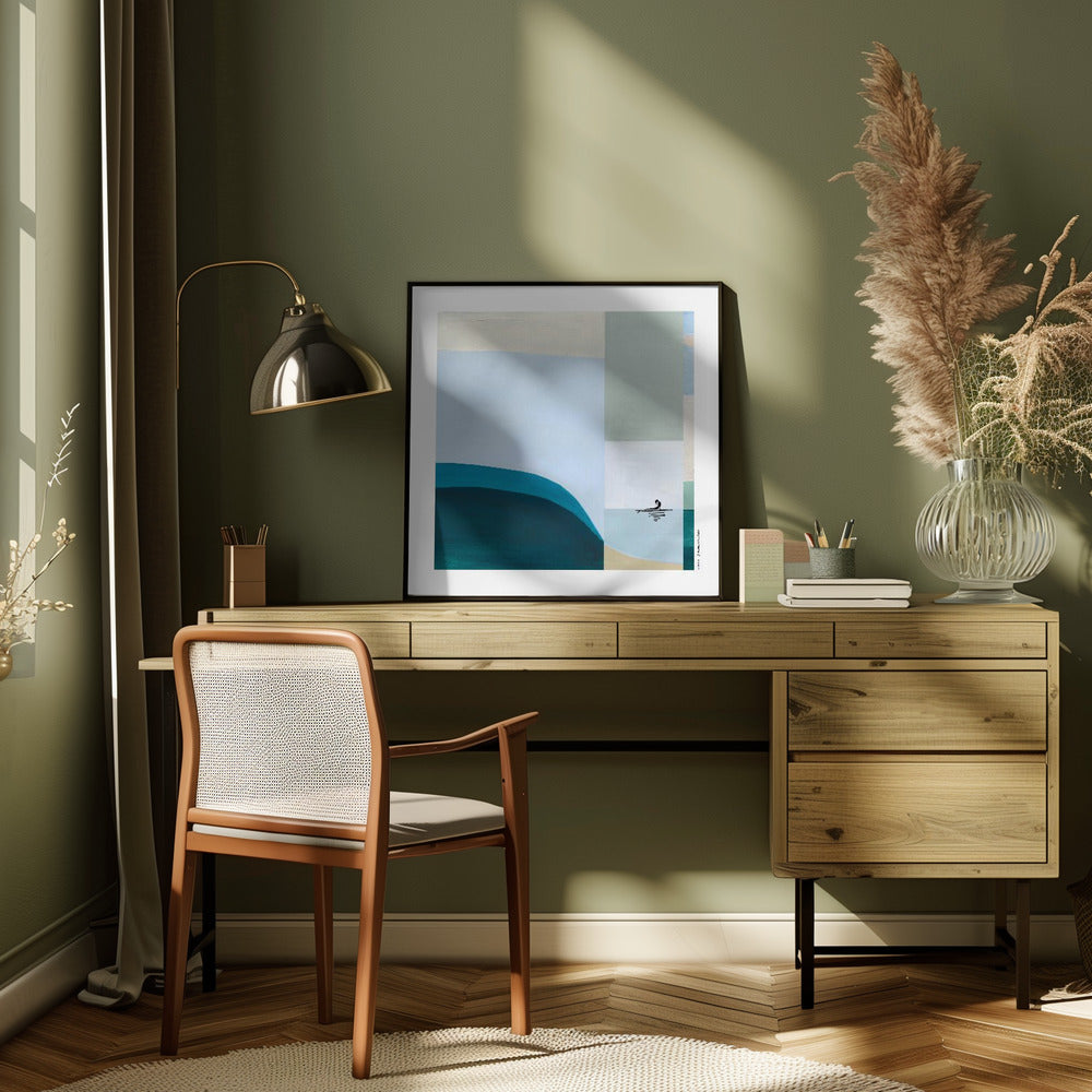 Bring a sense of urban zen to your wall decor with this ready-to-hang framed art print — contemporary framed wall art designed to inspire calm, flow, and contemporary elegance. Featuring a minimalist black line silhouette of a woman practicing yoga on tranquil water, this modern artwork is set against a backdrop of abstract shapes and a geometric landscape evoking rolling hills, nature, sandy shores, sea, and sky. Painted in a soothing palette of soft blues, olive green, beige, gray, and warm earthy tones, this modern zen art print combines organic elements with clean design. The result is a peaceful, balanced coastal print — perfect for wellness-inspired interiors and modern minimalist decor. Inspired by practicing and teaching yoga throughout Montreal — from early morning paddleboard sessions in Verdun to quiet moments by the Lachine Canal and St. Lawrence River — this artwork captures the meditative stillness of nature within a dynamic urban setting. Ideal for yoga studios, home sanctuaries, or stylish living spaces, this framed wall art adds a soulful, modern touch to any environment. Perfect for: – Thoughtfully curated interiors– Modern minimalist and wellness-inspired wall decor– Art collectors, yoga lovers, and mindful living enthusiasts– Enhancing your gallery wall or displaying as a solo contemporary art statement