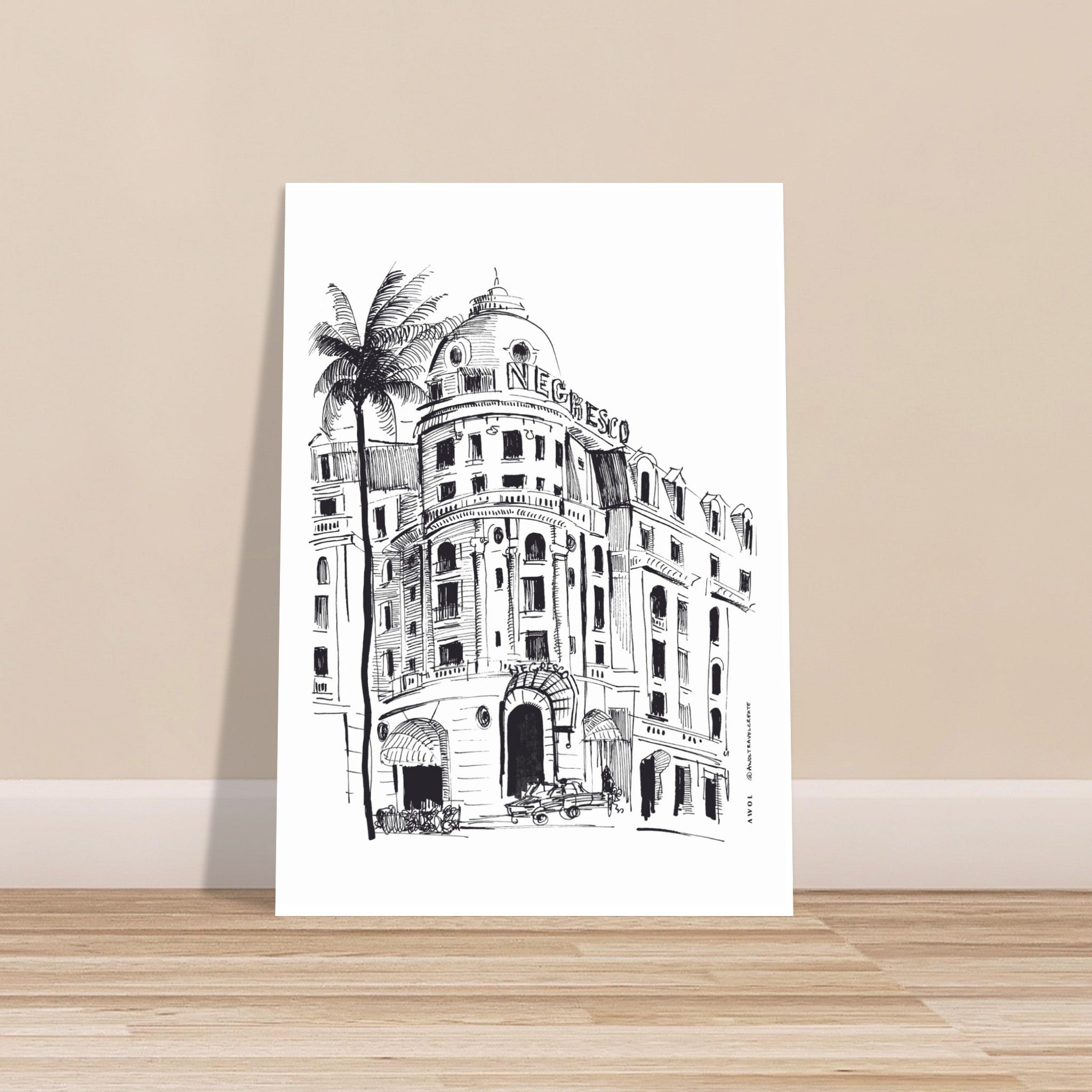 This South of France travel poster is a modern city drawing artwork with one world’s most beautiful and elegant luxury hotels, the iconic Negresco Hotel in Nice, France. This black and white architectural drawing of this famous building on the Promenade des Anglais – a French Riviera landmark overlooking the Mediterranean sea among swaying palm trees, luxurious cars, beautiful people and one of the scenic coastline destinations in Europe. This city art print in the South of France encapsulates luxury, beauty, and the timeless elegance of the stylish Côte d’Azur. This monochrome art print features this beautiful building art in a sketchy drawing style with detailed lines and a monochrome colour palette. This urban art print It makes an elegant wall decor artwork, a timeless addition to your France travel souvenirs, and a unique gift for France travellers, bringing beautiful vacation vibes and French Riviera style to your wall decor. It’s not just wall art; it’s a visual journey into the heart of the Côte d’Azur’s unparalleled elegance, beauty and sophistication.