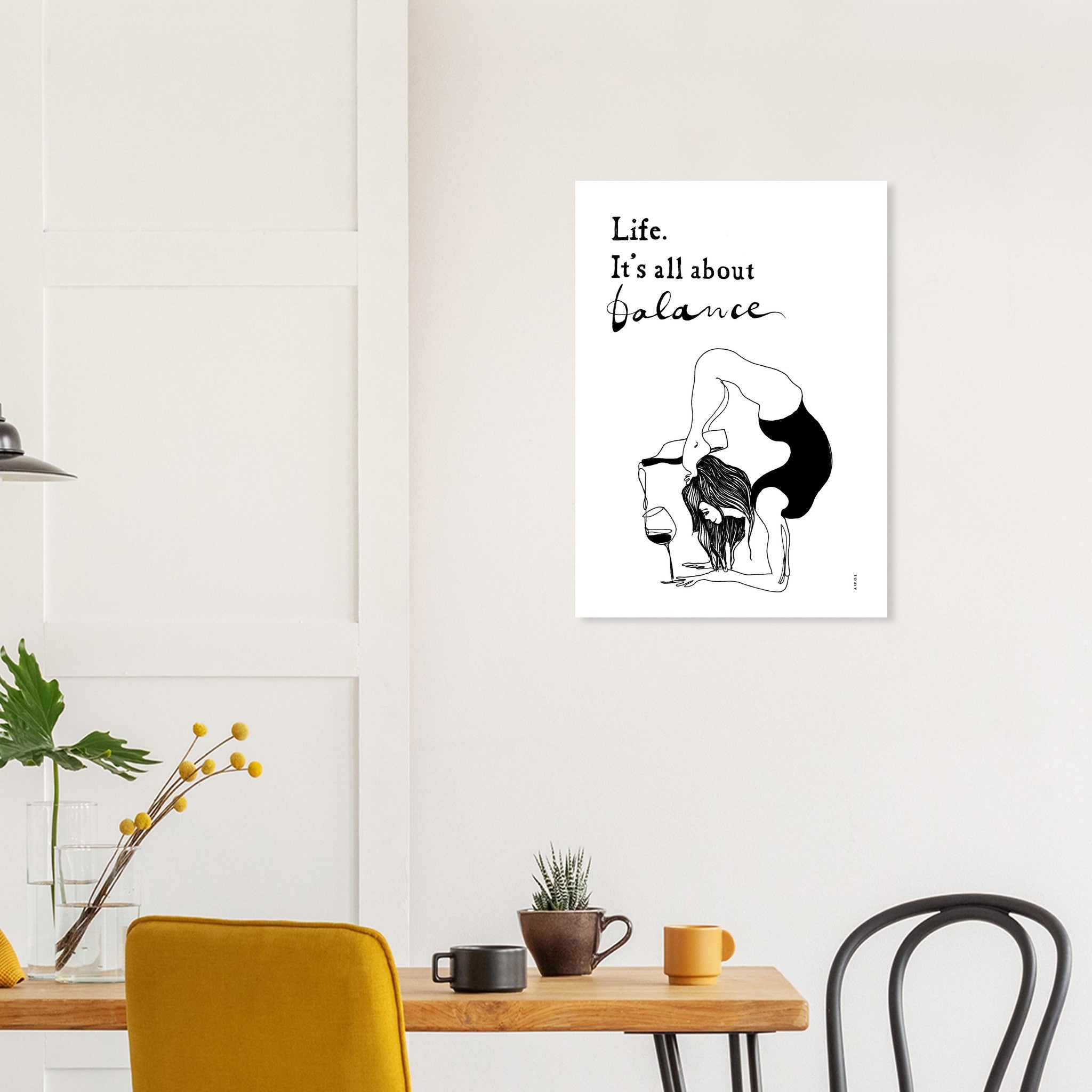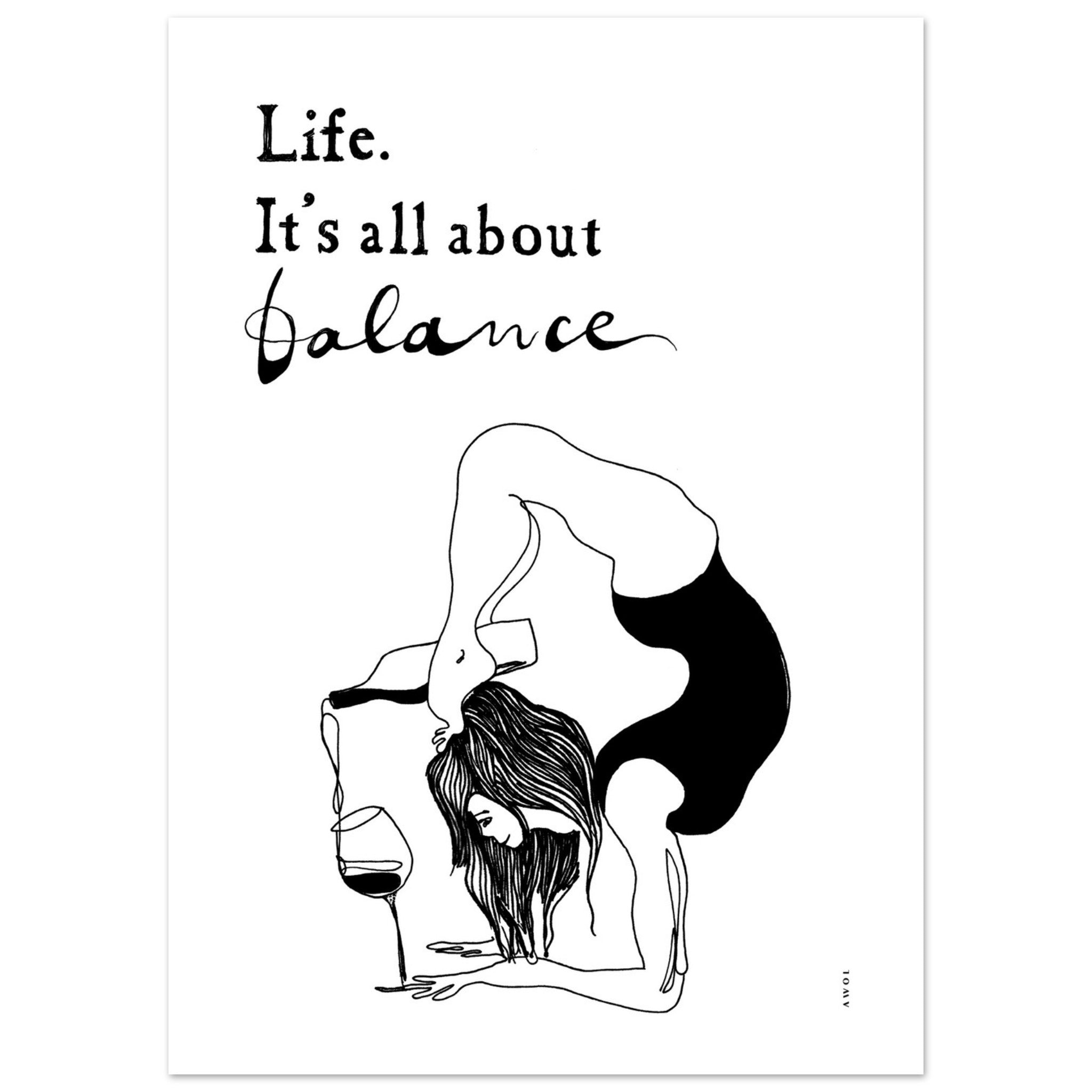 This black and white, funny mental health poster with the quote “Life. It’s All About Balance” is a modern yoga art print of a woman practicing a yoga pose, balancing in a handstand while pouring a bottle of wine, celebrating the art of living yoga in a fun monochrome yoga poster. This playful art of living yoga artwork is a unique fusion of wellness, spirituality and humour that adds a touch of joy and whimsy to your yoga studio, your spiritual practice, or your home decor. The playful and minimalist wall art style of this modern zen poster print not only makes it a chic addition to your yoga studio decor, your home, kitchen or office, and it also makes a thoughtful and funny gift for your friends. This yoga and art illustration blends simplicity, fun and laughter in both yoga and life. The carefully hand-crafted, minimalist artwork and hand-written message capture the essence of mindfulness and indulgence, showcasing the harmonious blend of self-care and enjoyment and reminding us all that life’s journey is a delicate dance of equilibrium.
