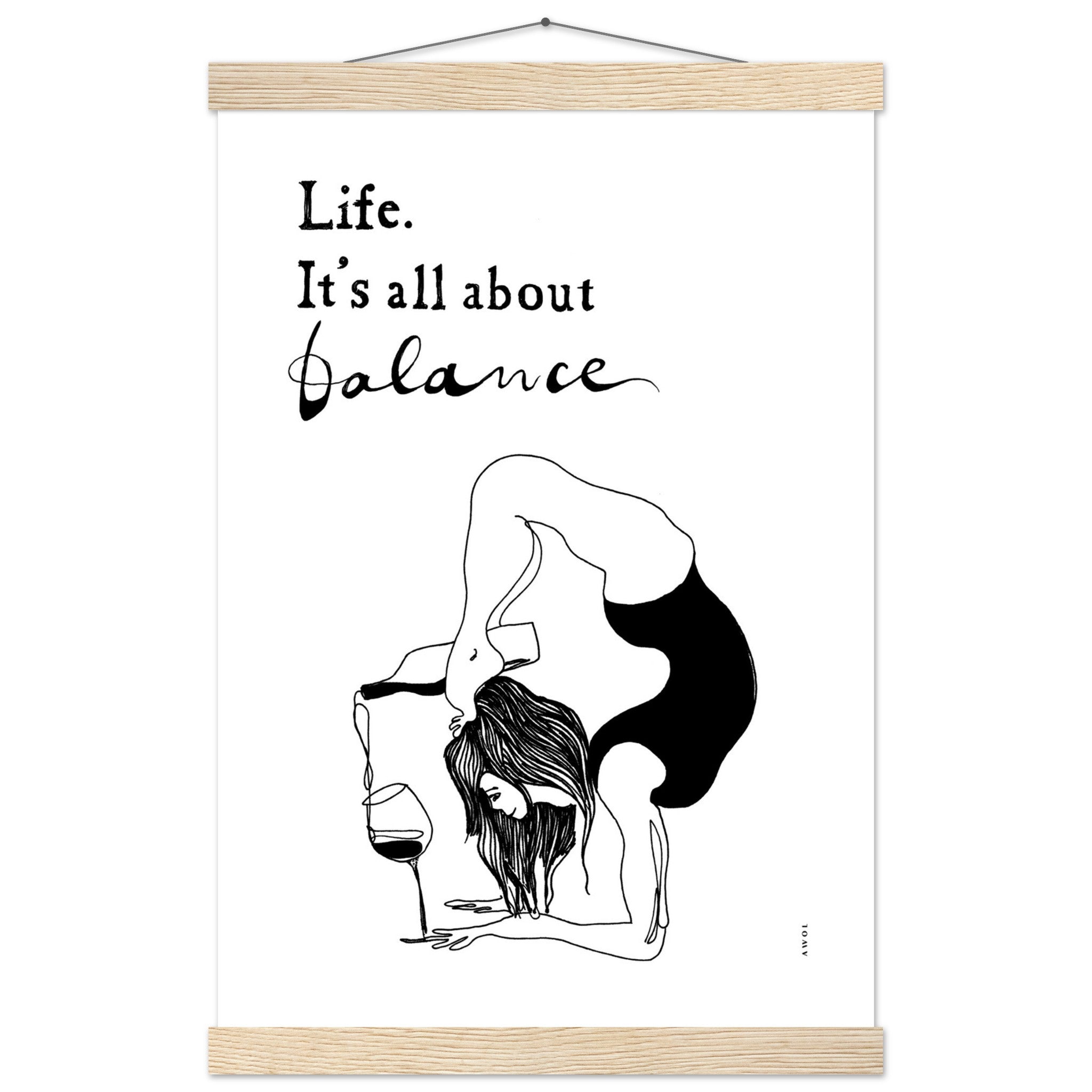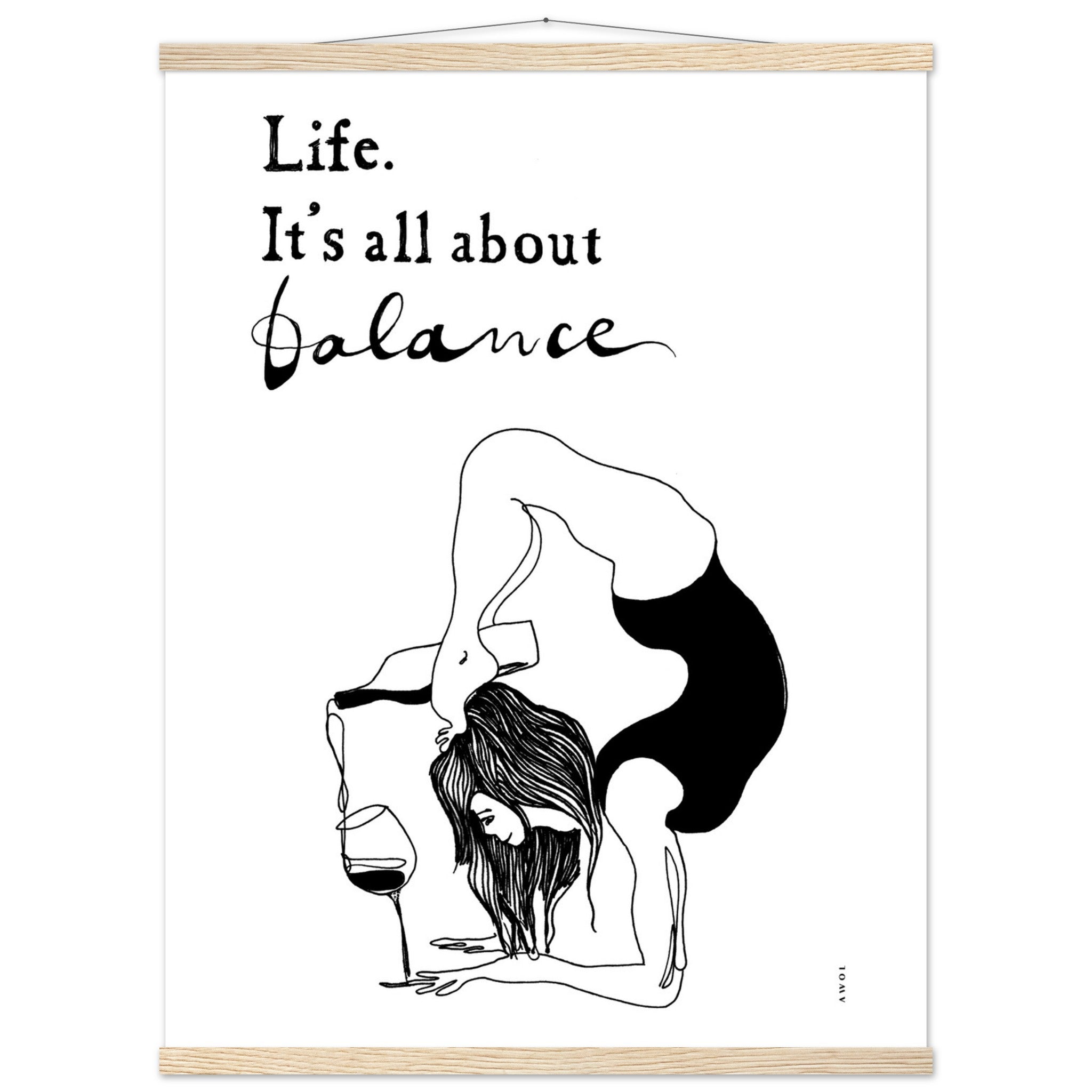 This funny yoga poster print with the inspirational quote “Life. It’s All About Balance” is a modern mental health poster with a minimalist wall art aesthetic. This black and white yoga art print shows a woman practicing a yoga pose, balancing in a handstand while pouring a bottle of wine – a celebration of the art of living yoga in a monochrome, modern yoga print. This fun yoga artwork with spiritual quote is a fun mix of wellness, spirituality and humour that adds a touch of joy and whimsy to your yoga studio, your spiritual practice, or your home decor. The contemporary style of this yoga illustration poster print makes it a cool minimalist art focal point for your yoga studio decor, home, kitchen or office walls, and also makes a thoughtful and funny gift for your yogi friends who like wine, yoga and appreciate a good sense of humour. This yoga poster with a hand-written message captures the essence of mindfulness and indulgence, showcasing the harmonious blend of self-care and enjoyment, and reminding us all that life’s journey is a delicate dance of balance and fun.