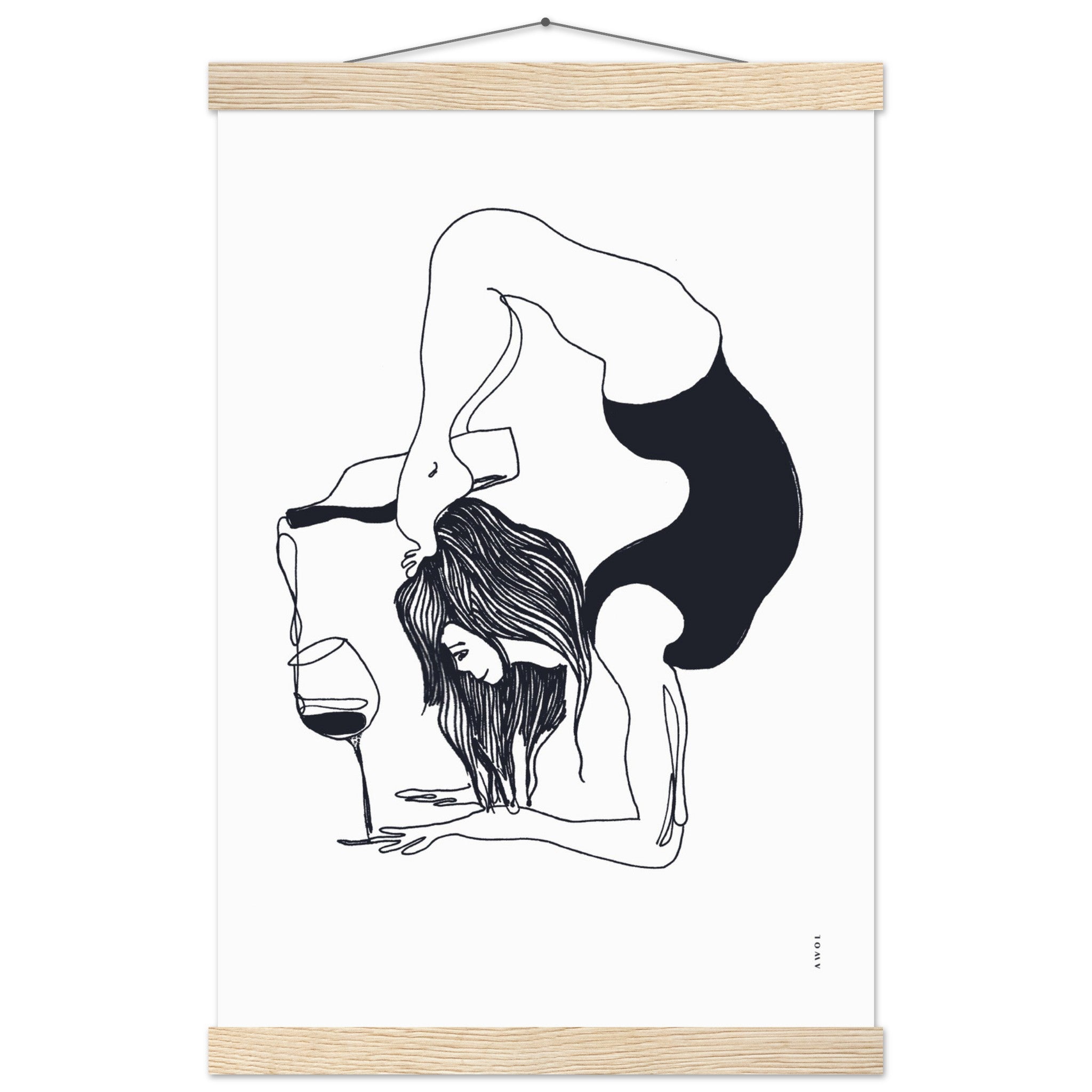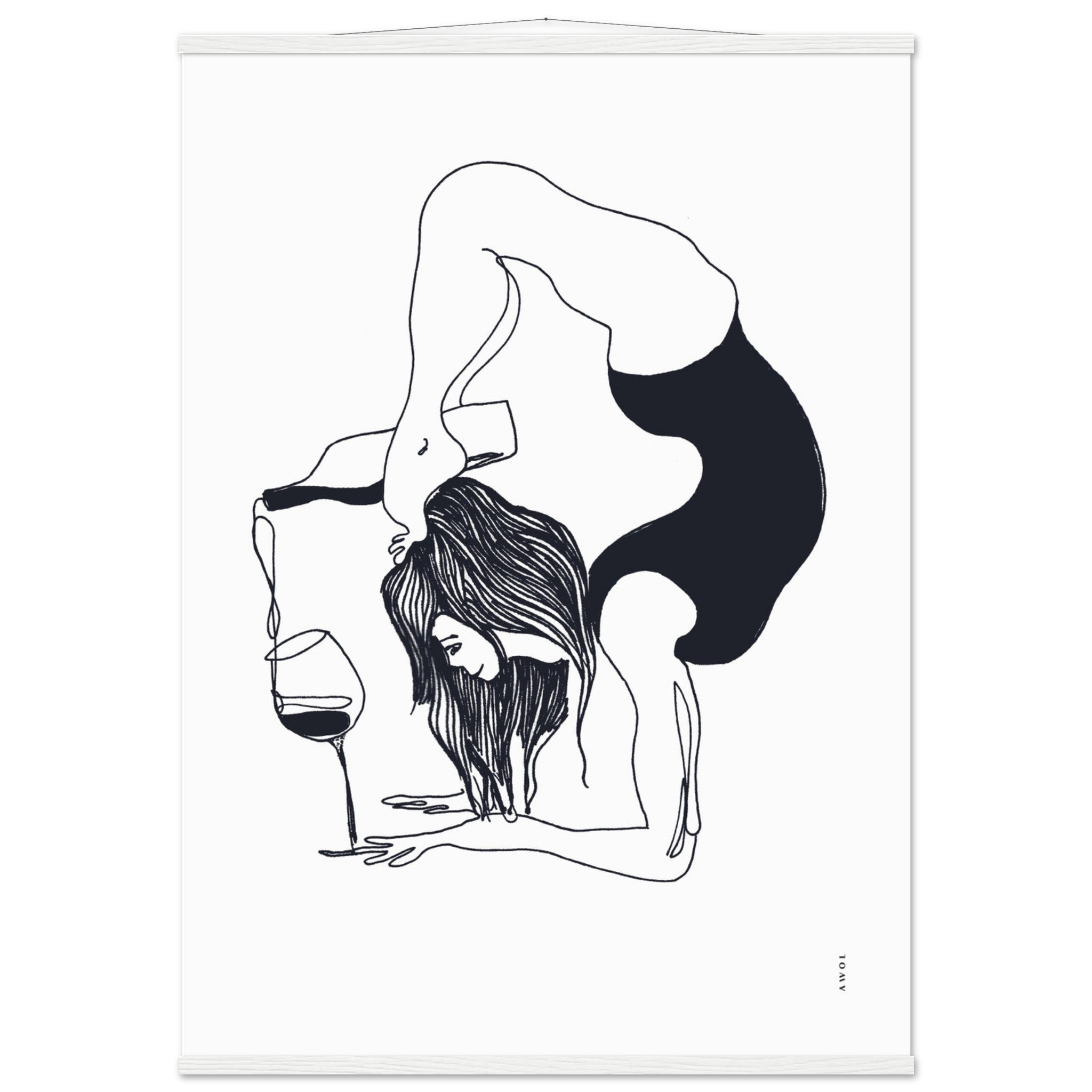 This minimalist yoga art print blends wine, and the art of living yoga in a funny and minimalist black and white art print that is ready to hang. A woman pours a bottle of wine into a glass while practicing yoga, her focus unwavering. The juxtaposition of the ancient art of yoga with the love of wine creates a delightful, large minimalist wall art poster for any wall decor, reminding us that life is indeed all about balance. Rendered in a minimalist black and white contemporary art style, this fun yoga artwork is sure to bring a smile to your face as it adorns your home decor, yoga studio or interiors – whether you’re looking for unique art or for a cool gift for your girlfriends. This minimalist yoga illustration, born out of personal exploration, meditation, yoga practice and a love of wine, is more than just wall art — it’s an exploration of the art of living your yoga, the importance of mental health awareness and a positive attitude. It’s a reminder to find balance and lightness in everyday life, and to always keep a sense of humour, in life and in your yoga practice.