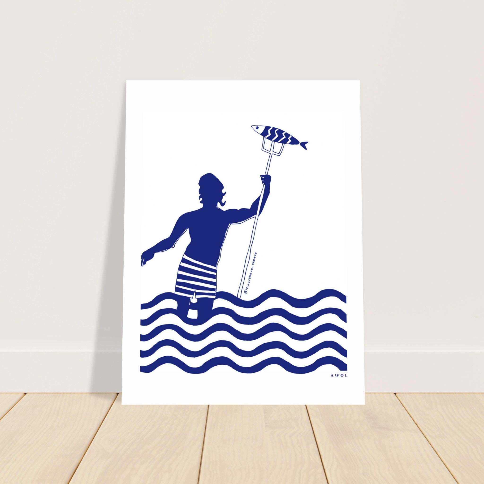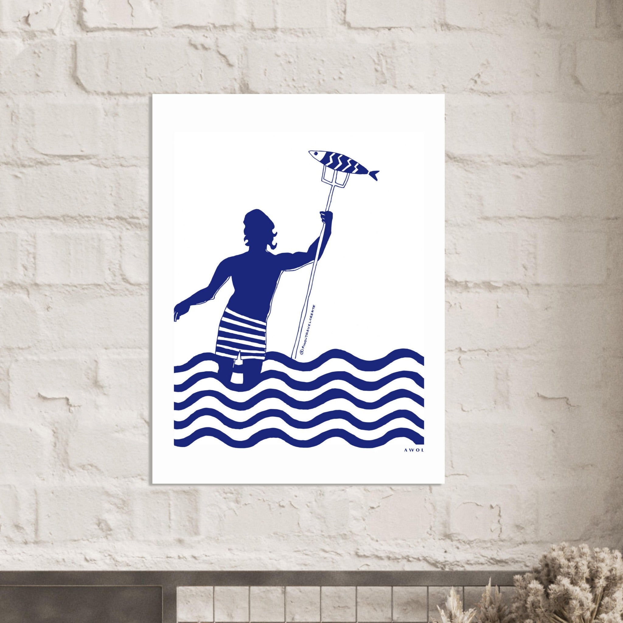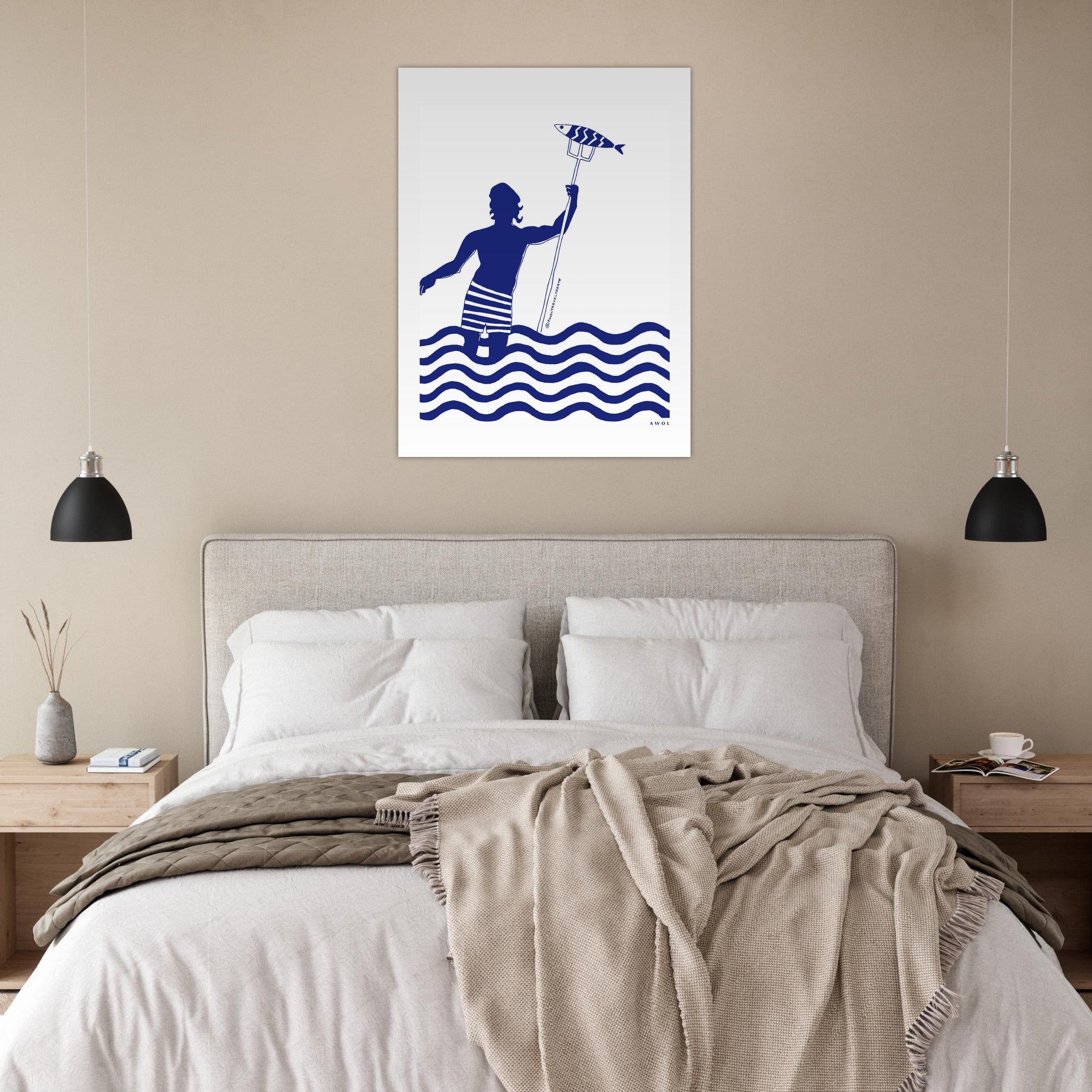 This Mediterranean wall art is a modern Greece wall art in a minimalist, graphic blue and white style art print and white depicting a young man in a striped bathing suit coming out of the sea, victoriously holding a fish he has just caught. A playful modern travel poster and beach wall art inspired by Greek Island hopping, Mediterranean vacation destinations, a slow pace of living, and of course, a fun twist on mythical god of the seas, Poseidon. In this nautical wall decor poster, the graphic blue and white patterns, bold geometric shapes and blue and white stripes are a modern rendition capturing the best of vacation, travel and lifestyle on the Med: island hopping, swimming in the pristine blue seas, relaxing on the beach, and o course, eating delicious seafood. This beachy artwork is a perfect fit for any home decor style, boho or travel wall decor, and it also makes a cool gift for men who love to fish, swim or travel.