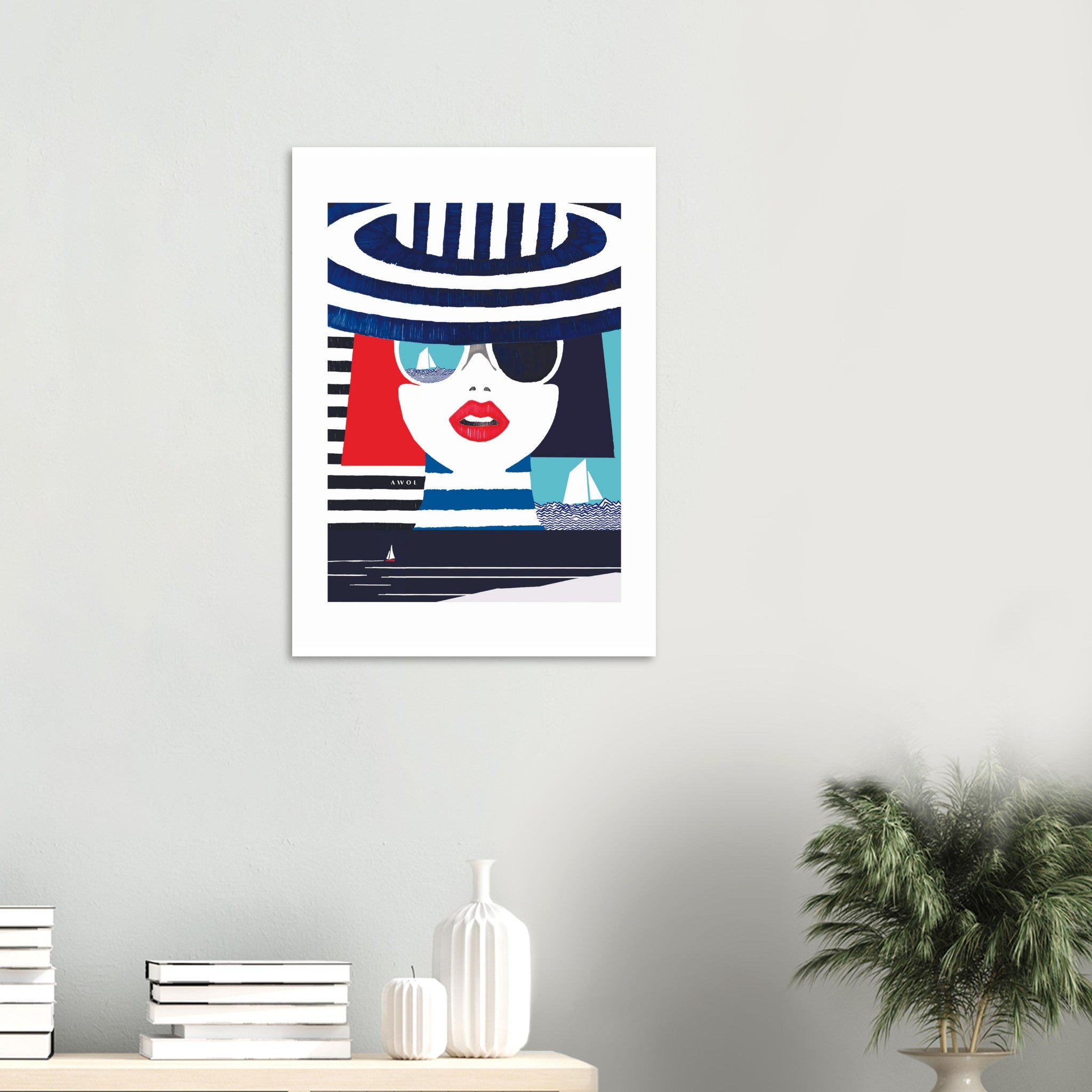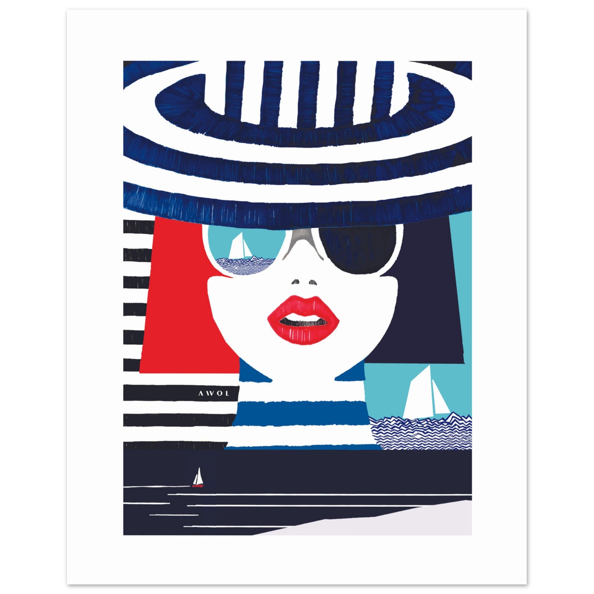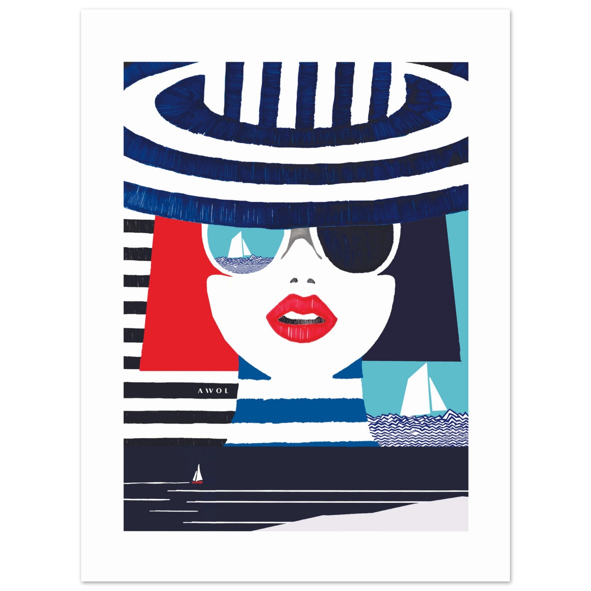 This Mediterranean wall art is a graphic art portrait of a beautiful, glamorous and modern woman on a beach in chic European style: wearing an oversized striped beach hat, red lipstick and sunglasses looking out at the Mediterranean sea, a white sailboat reflected in her eyes — an escapist vacation artwork, relaxing by the the azure water of the Mediterranean Sea. This beach wall art with a summer colour palette of red, blue, white and black and the graphic blue and white stripes add a contemporary art style to this colourful wall art, fusing a bold, modern and graphic aesthetic with beachside elegance. This France and Italy riviera travel art print will bring the stylish energy of the French Riviera and Italian Riviera destinations to your wall decor, from St. Tropez to Monaco and Portofino to the Amalfi Coast, energizing your home decor with a beachy aesthetic, modern Mediterranean elegance, vacation vibes and and a bold print of coastal living for your living room, bedroom, hallways, office decor or beach house.