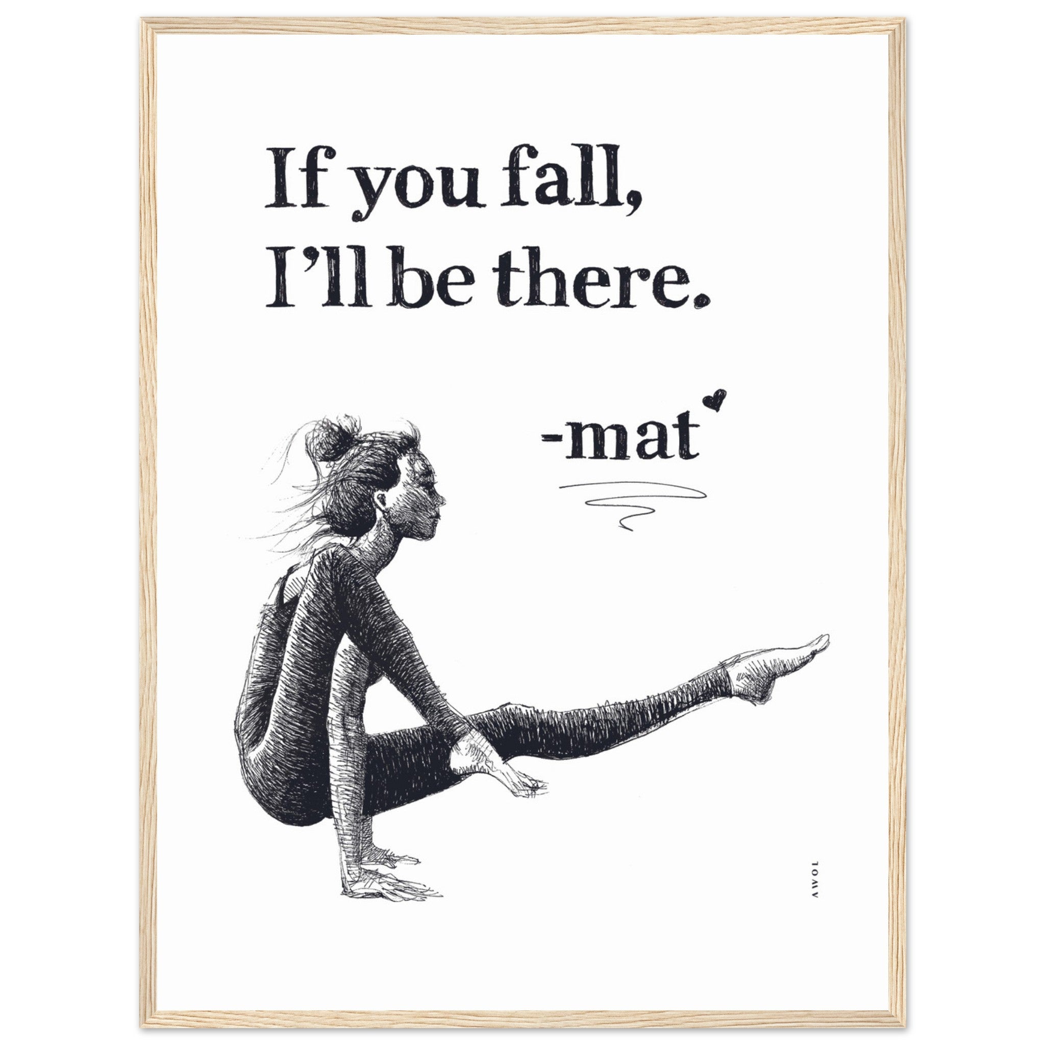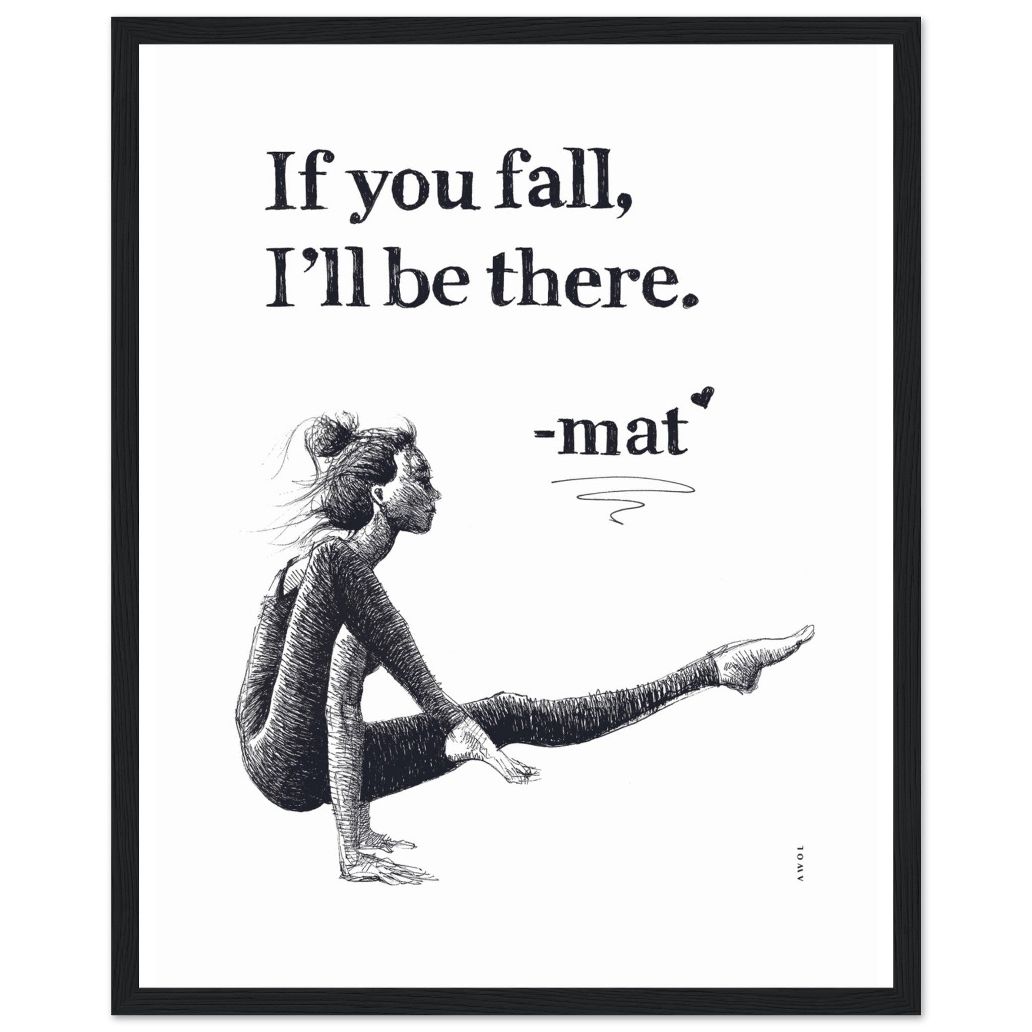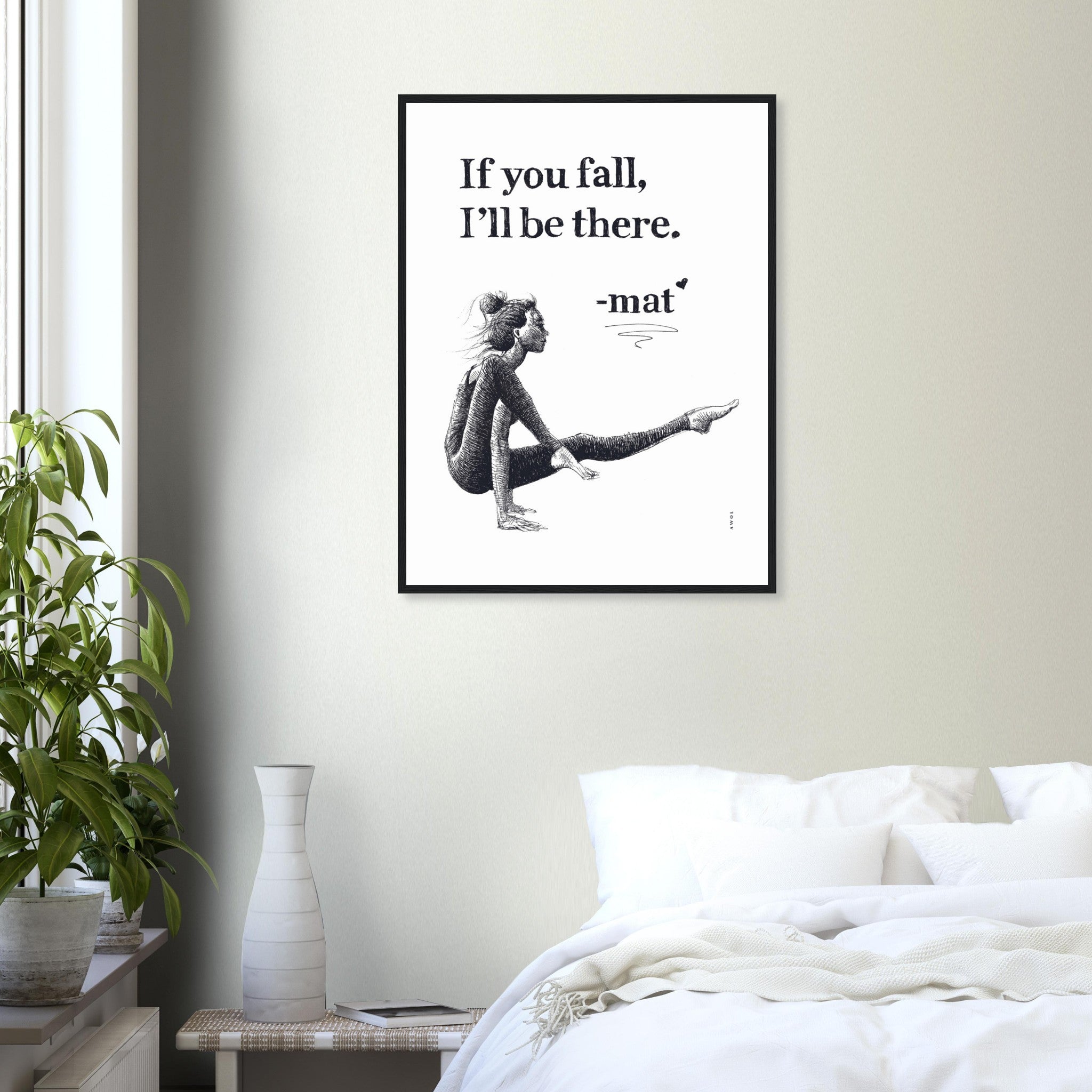 This yoga framed art print with a detailed black and white illustration of a woman gracefully engaged in a yoga pose and inspiring quote is a mental health poster with a positive affirmation and supportive quote from her yoga mat : “If you fall, I’ll be there.” This large framed wall art blends the art of yoga with positive thinking, wellness with physical balance, friendship and support through life’s tougher periods and challenges. This monochrome wall art print is ready to hang, and comes with a wooden frame: the mindful quote, detailed drawing and zen attitude of her yoga practice create a harmonious blend of the art of yoga on and off the mat. This wall art print serves as a daily affirmation, manifesting resilience and strength. It is a modern wall decor art print for your yoga studio, meditation or wellness spaces, or home decor, encouraging mindfulness and positive thinking. It also makes a unique and thoughtful gift to a friend who may be going through a difficult time, or simply loves practicing yoga.