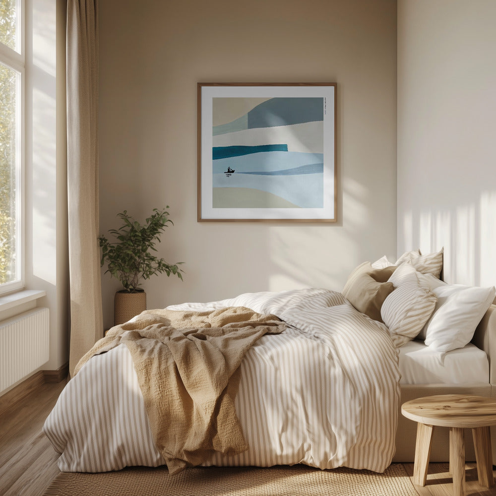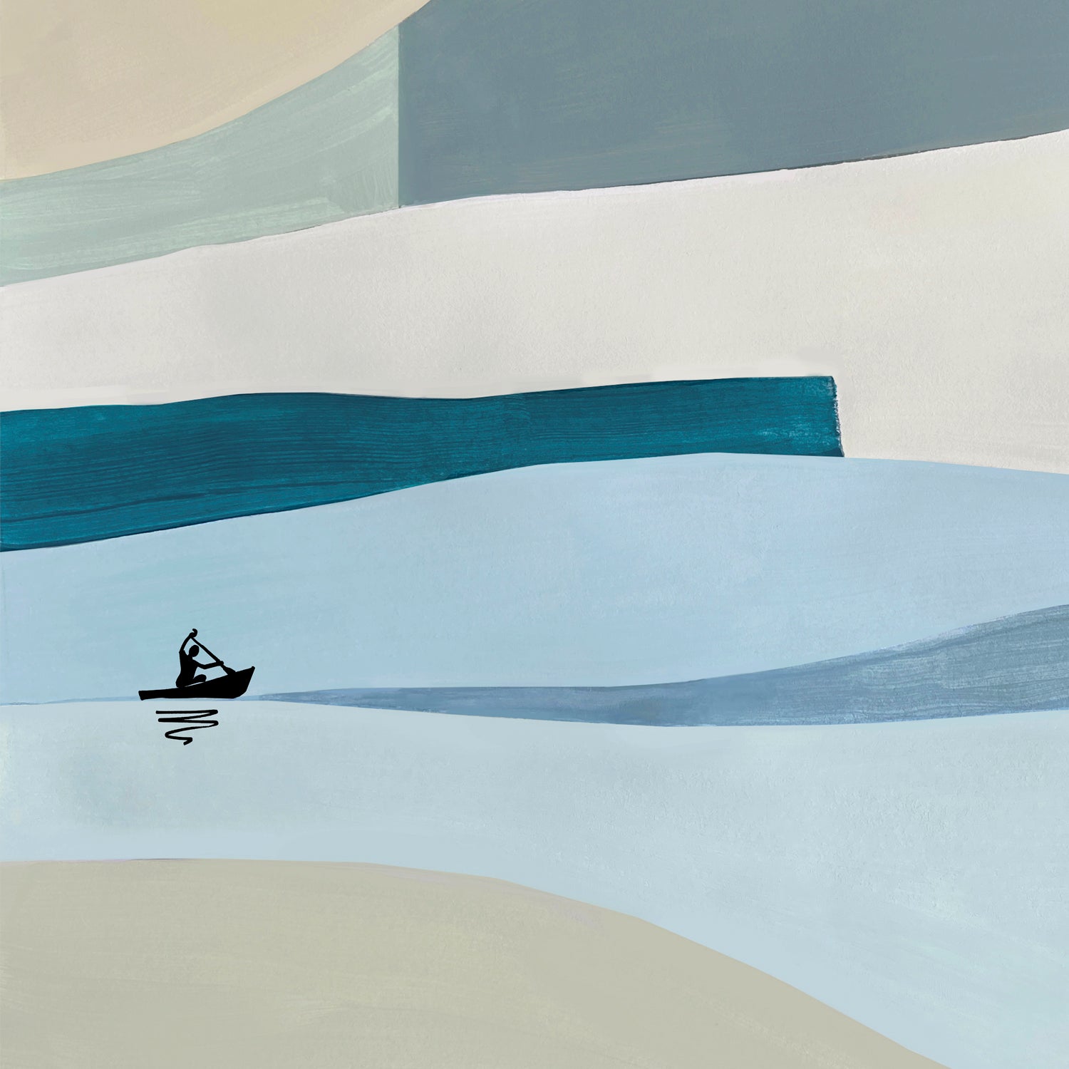 Add movement, calm, and a contemporary nautical art accent to your space with this square, ready-to-hang abstract minimalist art print. Featuring a black silhouette of a man in a kayak boat navigating stylized waters, this contemporary nautical wall art captures the dynamic beauty of nature through soothing modern design. Organic, fluid shapes suggest a river, rapids, or open sea, painted in a serene palette of pastel blue, teal, gray, sandy beige, and off-white. The striking contrast between the small figure and the expansive water evokes both solitude and exploration. With bold contrast in scale and a mix of modern geometric patterns, this minimalist seascape art balances softness and structure for a calming yet powerful statement. Hand-painted using gouache, acrylic, collage, and drawing techniques, this original Canadian boat art print draws inspiration from Quebec’s landscapes—from Montreal’s Lachine Canal to the St. Lawrence River and beyond. Perfect for coastal homes, modern interiors, and lovers of minimalist, nautical, abstract art or nature-inspired decor.