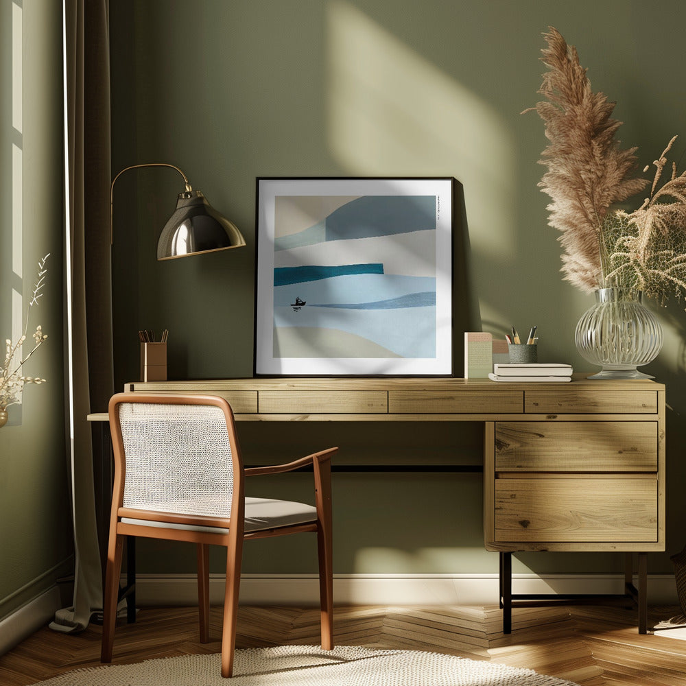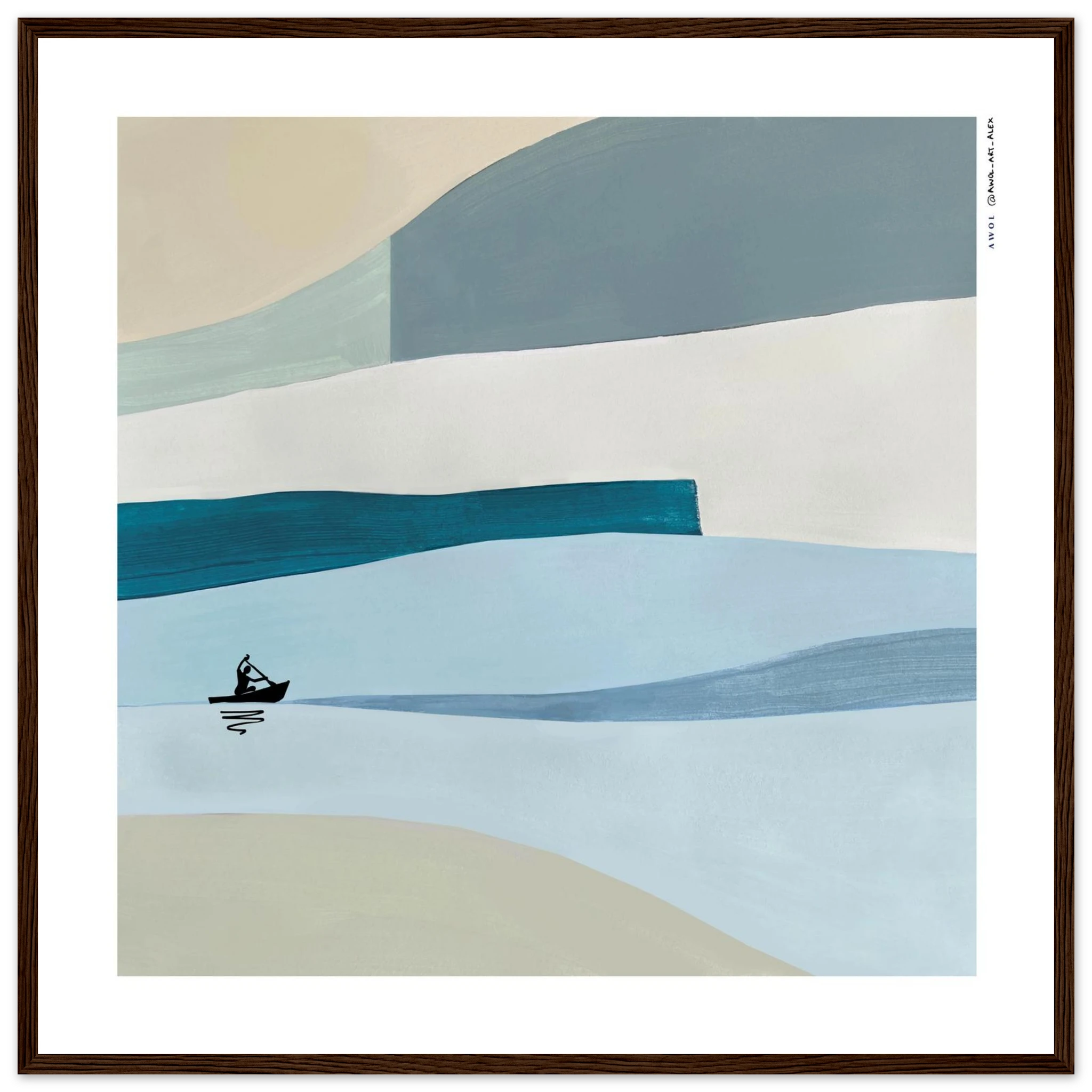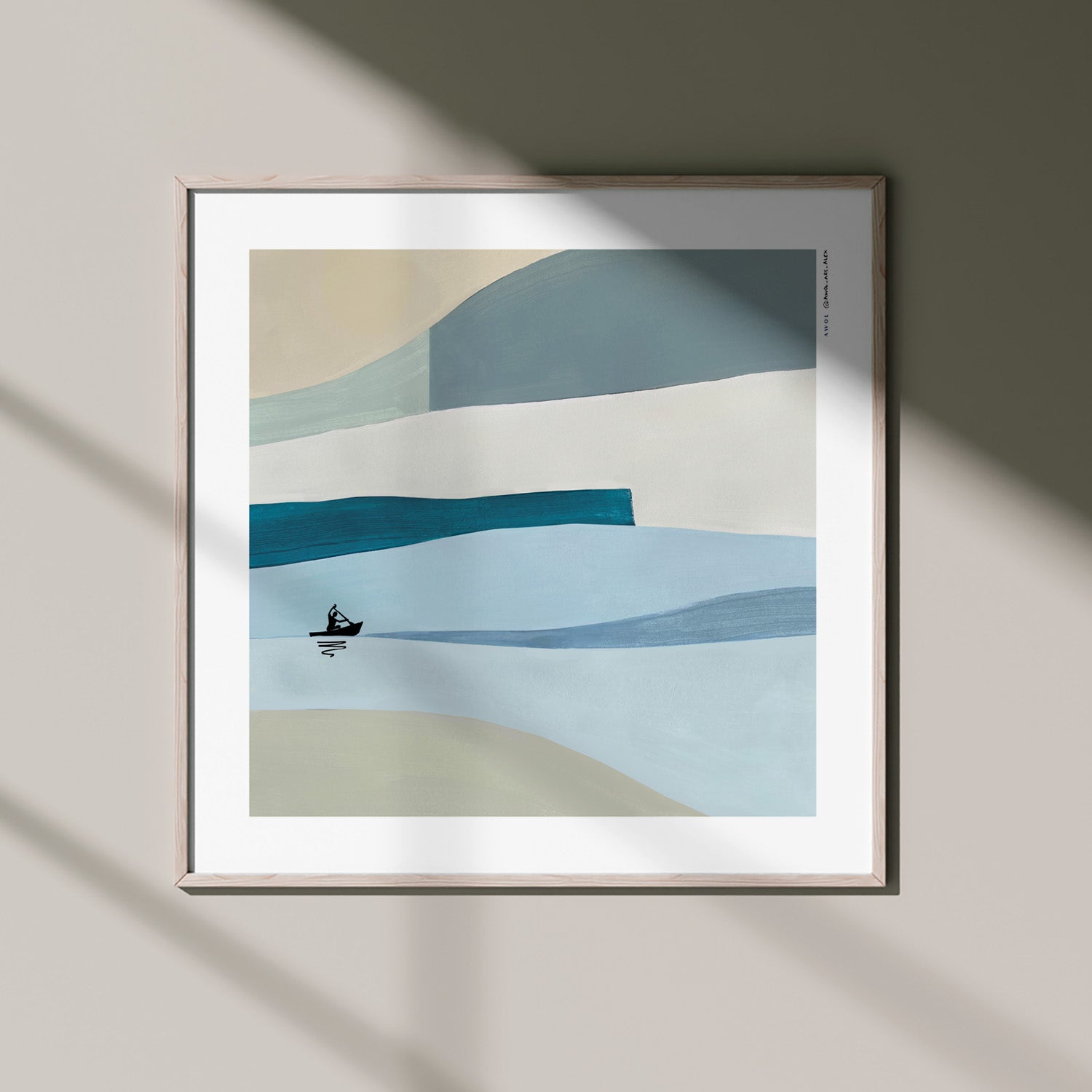Add a modern coastal art accent to your space with this square framed art print — a ready-to-hang framed wall art piece that blends minimalist design, nautical themes, abstract art, water, and water sports, in a minimalist style. Featuring a black silhouette of a man in a kayak boat navigating abstract water, this contemporary framed art print captures the spirit of outdoor adventure with calming, design-forward aesthetics. With its blend of organic, abstract shapes and a serene colour palette of pastel blue, teal, gray, sandy beige, and off-white, this framed art print evokes the rhythm and energy of a river, rapids, or open sea. The striking contrast between the small kayaker and the expansive water creates a powerful sense of scale and introspection. Hand-painted with gouache, acrylic, collage, and drawing techniques, this Canadian artwork draws inspiration from Quebec’s waterways — from Montreal’s Lachine Canal to the St. Lawrence River. Perfect for coastal homes, modern interiors, and anyone who appreciates minimalist, nautical, or nature-inspired framed wall art – ready to hang, and add some flow to your wall decor.