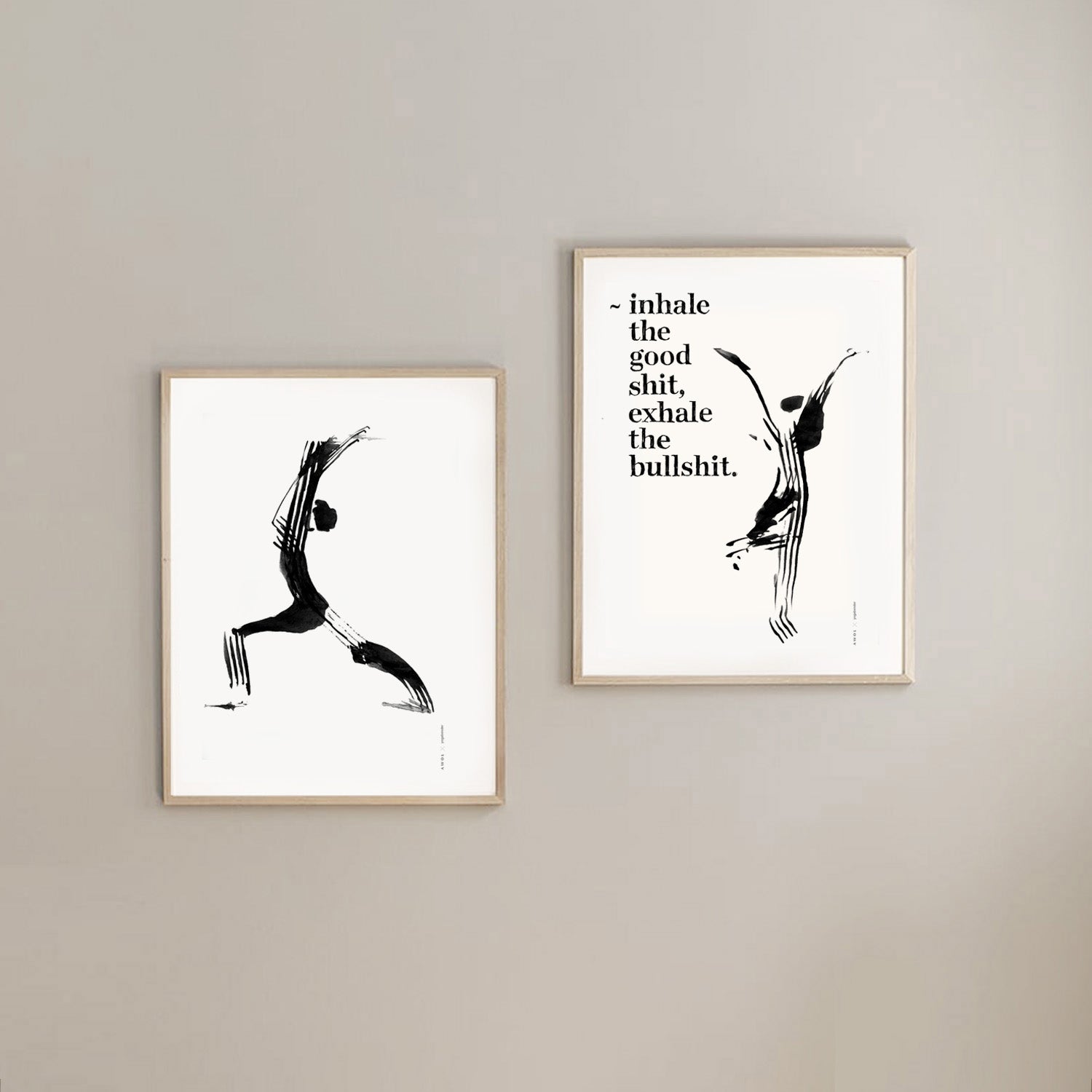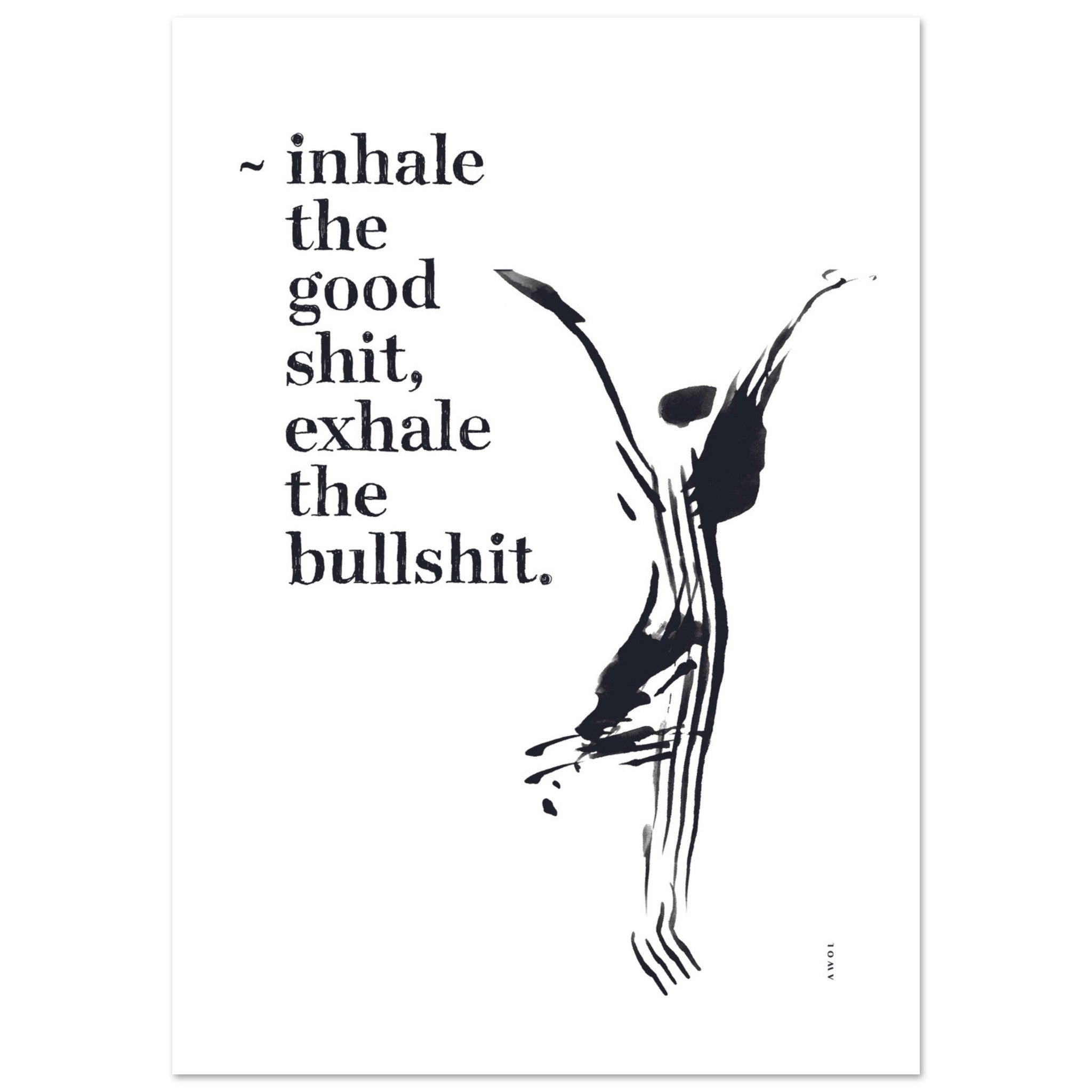 This modern black and white yoga art print is a monochrome yoga painting using black ink and a unique hand-painted illustration technique ( using a fork instead of a paintbrush ) to create the abstract yoga pose with open arms – tree pose. The fun inspirational quote, ‘Inhale the Good Shit, Exhale the Bullshit, is a positive affirmation that adds a touch of positive thinking and a fun daily mantra to your home decor, yoga studio or meditation wall art. The modern typography is hand lettering drawn with pen and ink. This funny yoga wall poster is a good vibes, zen artwork to encourage positive thinking, good mental health, and mindful living. It makes a cool gift for yoga and meditation lovers and friends, infused with positivity, joy and a reminder to embrace a happy outlook on life. A minimalist wall art print that will add a contemporary spiritual twist to your home and wall decor.