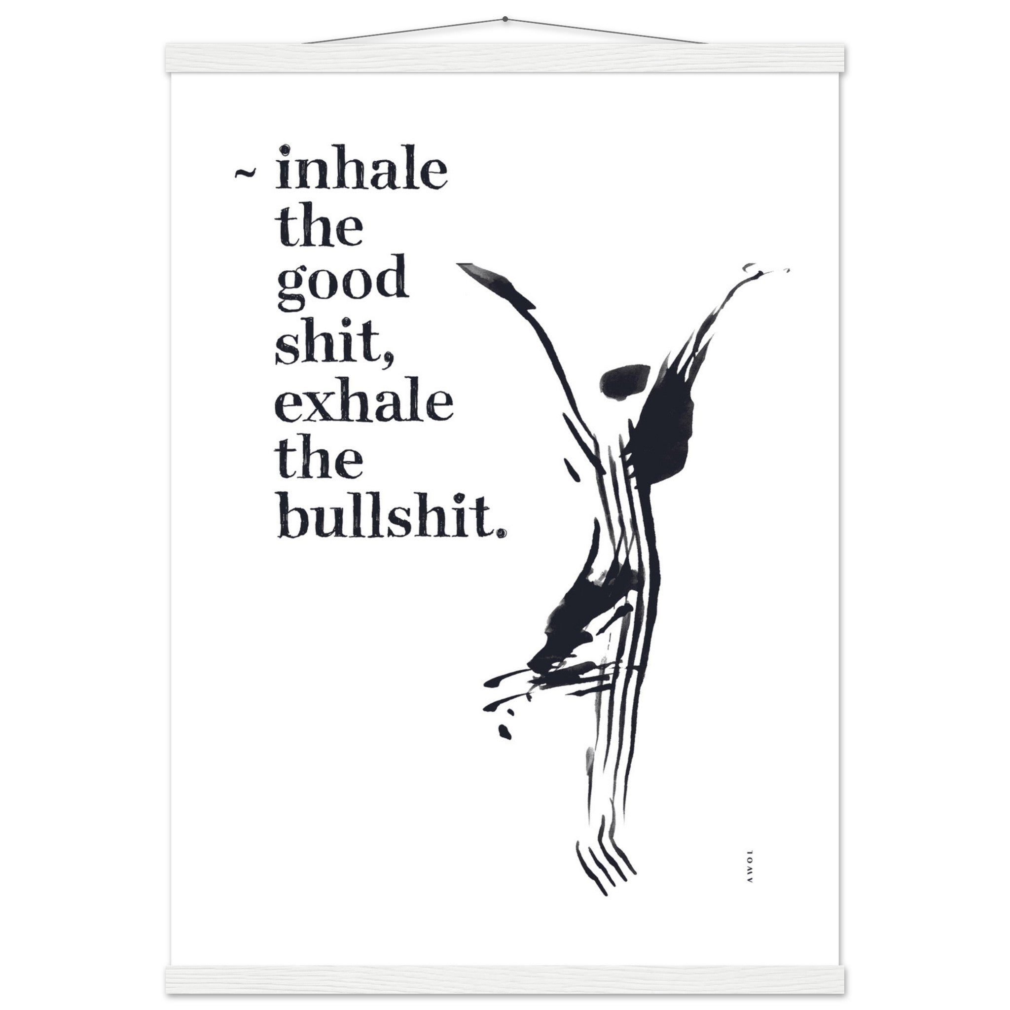 A playful twist on spirituality with this modern and funny spiritual zen quote. This hand-painted yoga art print features a whimsical, minimalist black and white illustration of a woman in a zen yoga pose, capturing the essence of finding inner peace with a fun twist, merging the art of yoga with good mental health and a positive affirmation. The hand-drawn mindfulness poster print features a contemporary typographic hand illustrated quote, bringing the yoga pose to life and evoking a sense of happy vibes, optimism, and spiritual humour. Paired with the fun quote, “Inhale the good shit, exhale the bullshit” this empowering art print combines positive thinking, modern spirituality and a refreshing dose of humour and zen. Embrace the balance between the art of living yoga, laughter and a positive outlook with this “Zen Attitude” daily mantra art print, celebrating the joy of mindful living. This poster print is ready to hang in your yoga studio, meditation space or home decor, adding good vibes to any room, and making a fun gift for your friends.