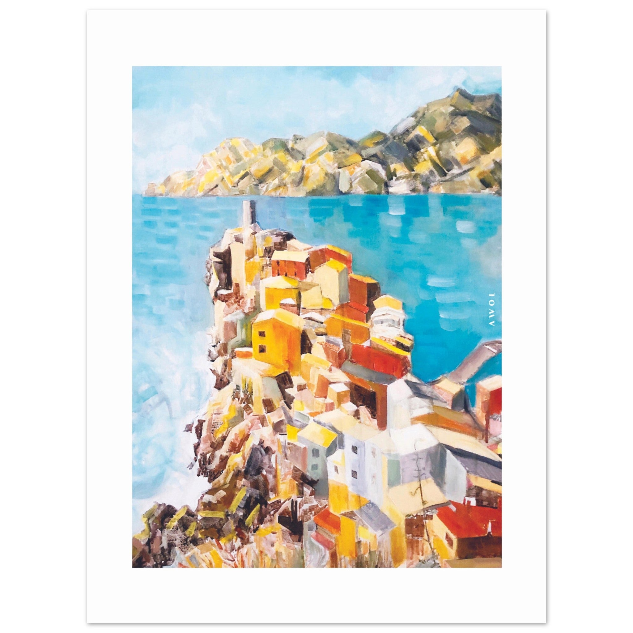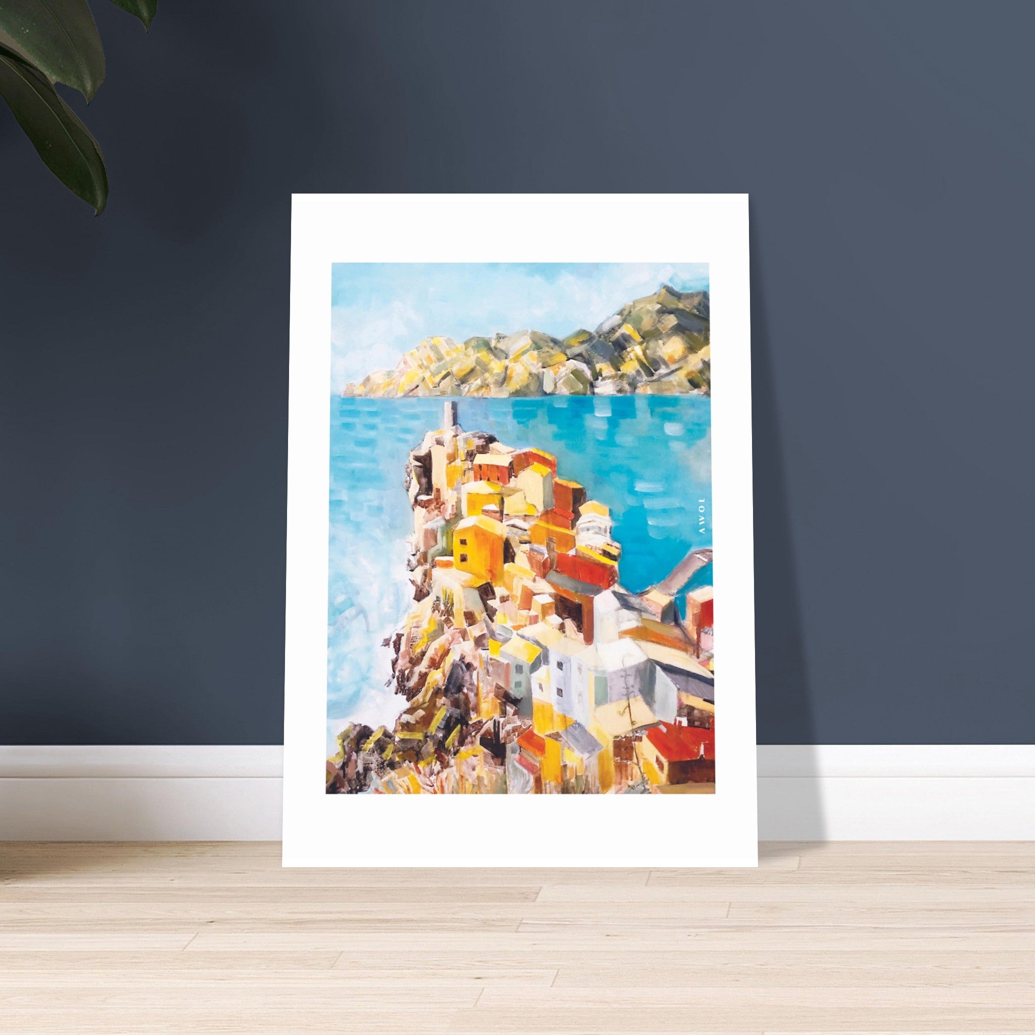 This Italy travel poster depicts the Italian Riviera, Liguria and the beautiful Amalfi Coast, further south. These beautiful seaside Italian destinations, from Cinque Terre, to Capri, are postcard perfect Italian landscapes made of small towns perched on cliffs overlooking the sea. This Mediterranean wall art print is a fine art print where charming small Italian towns adorned with colorful red, yellow, blue, and green houses, sit perched above the sparkling Mediterranean sea. Surrounded by azure blue skies, hills, mountains, and olive groves, this modern landscape wall poster captures the essence of the mythical Ligurian Coast and the Amalfi Coast . Perfect for bringing a dose of Italy scenery art, sunshine, outdoor adventures, pasta delights, and Italian travel art to any space, this Italy landscape artwork makes a thoughtful gift, travel souvenir, or wall art for avid Europe travellers or Italy lovers.