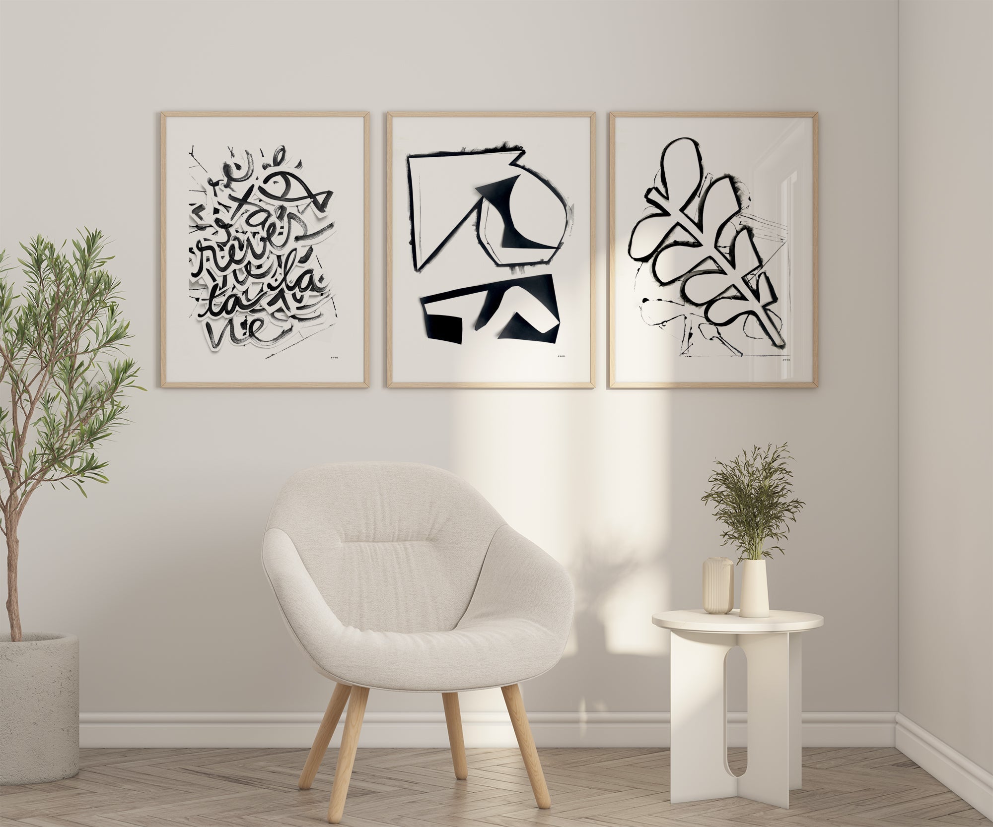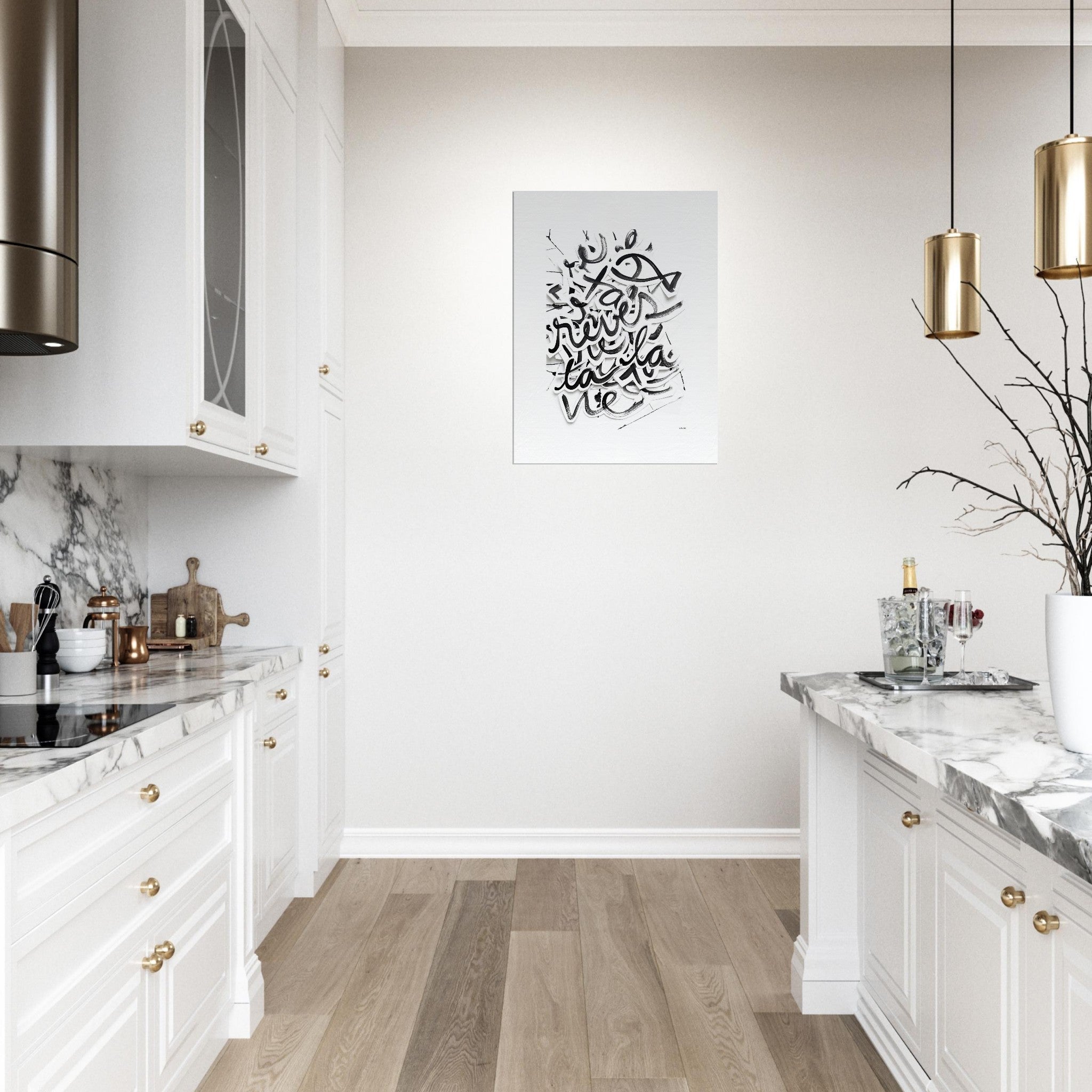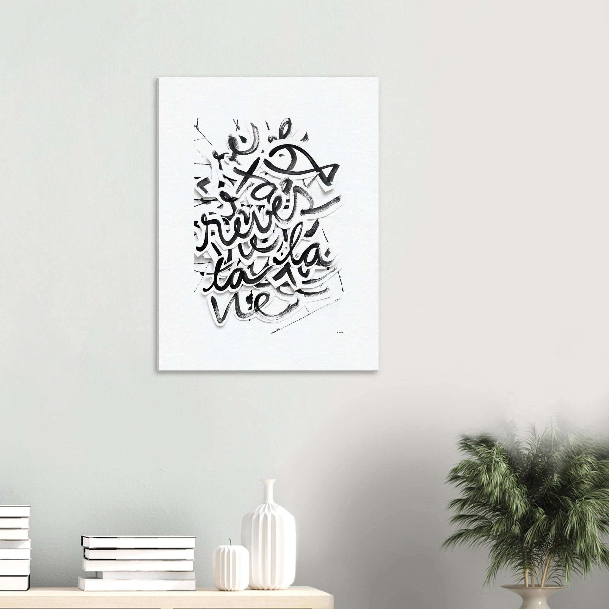 This large modern canvas wall art, hand-painted in black and white letters, combines an inspiring life message with contemporary typography to create a modern monochrome art focal point for your interior decor. At its core is the inspirational quote “Fais de tes rêves ta vie, et de ta vie, un rêve. Signé, la vie”. “Make of your dreams, your life, and of your life, your dreams”. The words were hand painted on paper, then cut out using a decoupage technique, and re-assembled in an abstract composition of hidden messages on top of which rests a fish – significant of its rich symbolism of freedom, curiosity and consciousness. The black and white abstract wall art on canvas combines hand lettering, typography, paper cutouts and textured layered effects to add a modern yet timeless elegance to any home decor while accentuating striking contrasts and positive energy, creating a unique focal wall painting for any living room, living space or work environment needing a little love and inspiration. More than just a print, it’s a minimalist artwork that invites tactile exploration, adding an extra dimension to your decor, and a smile to your heart.