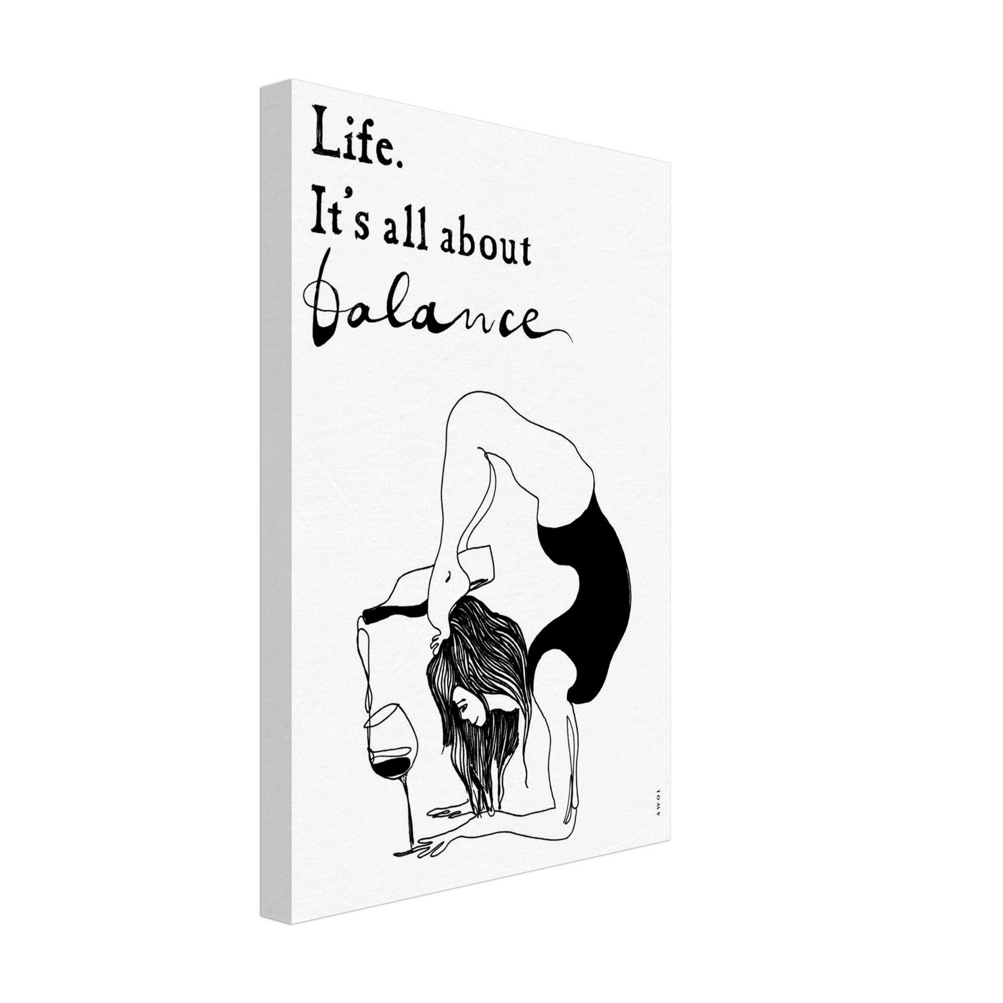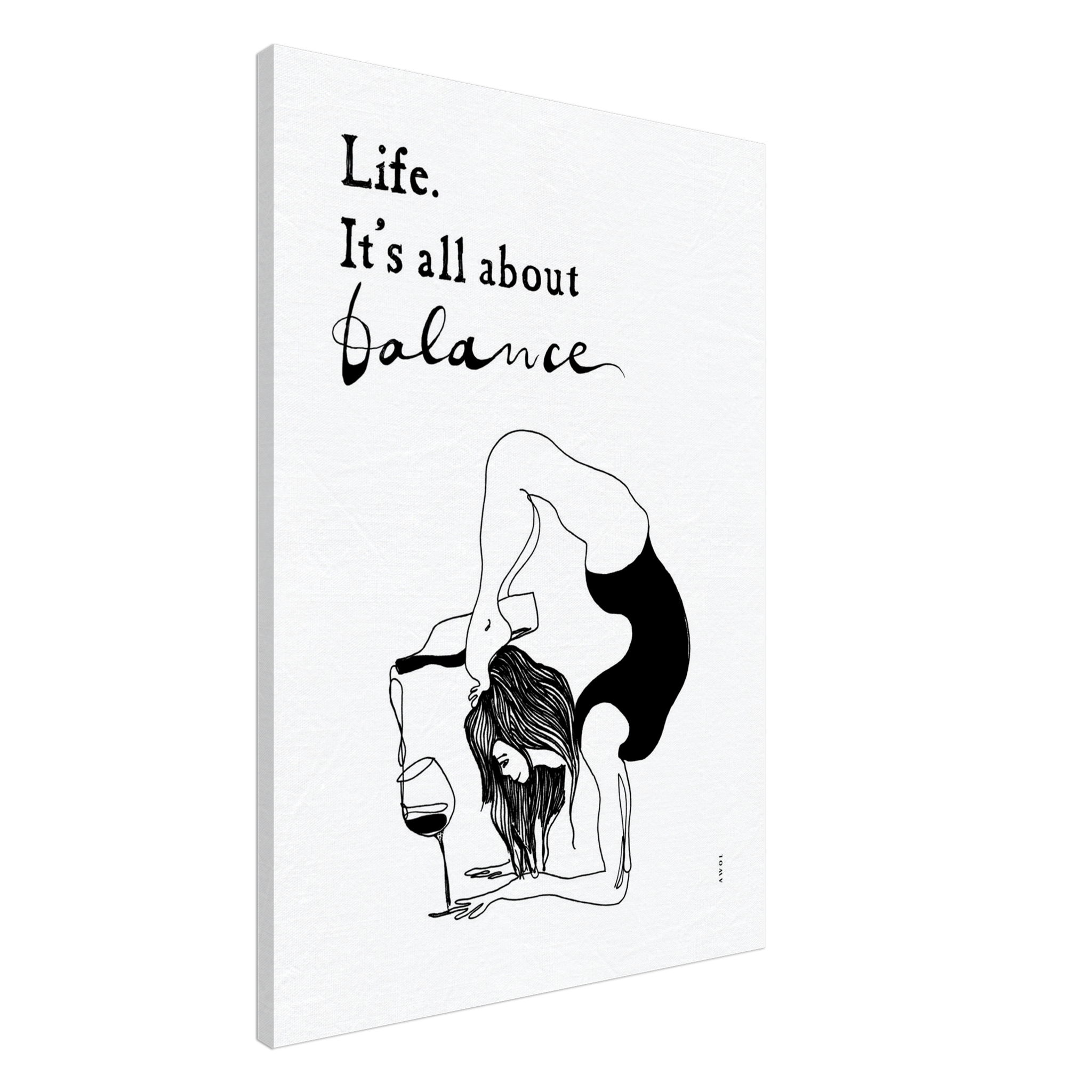 This funny yoga wall art on canvas blends humour and a funny life quote in a monochrome minimalist yoga art print. A woman in a yoga pose pours a bottle of wine into a glass, her focus unwavering. The juxtaposition of the ancient art of yoga with the modern indulgence of wine creates a delightful paradox, reminding us that life is indeed all about balance. Rendered in a modern, black and white minimalist illustration style, this modern canvas art print is sure to bring a smile to your face as it adorns your wall decor – whether you’re looking for art for your yoga studio, meditation space or for your home decor. This fun spiritual art print, born out of personal exploration, meditation, life wisdom and a dedicated yoga practice, captures life lessons that come with age, wine and experience. It’s more than just wall art — it’s an explorations into the art of yoga, the importance of mental health awareness and a positive attitude. It’s a reminder to find balance in the chaos of everyday life, and to always keep a sense of humour, in life, theory and in practice.