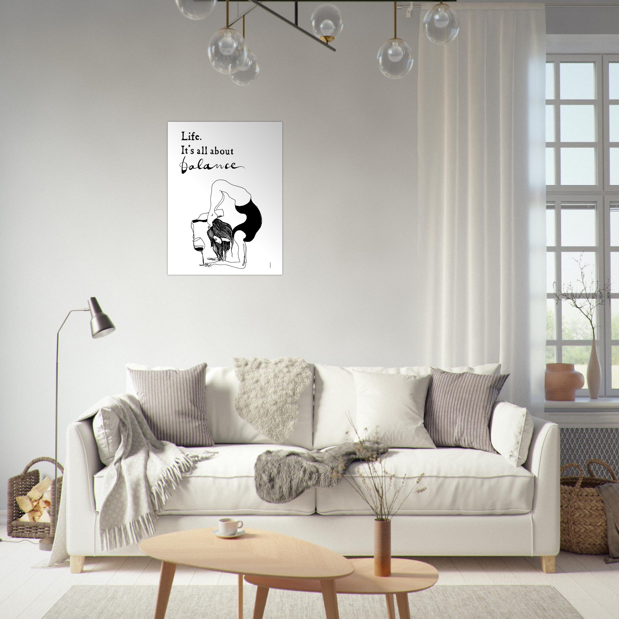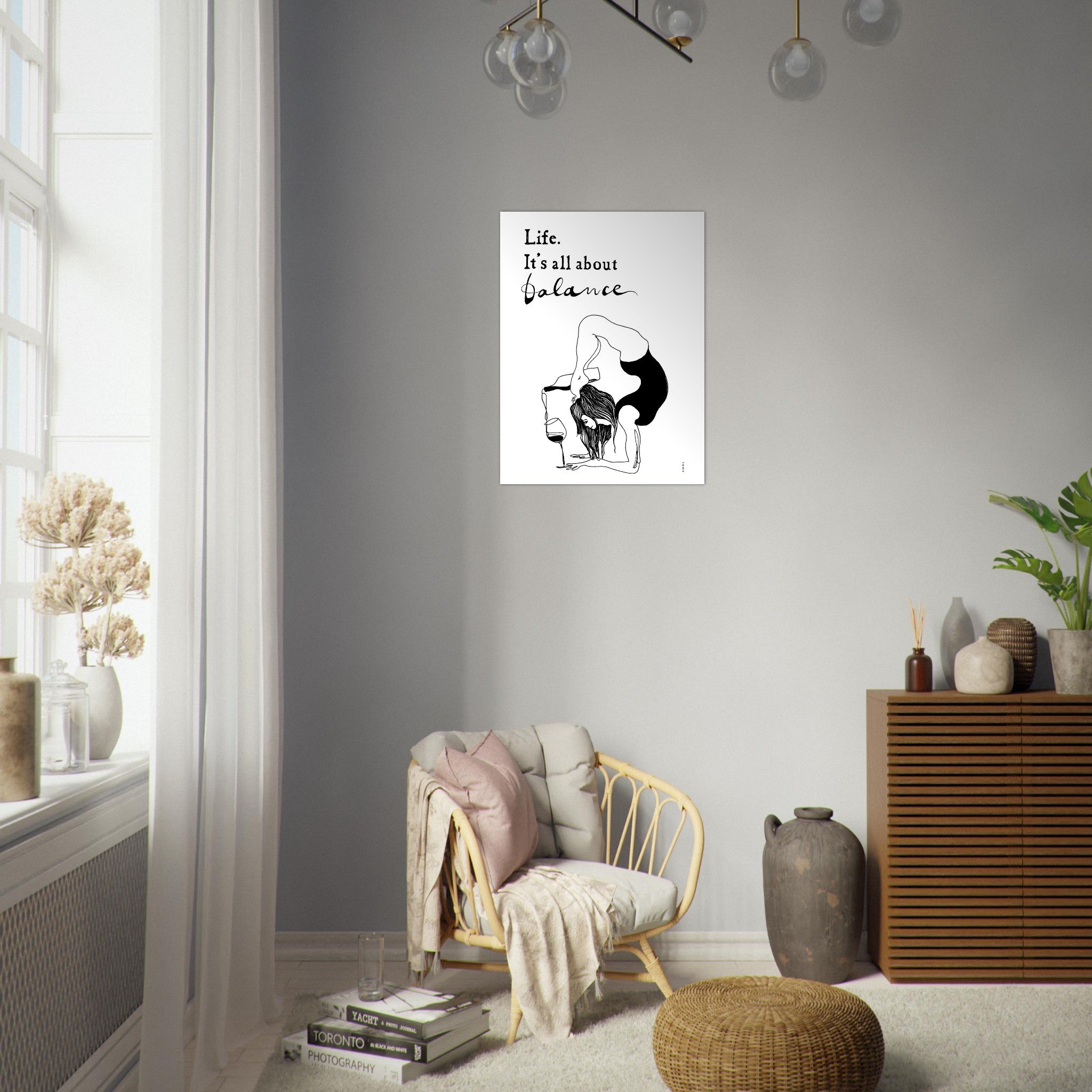 This playful yoga yoga art print with the funny quote “Life. It’s All About Balance” is a modern, black and white artwork of a woman practicing a yoga pose, balancing in a handstand while pouring a bottle of wine – a fun celebration of the art of living yoga and keeping a sense of humour, on a stylish contemporary aluminum art print. This unique yoga artwork is a fun fusion of wellness, spirituality and humour that adds a touch of joy and whimsy to your your spiritual practice, or your wall decor. The black and white minimalist wall art style of this poster print on aluminum not only makes it a chic addition to your yoga studio decor, your home decor, kitchen or office, while also making a thoughtful and funny gift for your yogi friends who like wine, and like to laugh. This yoga and art illustration blends simplicity, fun and laughter – the carefully hand-crafted, minimalist artwork and hand-written message capture the essence of mindfulness and indulgence, showcasing the harmonious blend of self-care and enjoyment, and reminding us all that life’s journey is a delicate dance of equilibrium.