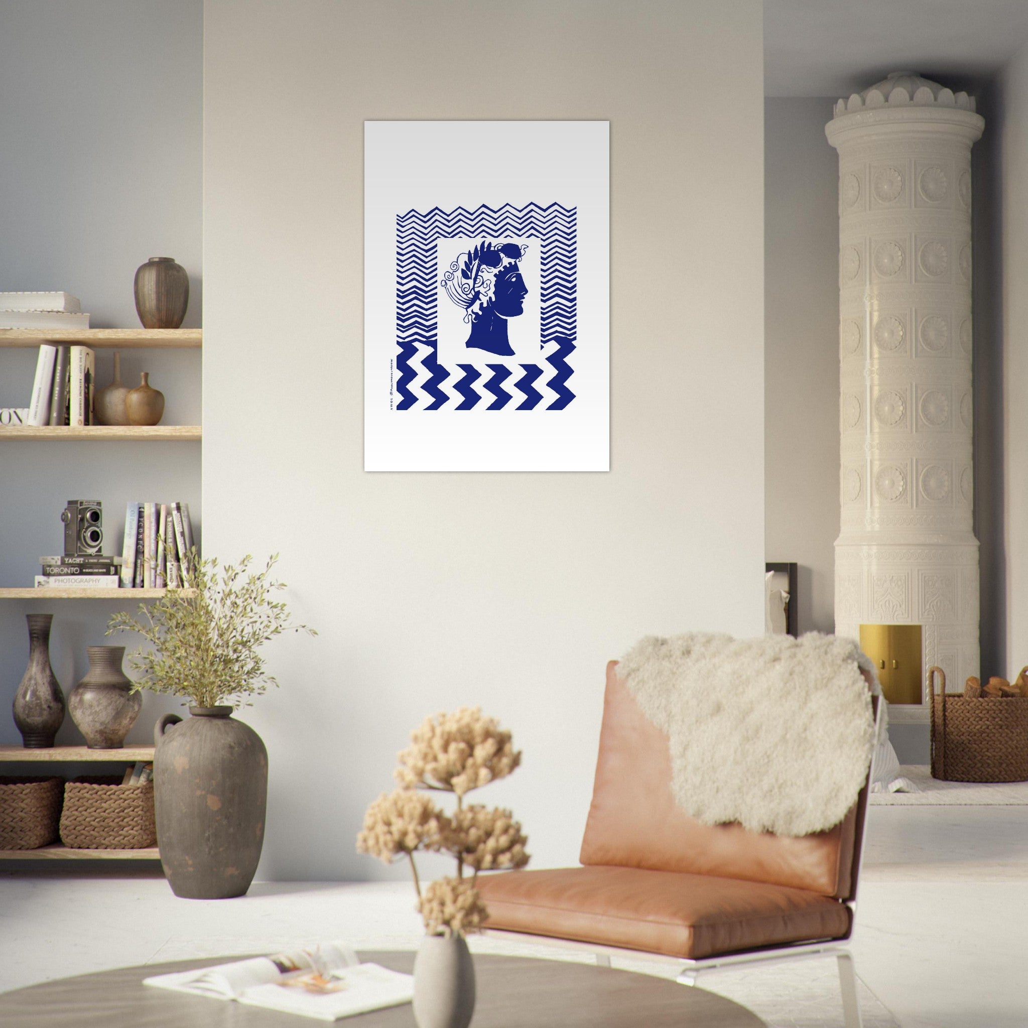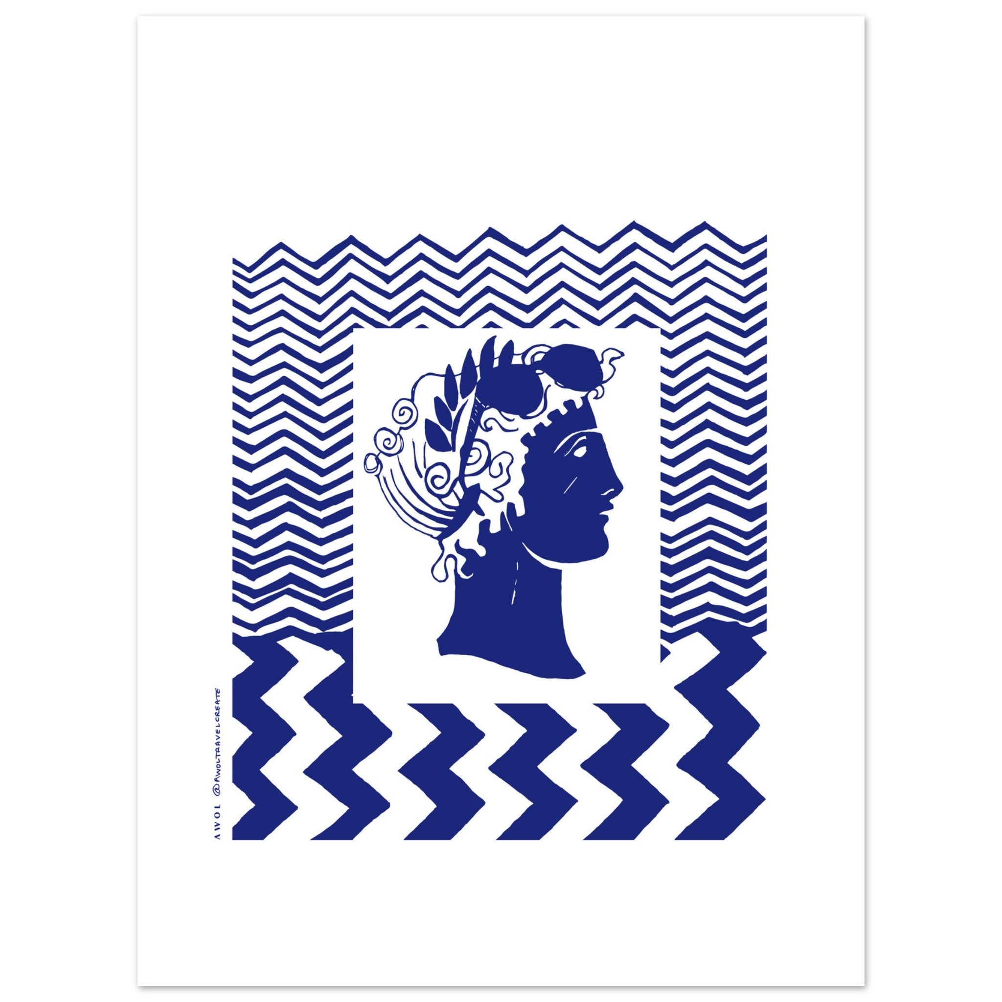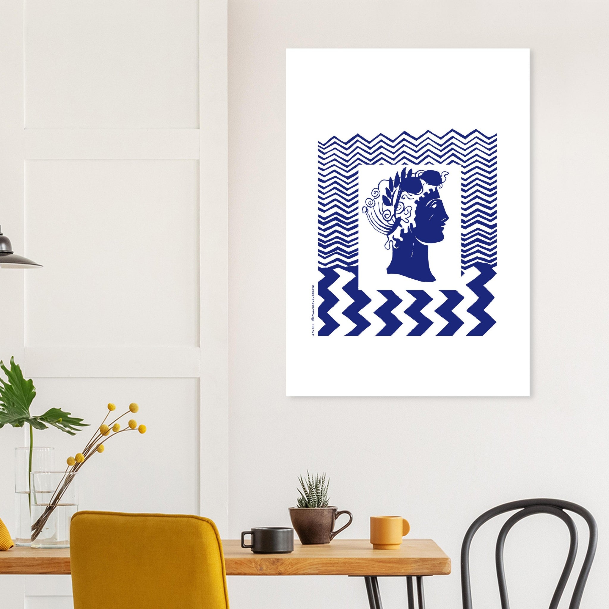 This blue Greece wall print on aluminum is a playful beach artwork of the Greek mythology god of beauty and desire, Adonis. This Greek art print depicts a handsome young man on a beach, wearing sunglasses, looking at an abstract blue seascape – a bold, graphic pattern representing the Mediterranean sea. This nautical poster is a large abstract wall art print in a minimalist art style, mixing a modern Greece wall art aesthetic with a playful and contemporary design. This abstract art print on aluminum is ready to hang, and was inspired by vacations to Italy, Sardinia, Sicily, Corsica, Spain and the South of France, making a cool wall decor art work for any home decor style. Perfect for those seeking beach artwork, boho or modern travel prints, or a unique Mediterranean vacation design souvenir to gift to your travel lover friends or boyfriend.