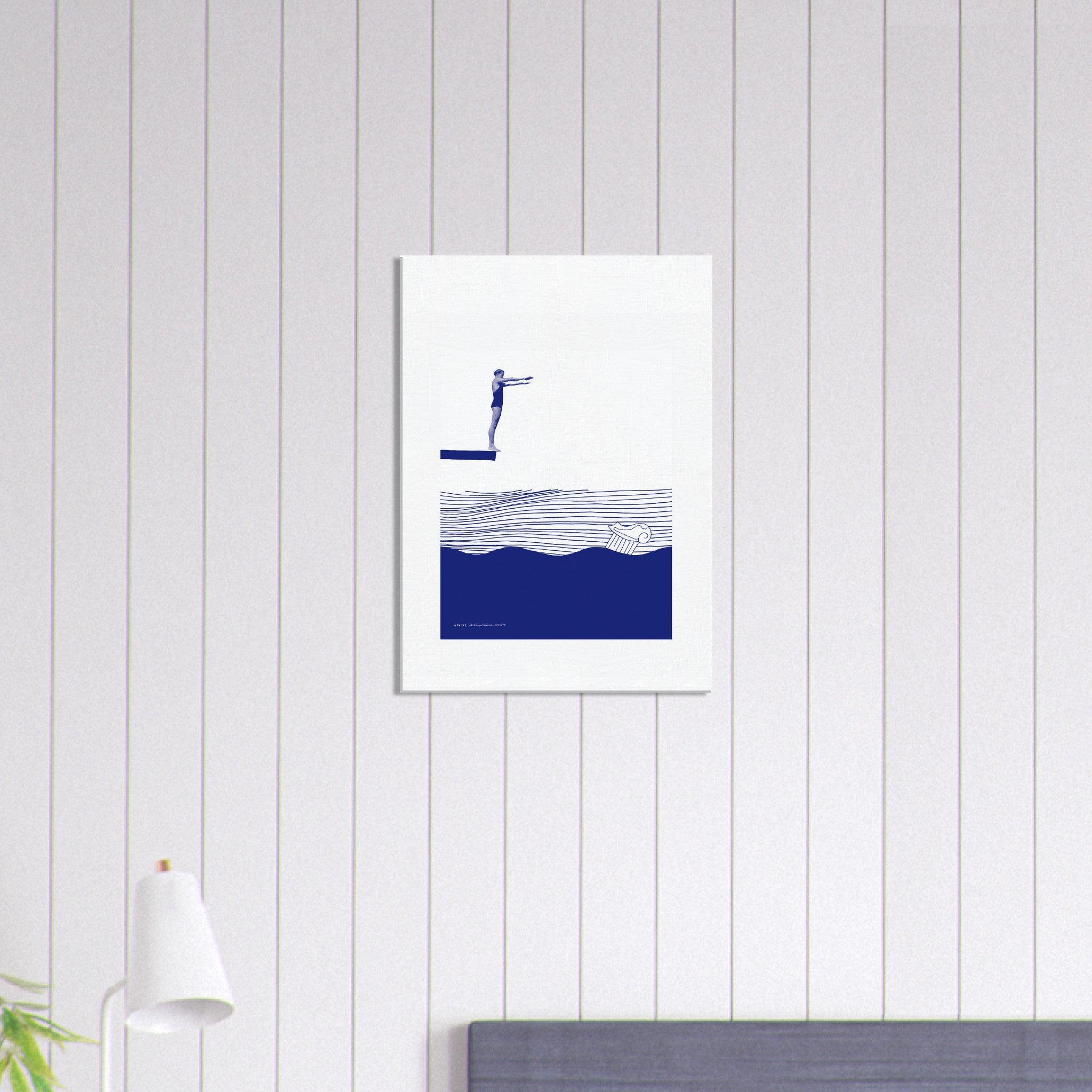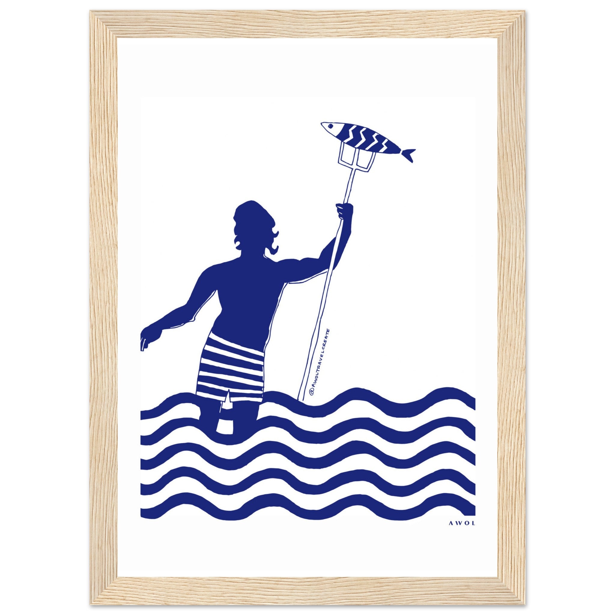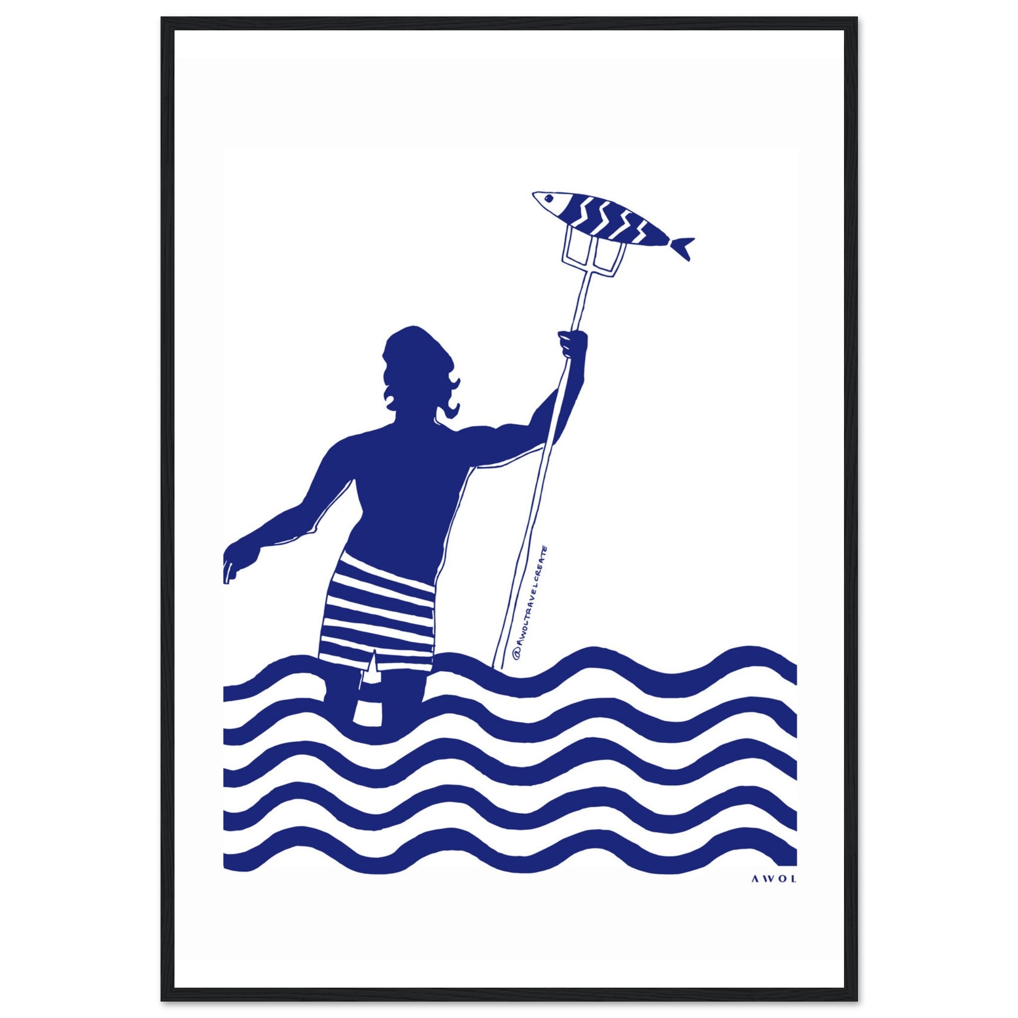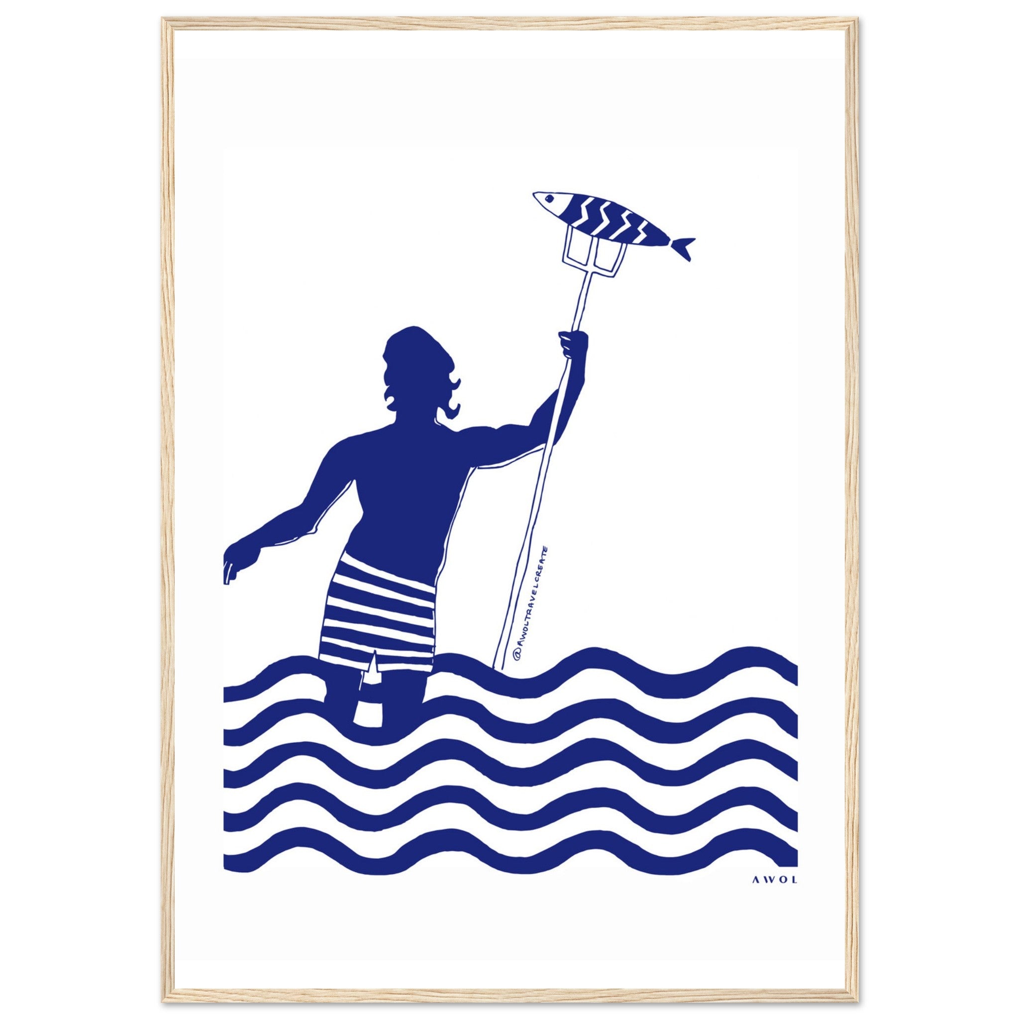 This blue Greece wall art travel print is a fun home decor artwork with a modern twist on the ancient Greek god Poseidon, king of the sea. In this contemporary beach wall art with frame, a handsome man emerges triumphantly from a blue sea made of an abstract, graphic pattern. He is wearing striped swimming trunks and is proudly carrying a fish he caught on a spear. With its bold, abstract art style, this framed wall art print captures the essence of Mediterranean living, beautiful beach destinations, carefree vacation vibes, Greek history… and a good catch of the day. This framed poster will bring sunny vacation vibes and a boho style to any home decor. Perfect for those seeking Mediterranean design or framed prints, this blue sea artwork adds a dash of coastal aesthetic to your living room, bedroom, or office space, serving as a wall decor piece that transports you to the sun-drenched shores and tranquil sea island destinations of the Mediterranean region.