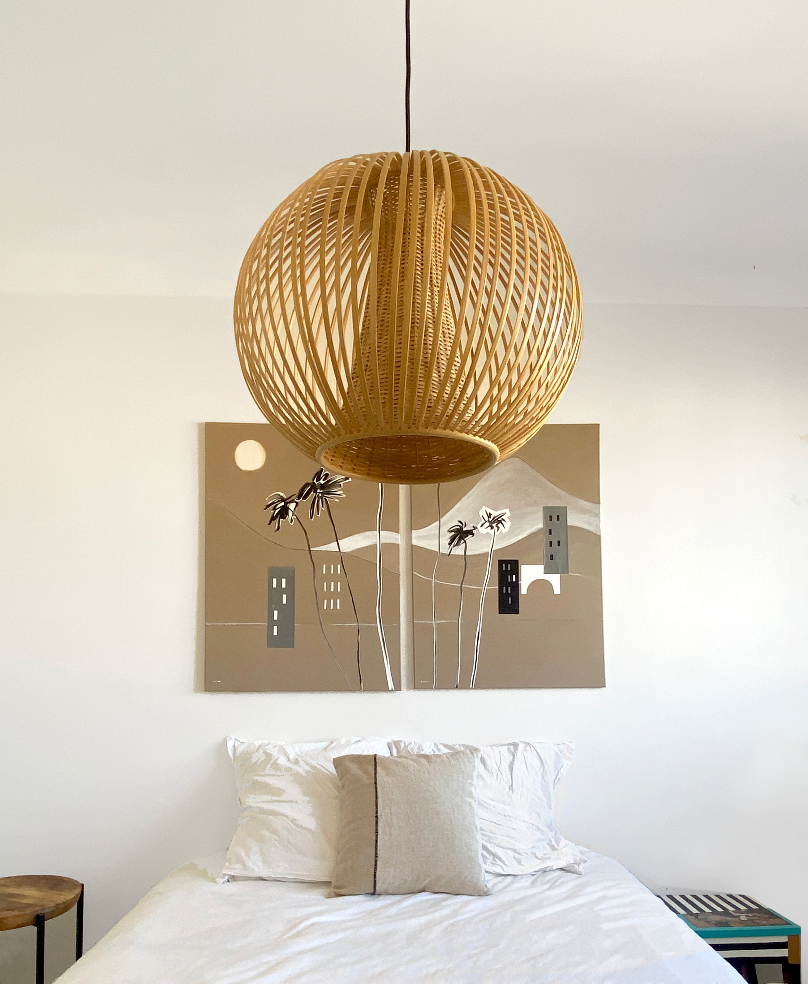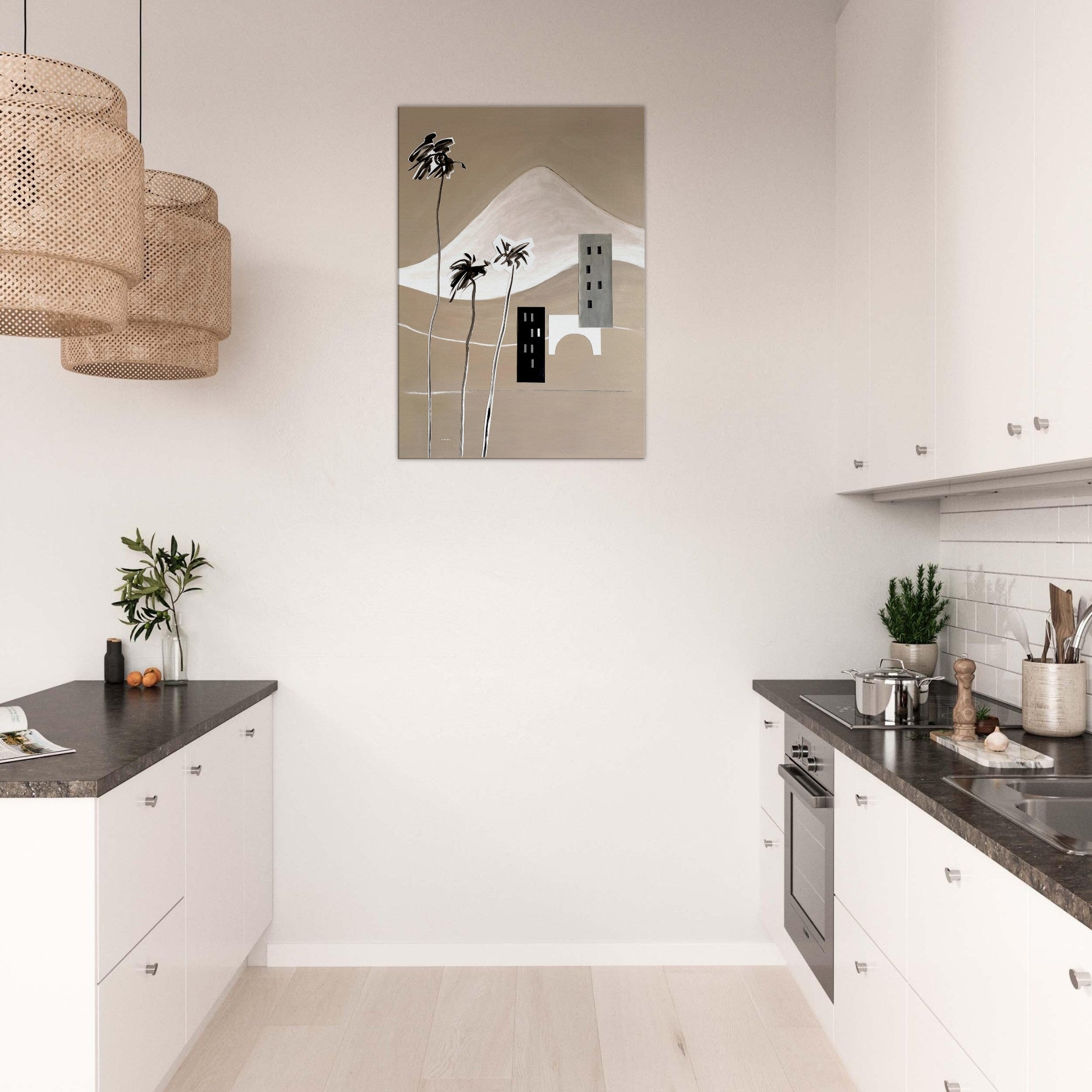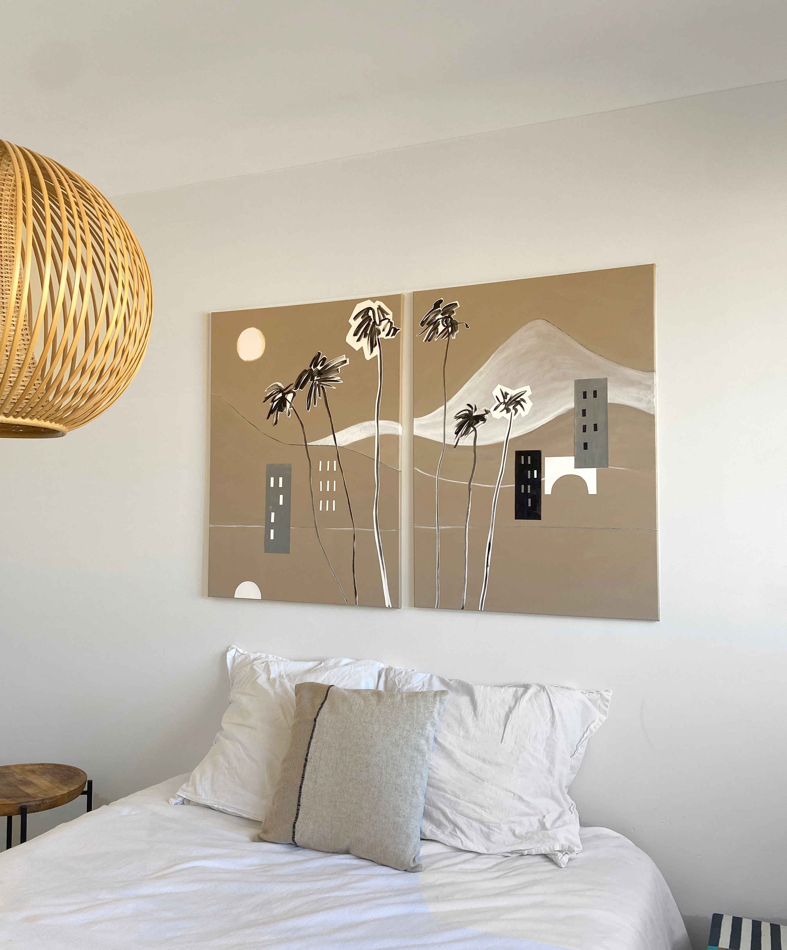 This large abstract wall art is a print on canvas with a modern abstraction of mountains, palm trees and a graphic landscape of a bridge and buildings by the sea. It is a Mediterranean scenery wall art collage created using landscape painting on canvas, drawing, painting and paper cutouts to depict Italian scenery and South of France coastal landscapes. The graphic landscape art print has bold, graphic shapes in neutral contrasting colours representing small towns and villages. The snow-capped French and Italian Alps mountains serve as a backdrop to this monochrome, minimalist wall art in black, white and neutral beige colours, evoking balmy Mediterranean breezes, tall palm trees swaying in the wind, overlooking the Mediterranean sea. This abstract art print is part of a two piece canvas art series meant to bring beautiful travel destination art to your wall decor, and a dose of wanderlust and modern Mediterranean design to your office space, living room, bedroom or hallway art.