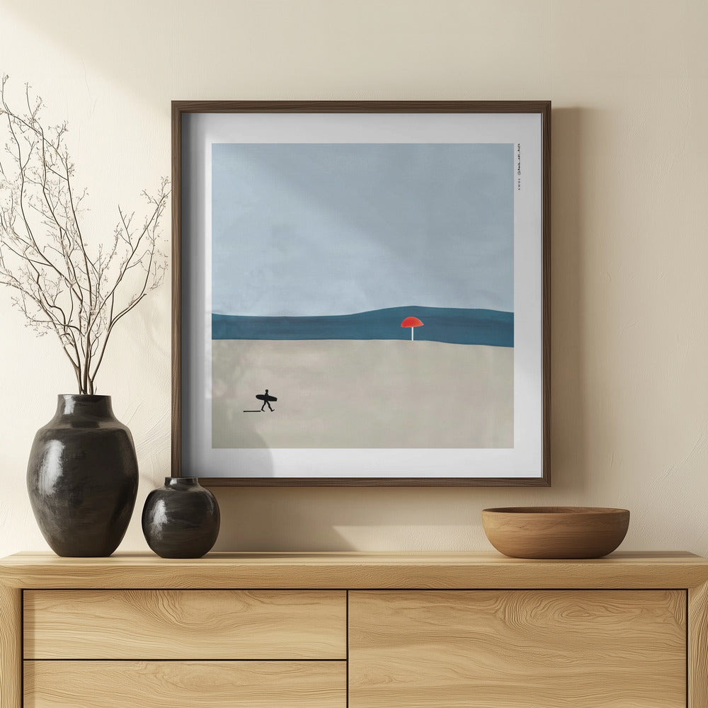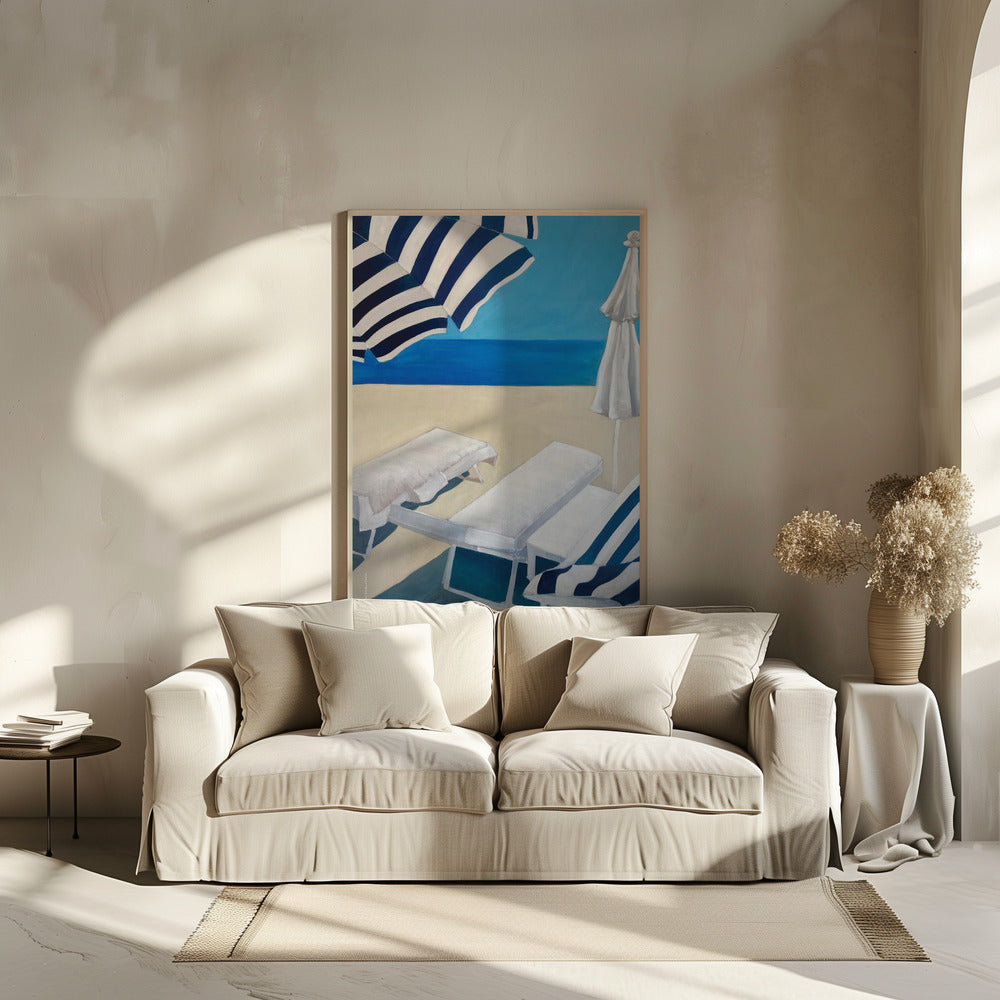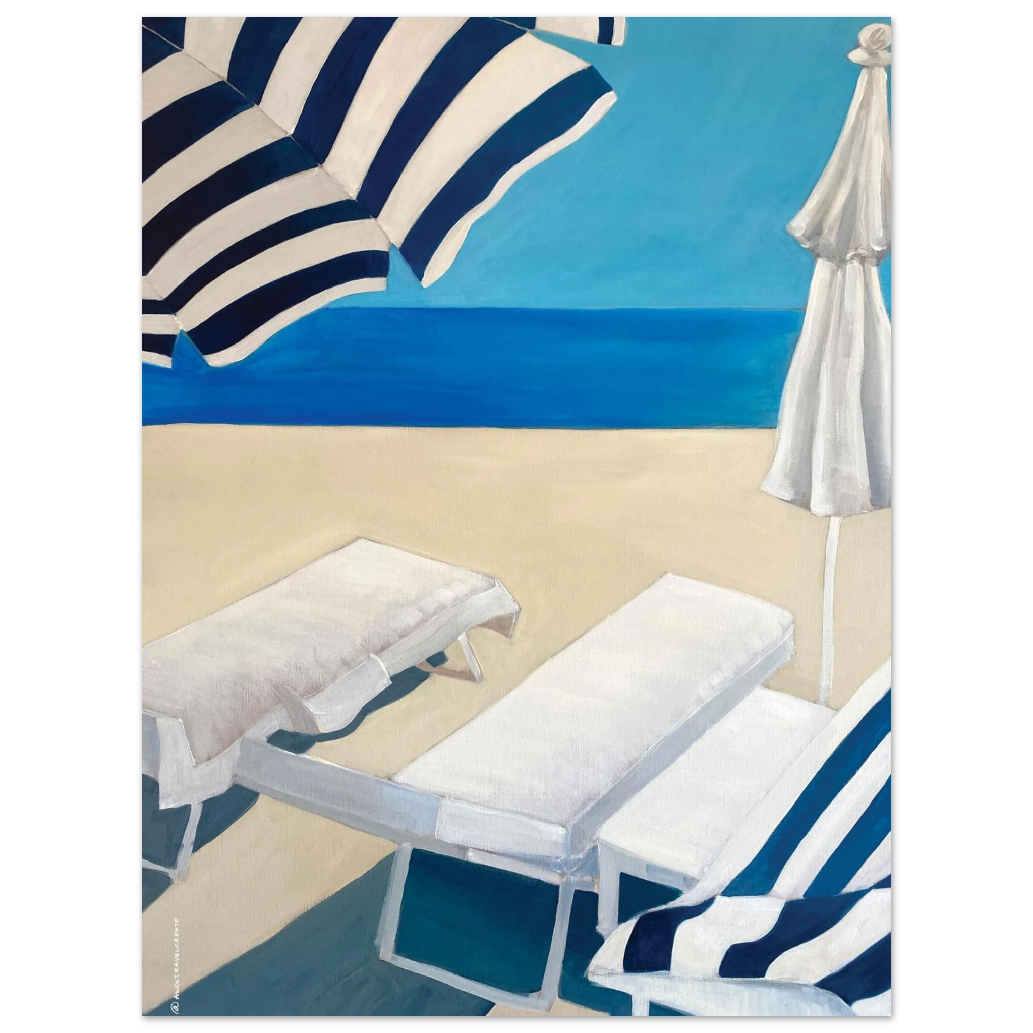 This blue and white Mediterranean beach landscape is part of a two part poster series inspired by a seemingly perfect summer day by the seaside on the Med. This beach wall art print features a nautical summer colour palette, with crisp white sun umbrellas, strong directional sunlight and shadows enhancing the navy blue and white marinière stripes and relaxing beach beds of a lux beach club on the Med. This escapist travel art print was orignally hand painted using oils and acrylic paint on canvas, and depicts and all the signifiers of escapist vacation relaxation on the French Riviera seaside: sunshine, a cloudless azure blue sky, luxury, comfort and carefree vibes. A perfect beach inspired wall decor print that will infuse your walls with French Riviera, Italian Riviera and a Mediterranean aesthetic all year long.