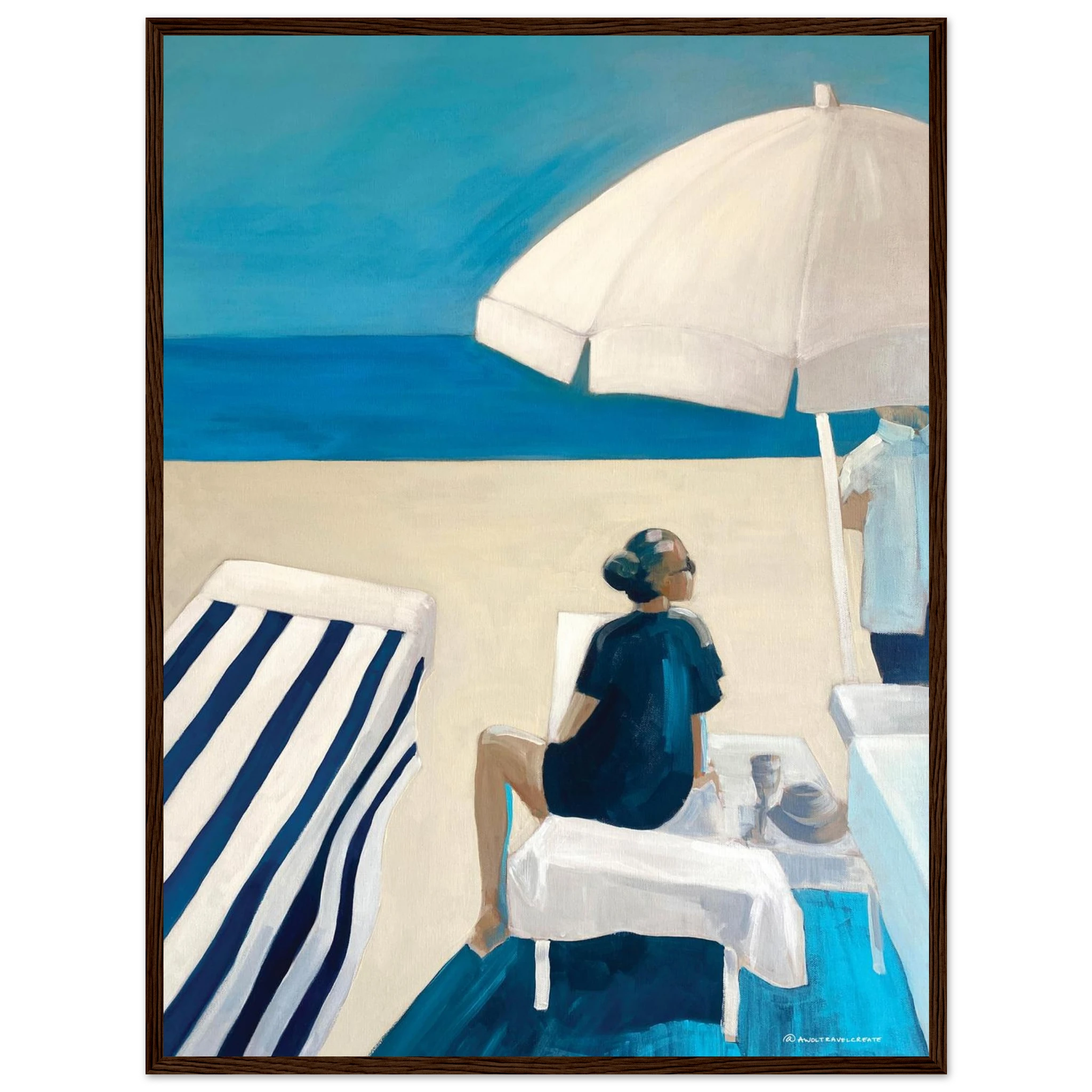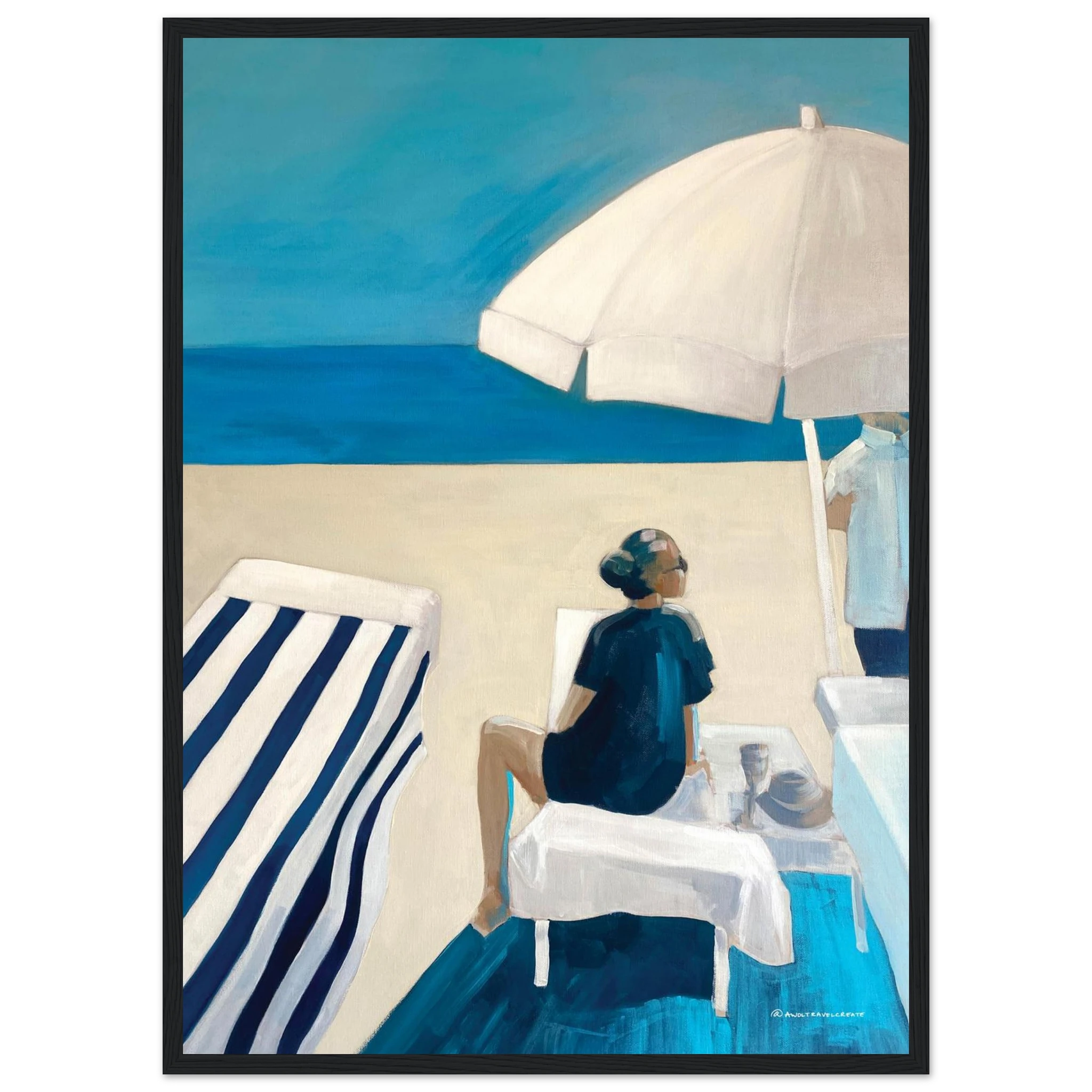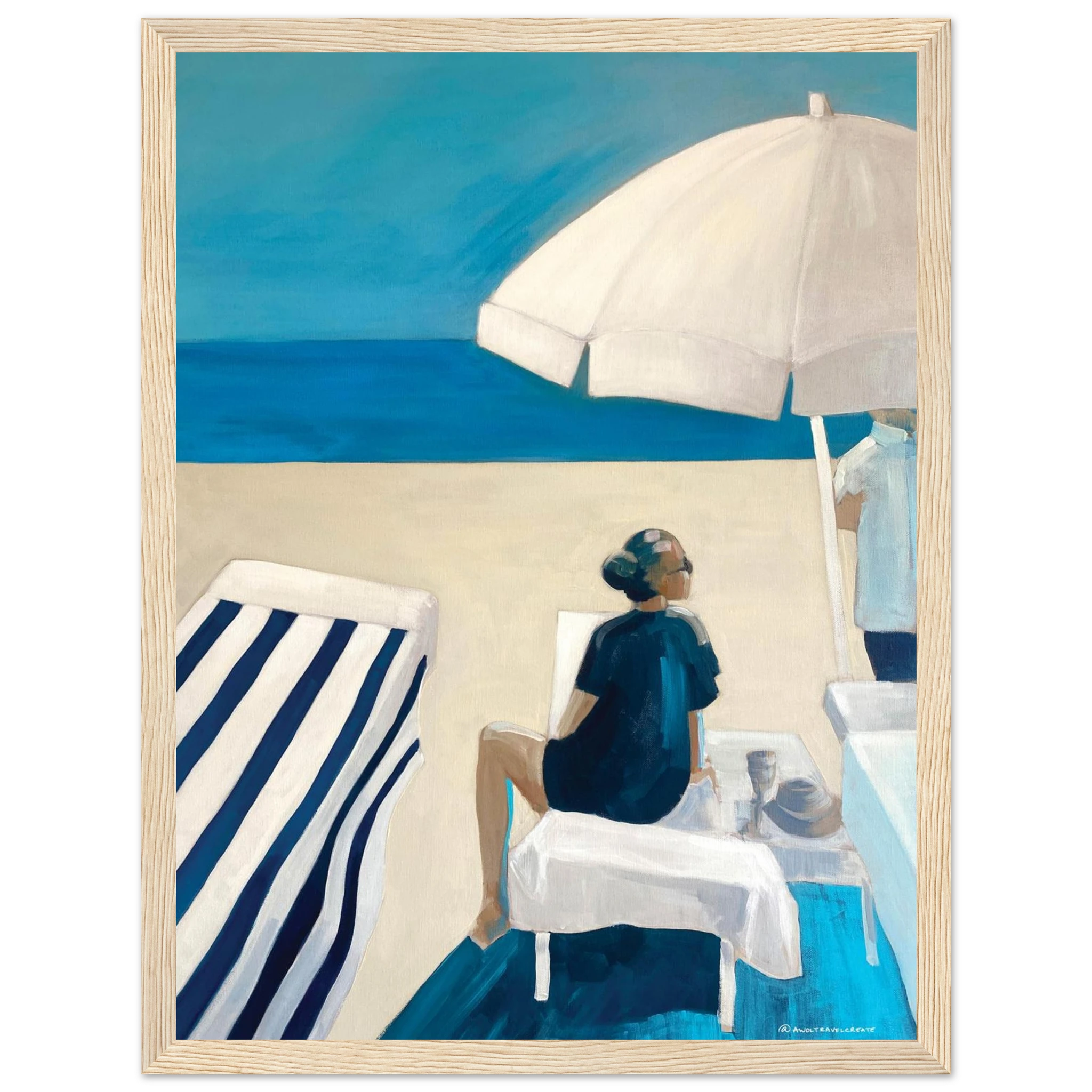 Inspired by the luxurious coastal beauty of the French Riviera, from Cannes and St. Tropez to Nice and Monaco—(though it could just as easily evoke Capri, the Amalfi Coast, or the Italian Riviera)—this fine art print reflects the elegance, beauty and escapist vibe of European summer living by the sea. This hand painted blue and white framed art print offers a sun-soaked escape to the Mediterranean; perfect on its own or paired as part of a two-piece series, this wooden framed wall art captures the essence of an idyllic summer day relaxing on the beach with a glass of rosé. With bold marinière beach stripes and a nautical palette of navy, turquoise, cobalt, sand tones and crisp whites, this painting blends graphic shapes and bold nautical patterns with the relaxed ambiance of an upscale beach club. A chic woman reclines under a sun umbrella, her feet buried in warm sand as she chats with a man hidden just beyond view. A beach hat and a glass of wine nearby hint at leisure and a touch of daytime leisure in quintessential French style. Originally hand-painted in oils and acrylics on canvas, this framed art print showcases the timeless hallmarks of Riviera style—sunlight, serenity, and elegant, timeless beauty, and will infuse your wall decor with perpetual sunshine all year round. This ready-to-hang framed wall art brings the crisp sunlight of Mediterranean summers into any space, making it a perfect choice for adding warmth, elegance, and year-round coastal vibes to your home decor.