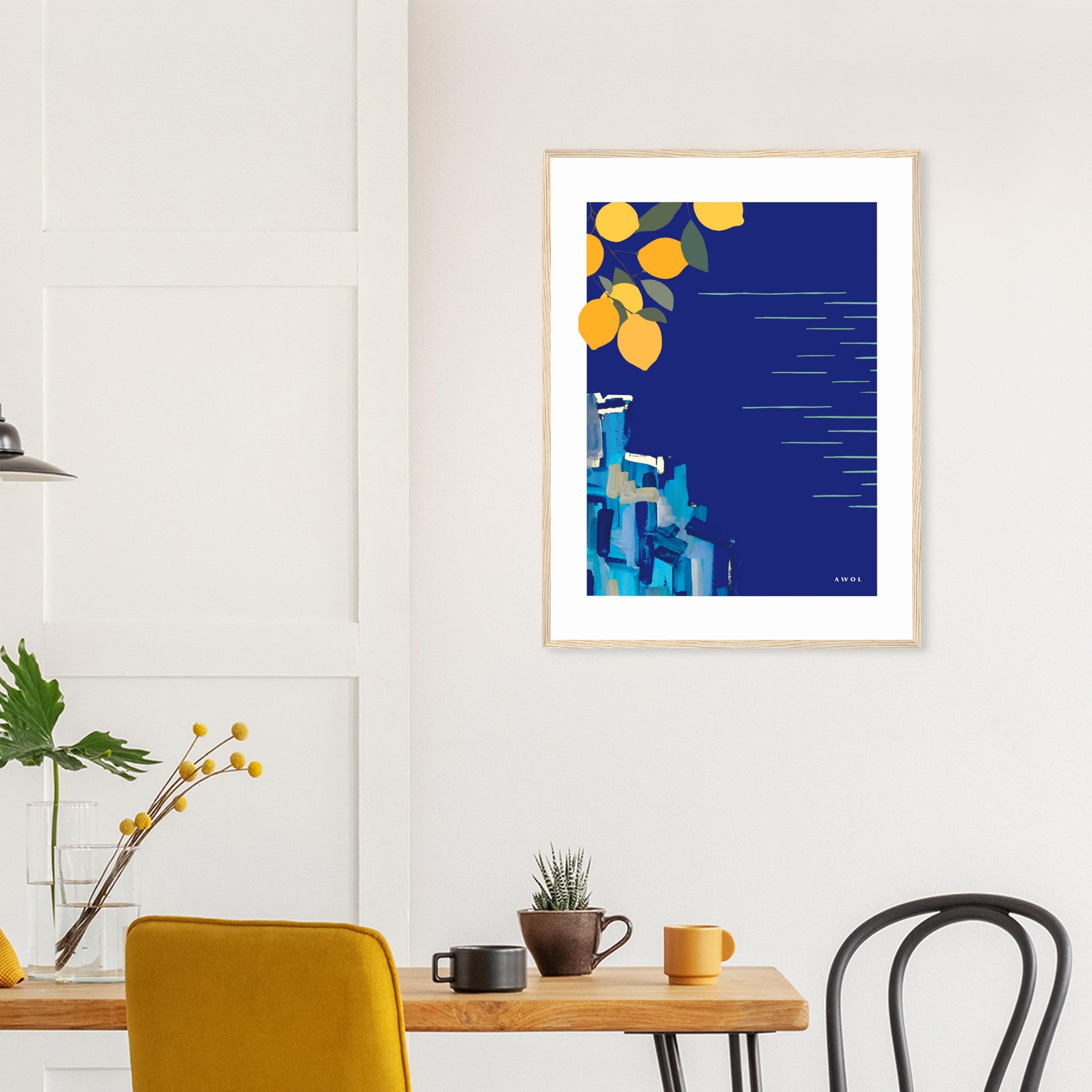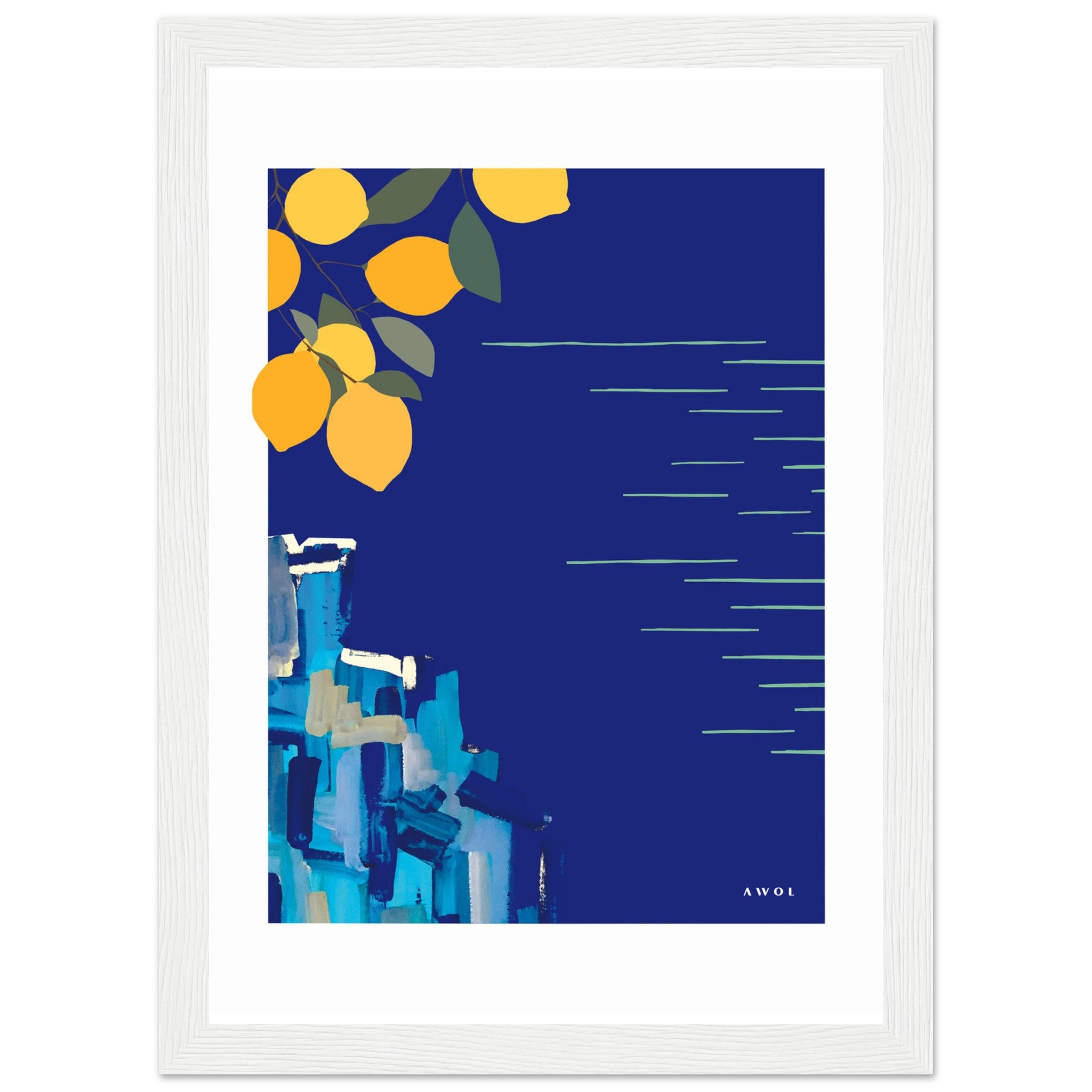 This blue Italy wall art with lemons is a framed art print inspired by beautiful coastal destinations along the Mediterranean sea: from The French Riviera to Liguria, the Italian Riviera and down to Italy’s Amalfi coast exists some of the most incredible seaside scenery and sea views in the world. In this framed print, happy yellow lemon groves grow above postcard perfect cliffs peppered with colourful little towns overlooking endless horizons where blue skies meet the blue sea. With this colourful blue and yellow poster print, I wanted to capture the beauty of these famous Mediterranean landscapes in a travel poster that evokes happy vacation vibes, brings sunshine, blue seas and a fresh colour pop to any home decor in a modern aesthetic and a contemporary yet timeless art style.