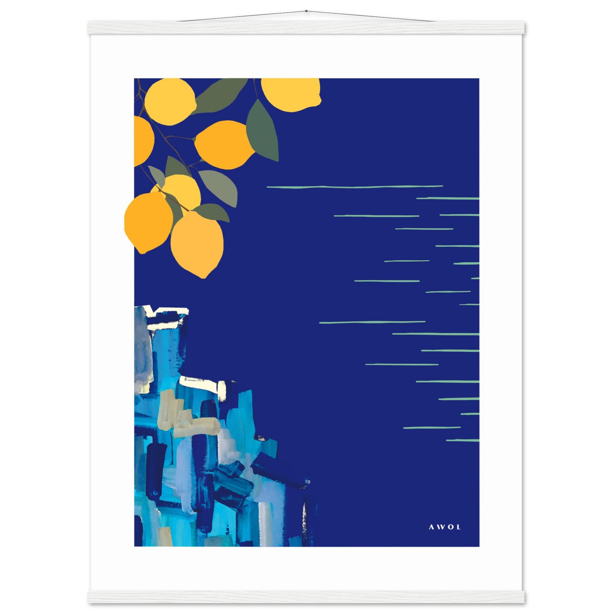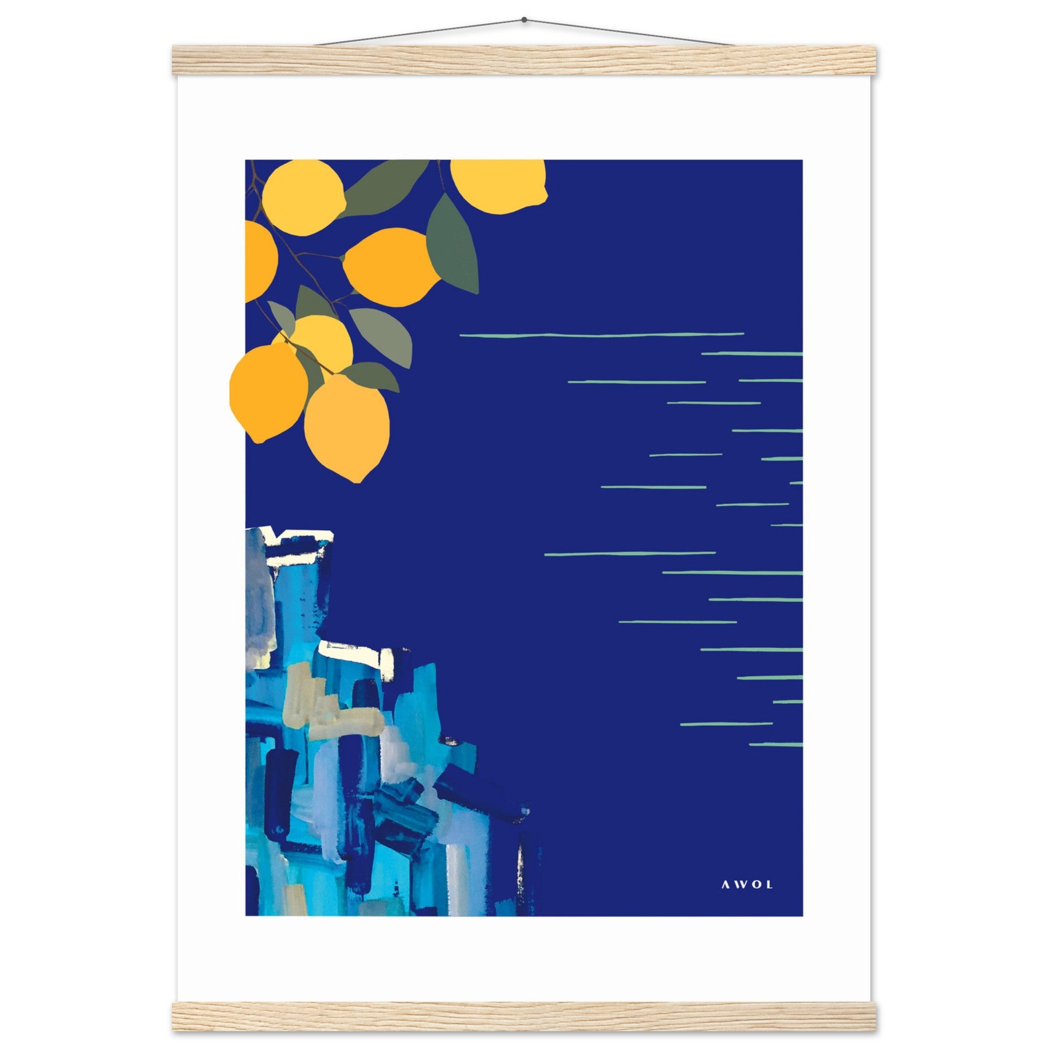 This Mediterranean poster print with lemons is a colourful travel artwork in bright blue and vivid yellows, inspired by beautiful coastal destinations along the Mediterranean sea: from The South of France to Liguria, the Italian Riviera and down to Italy’s Amalfi coast exists some of the most spectacular seaside scenery and sea views in the world. In this Italy art print, happy yellow lemon groves grow above postcard perfect cliffs peppered with colourful little towns overlooking endless horizons, where blue skies meet the blue sea. With this abstract blue and yellow travel poster, I wanted to capture the beauty of these famous Mediterranean landscapes in a colourful wall art that evokes happy vacation vibes, brings sunshine, blue seas and a fresh colour pop to any home decor in a modern yet timeless art style.