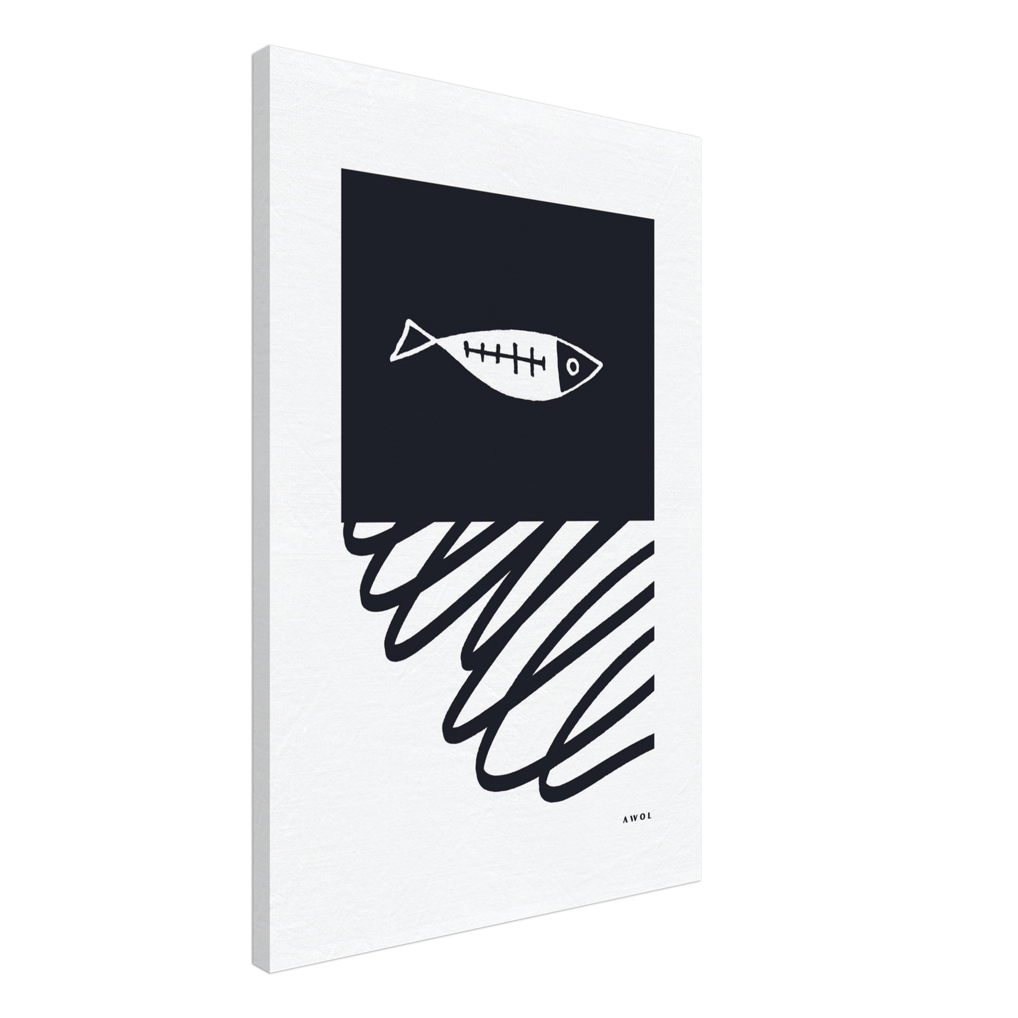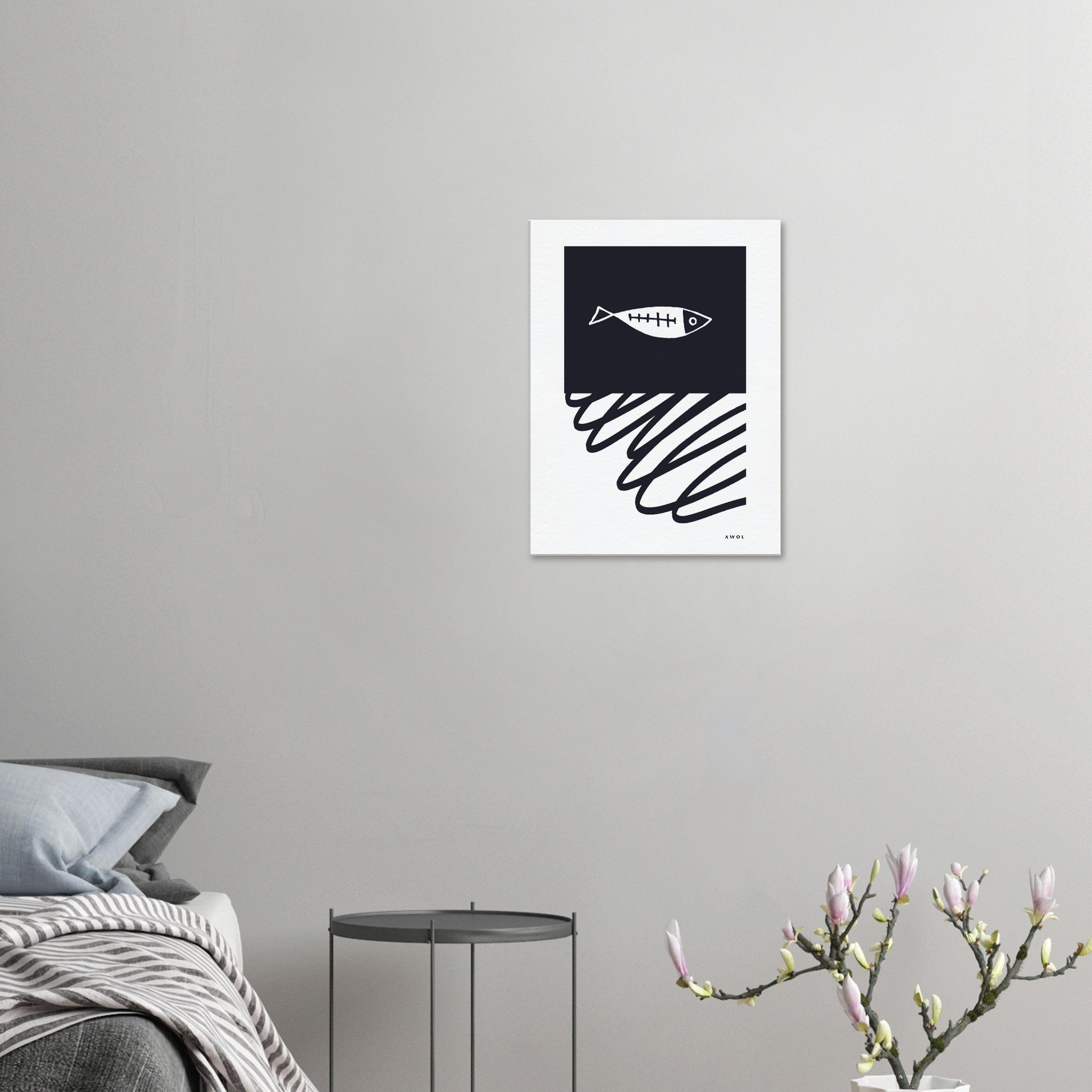This minimalist, black and white canvas wall art illustrates a fish swimming above an abstract line artwork made of a graphic, swirling line pattern. Blending a Scandinavian design style, minimalist lines and graphic shapes, this Nordic-inspired fish illustration evokes speed, movement and the force of an abstract sea current. Hand-drawn using a continuous line illustration style, the Nordic design aesthetic comes across with this bold, black and white art print. The black and white canvas print adds a modern wall accent art and timeless elegance to any space, making it a fun and bold addition to your wall decor. Whether you’re a fishing person, you love the sea, or are someone seeking a touch of simple Scandinavian wall art for your home decor, this minimalist art print will add a unique fusion of graphic simplicity and originality to your living room, kitchen decor, restaurant art collection, or office space.