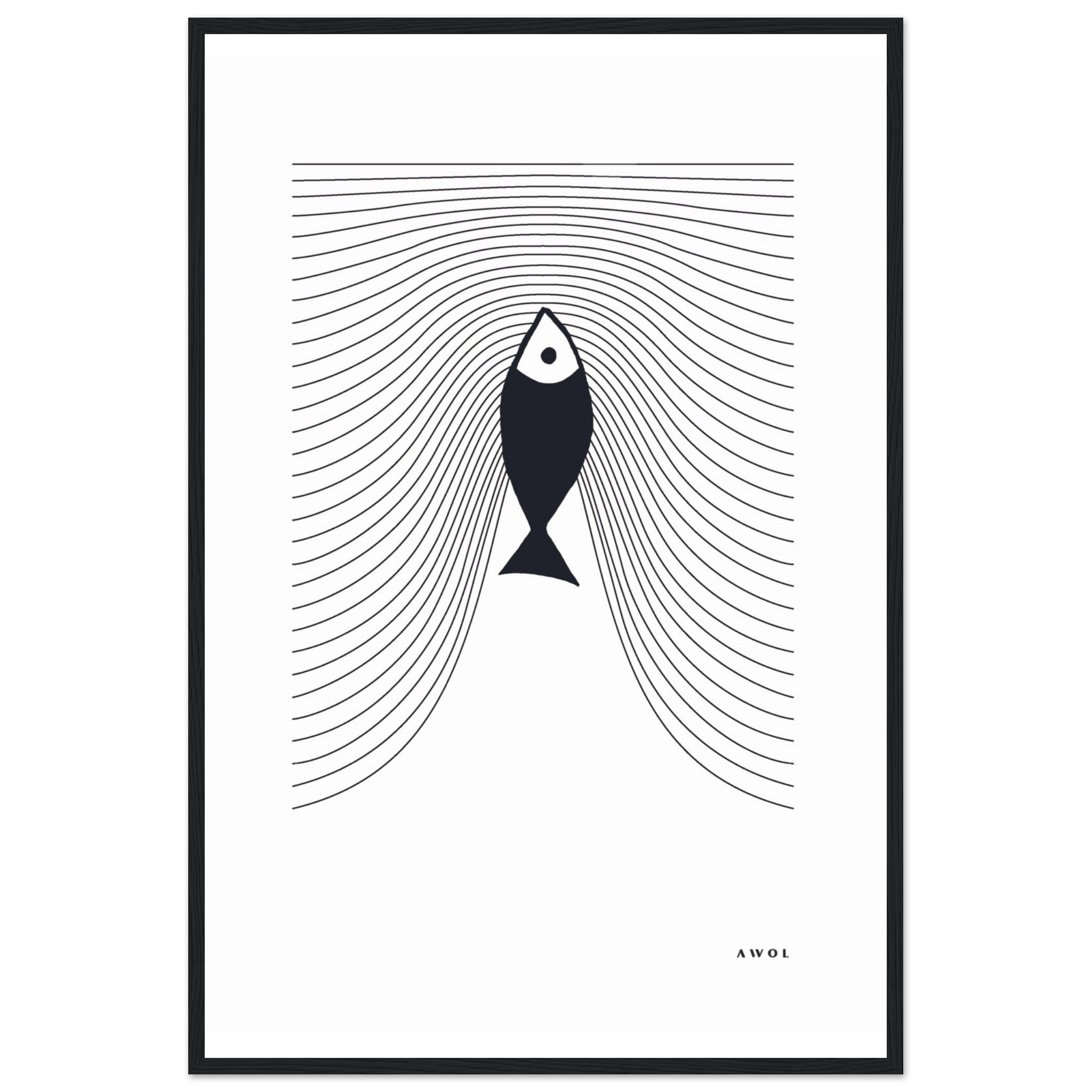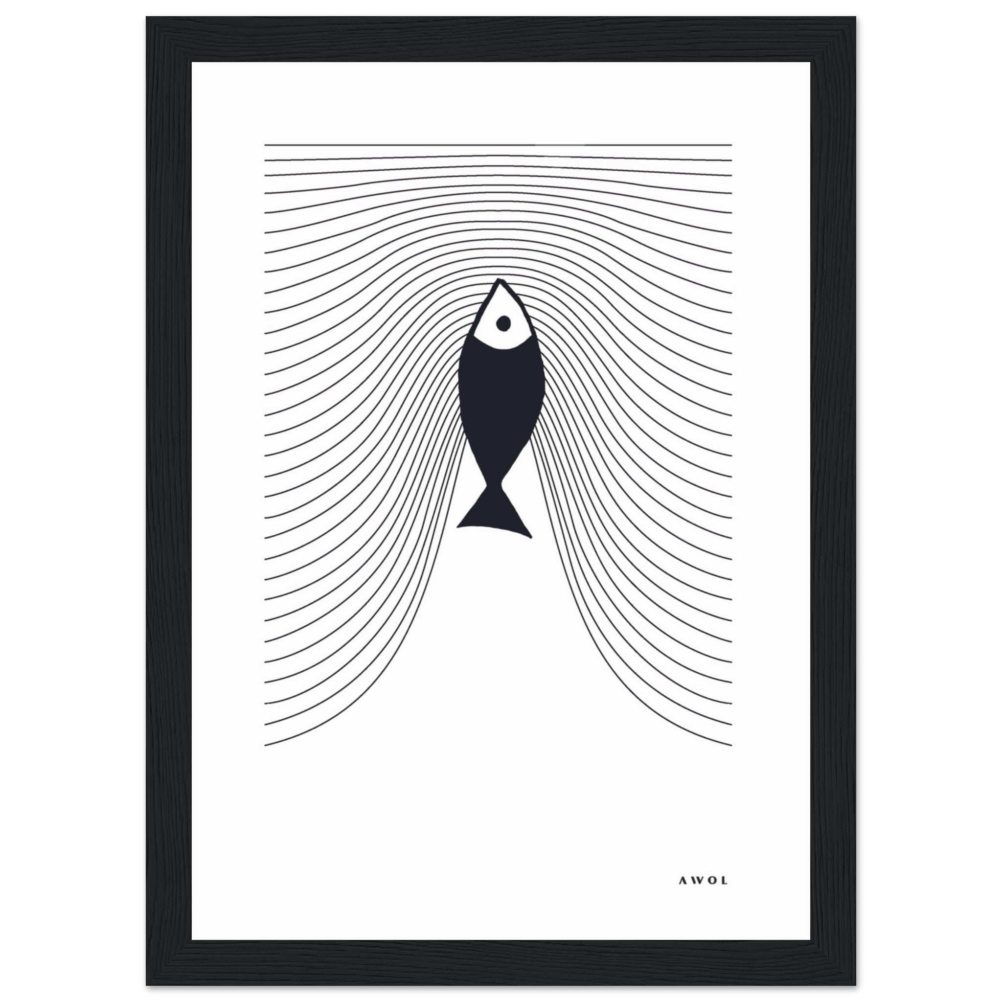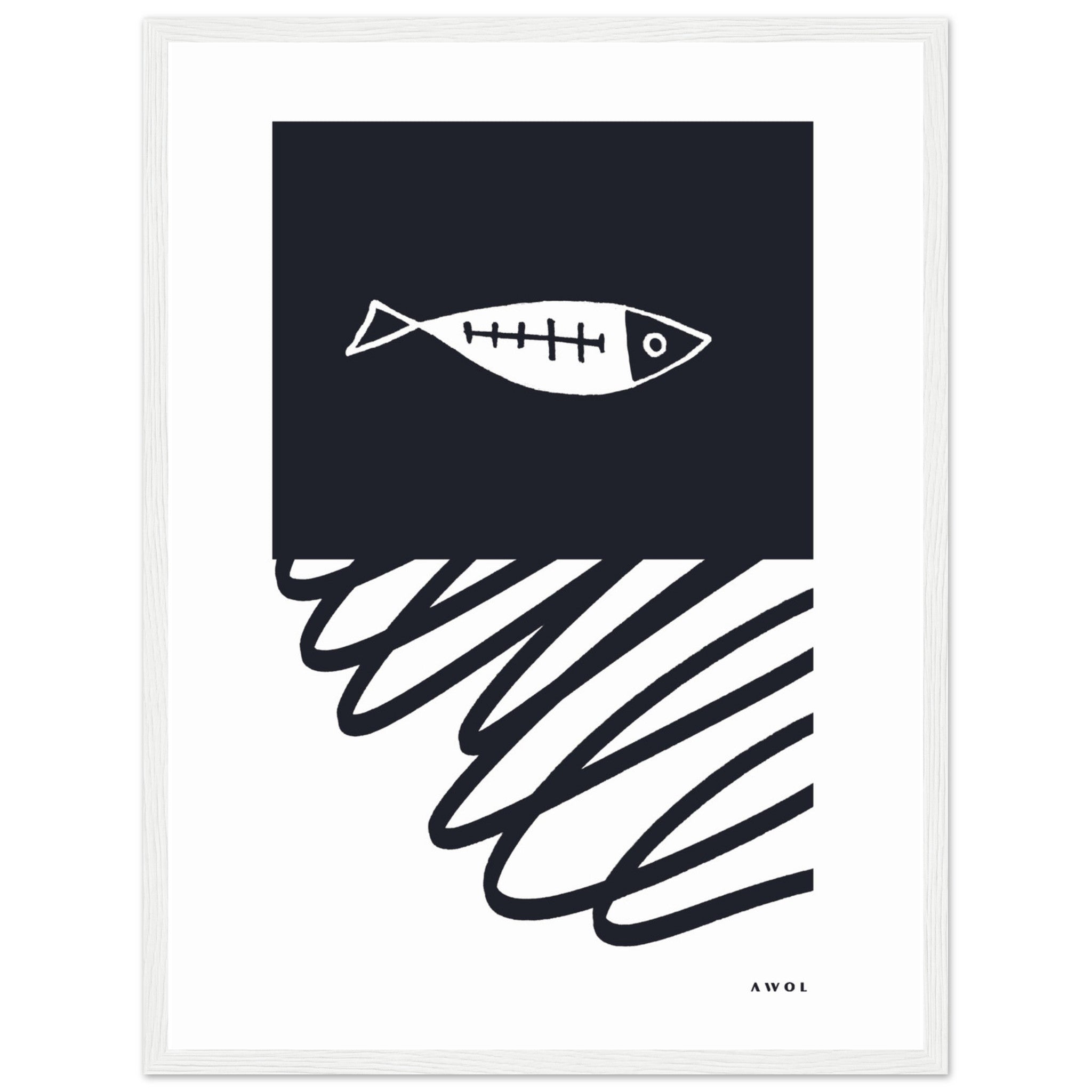 This monochrome wall art is a black and white abstract art print with a graphic sardine swimming against a water abstraction made of organic thin line pattern evoking waves in a river or the sea. This Scandinavian framed poster juxtaposes simple graphic shapes and an abstract line pattern in a Nordic design wall art print. The Scandinavian style merges into a zen aesthetic into an abstract wall art print with a minimalist illustration. The black and white colour palette adds a modern aesthetic and timeless elegance to any wall decor, making it a fun and contemporary addition to your modern wall art collection. Whether you’re into fishing, you love the sea, or are looking for a fish art print to gift someone seeking a touch of Scandinavian wall art, this Nordic art print will add a bold design statement and originality to your home decor. Be sure not to miss the other sardine art prints in this three part black and white art series.