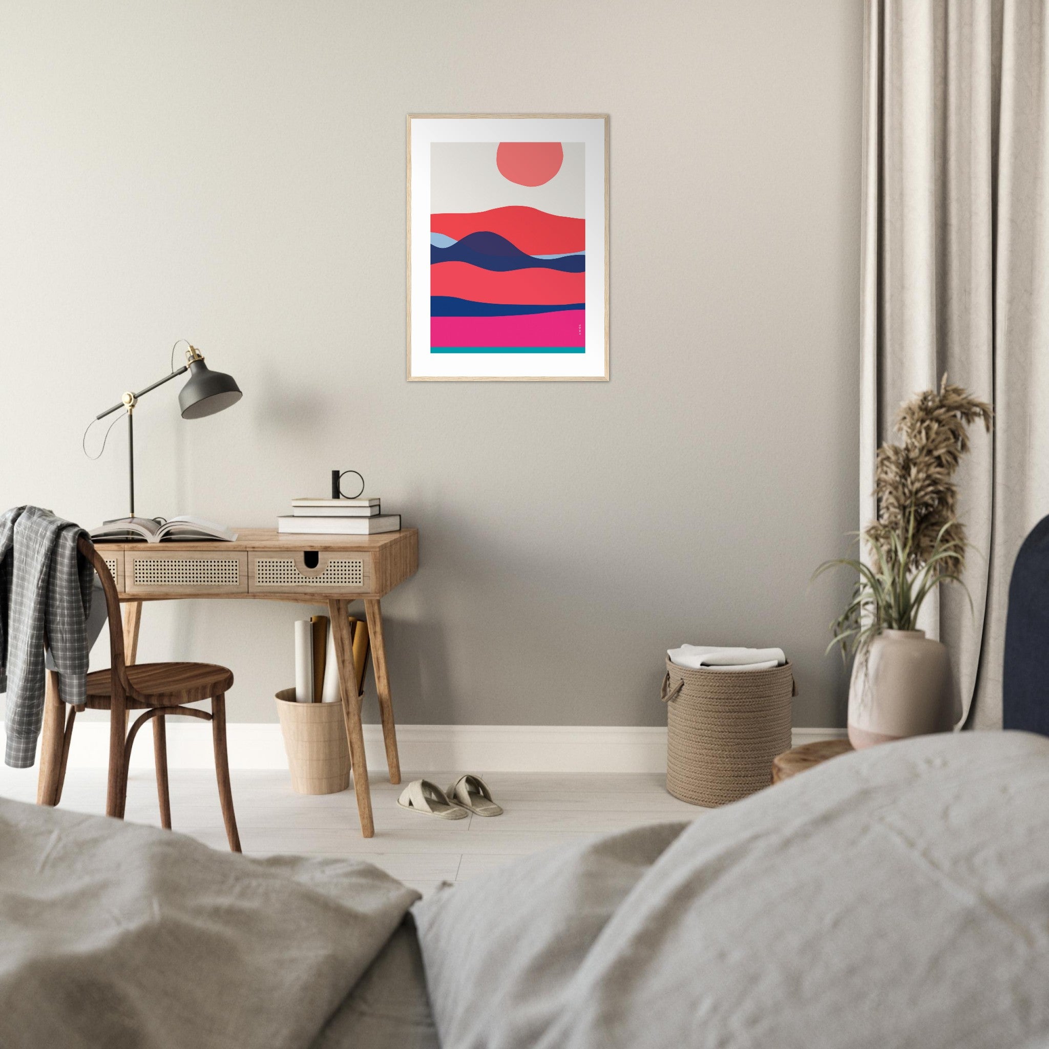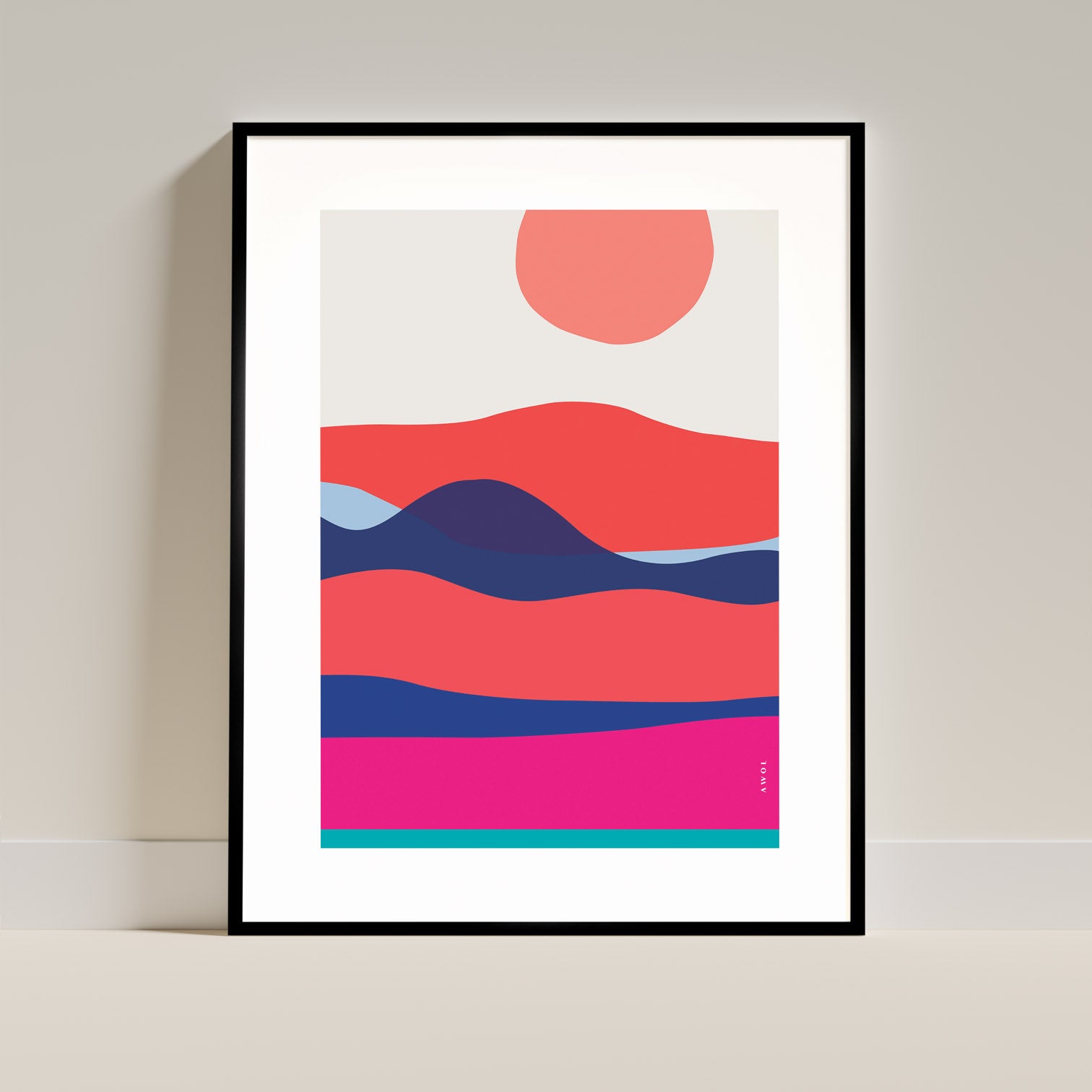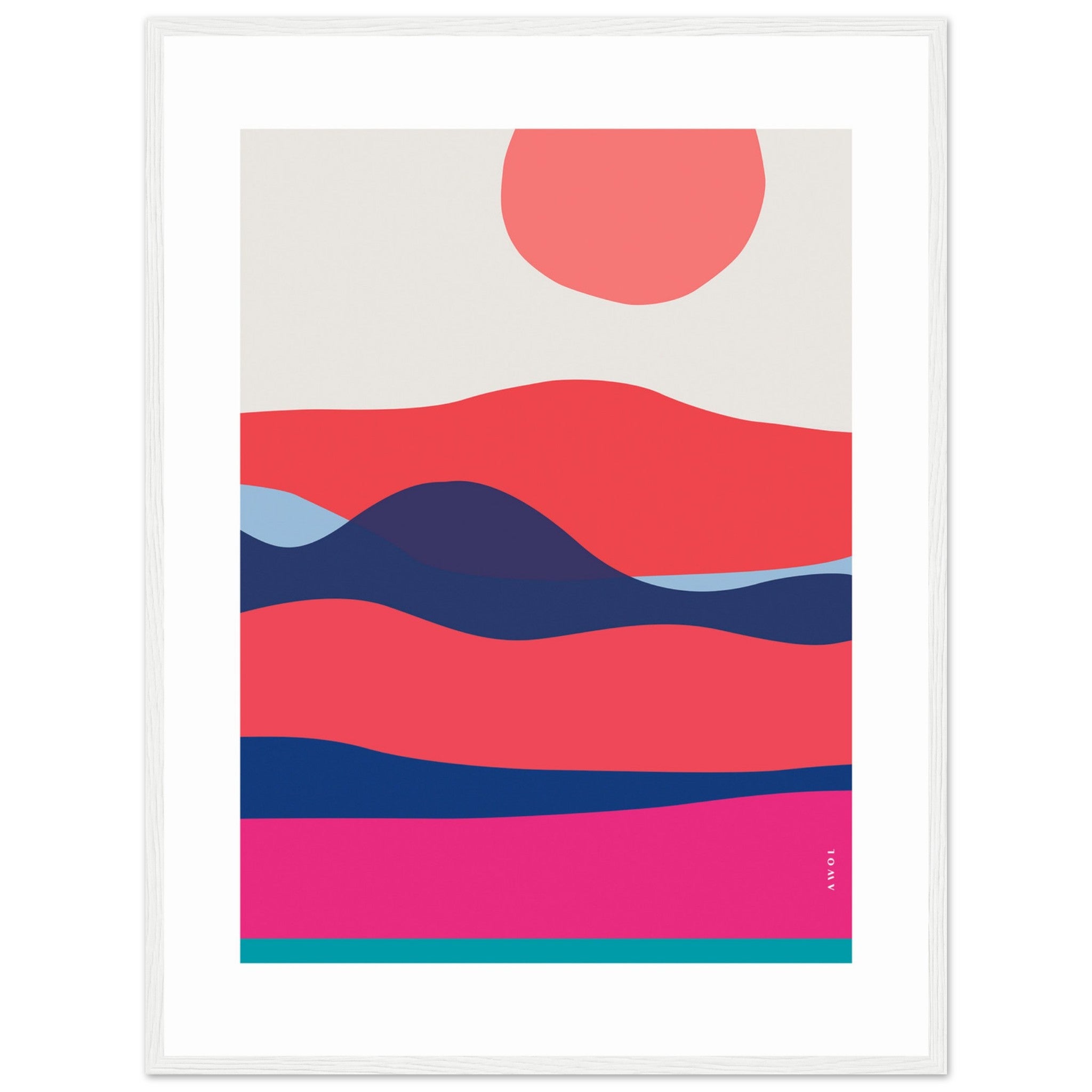 This framed abstract wall art print with ocean waves at sunrise is a colourful wall art print conveying the beauty of morning sunrises and evening sunsets witnessed while at sea, sailing in the midst of a vast expanse of waves, endless horizons and oceans. This graphic wall decor is a minimalist sea landscape artwork with bright orange, pink, red, dark blue and turquoise tones in a bold and abstract pattern with organic, wavy lines and a coral sun. Inspired by nautical landscapes and travel adventures sailing at sea, this framed print transports you to peaceful moments of dawn over a soothing, wavy sea. This colourful sea art print is a visual celebration of tranquility and natural beauty. The organic design and contemporary art style of this poster print captures the essence of the ever-changing waves and the radiant hues that paint the sky during these magical maritime moments. The relaxing modern art aesthetic of this wall decor print with a pine wood frame makes it a versatile artwork for any home decor style, bringing the essence of nautical landscapes and ocean sailing into your home.